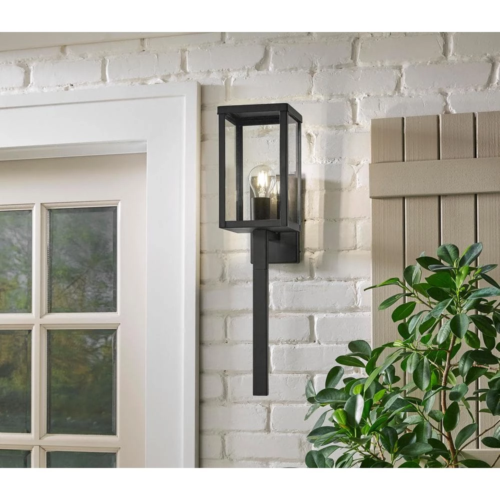 Charming old-world style meets clean modern lines with the 24 in. 1-Light Outdoor/Indoor Wall Sconce. The warm bronze and removable tail complete a rustic vintage design while the straight lines and clear glass panes add the modern touch. While this light will look amazing flanking your entryway, you can also add it inside your home for a trendy sconce next to your bed. Simple and inviting, this wall light works well anywhere you place it.