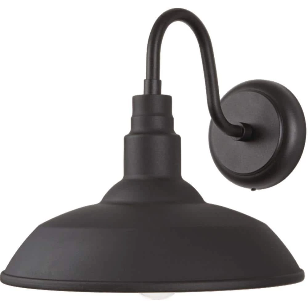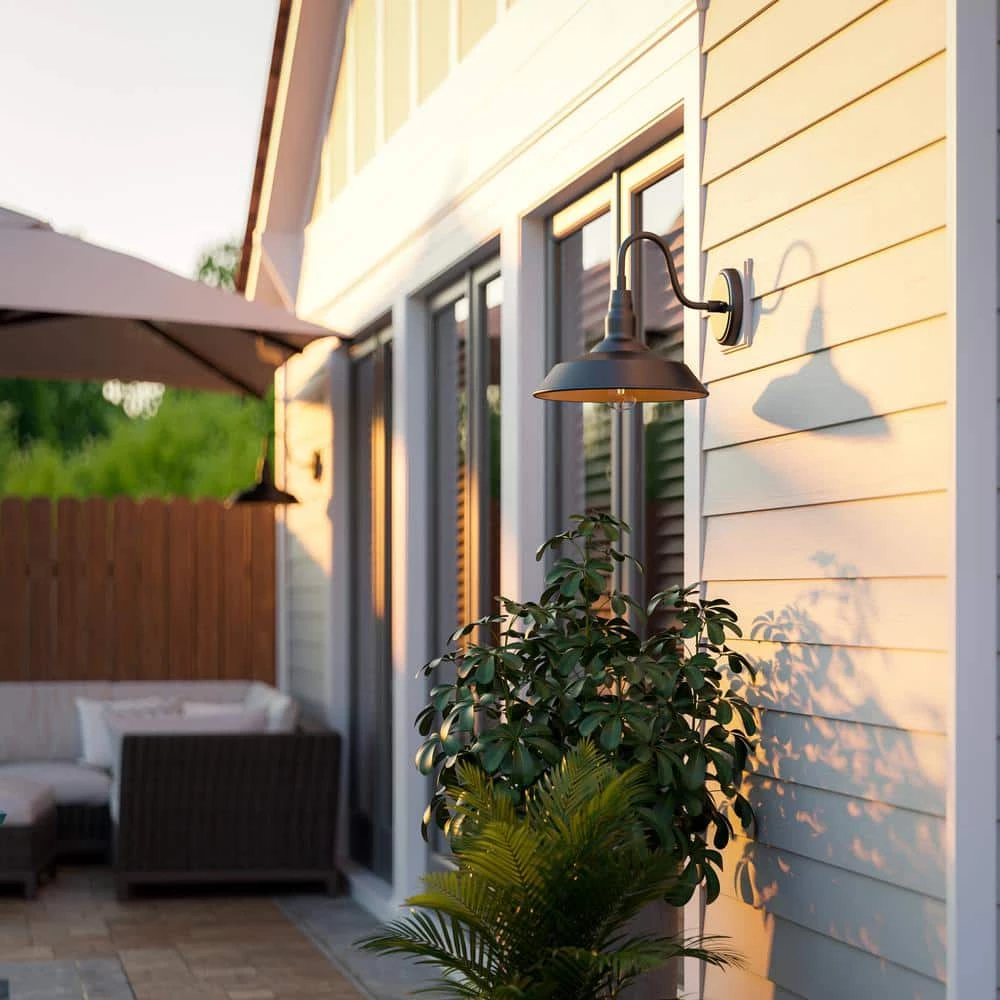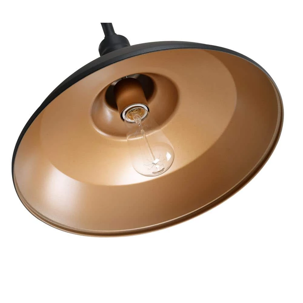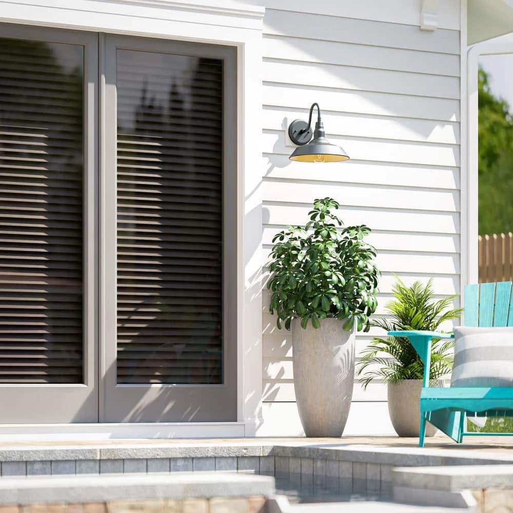 Bring your casual and cozy vintage industrial design style to the great outdoors with this small 1 light outdoor barn light. With its durable black finished aluminum with gold interior shade, this 1 light wall sconce exudes plenty of country farmhouse charm with its wide barn style shade, allowing for plenty of downlighting to illuminate your home address, doorway, entryway, garage, outdoor living room, porch, or outdoor paths. For even more vintage charm, use a compatible Edison bulb to take advantage of the exposed bulb profile of the farmhouse shade. This hardwired wall sconce may also be used indoors.