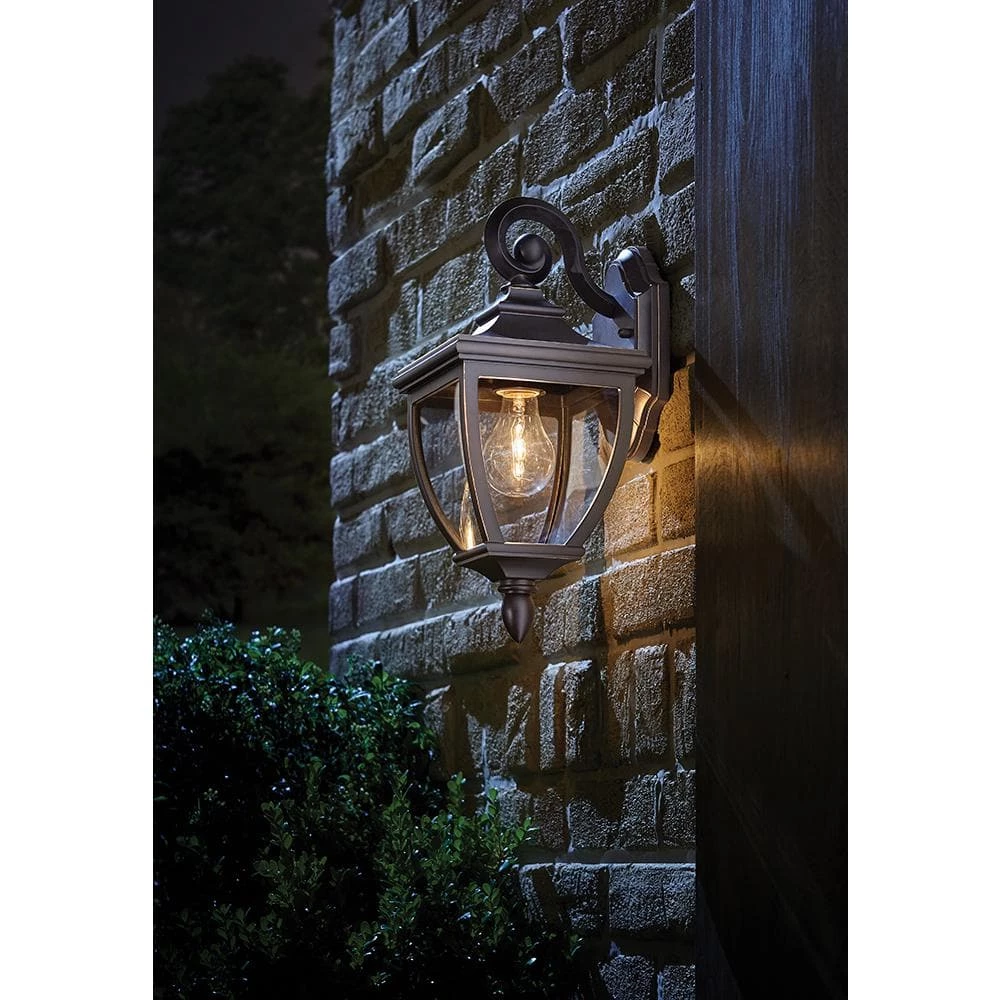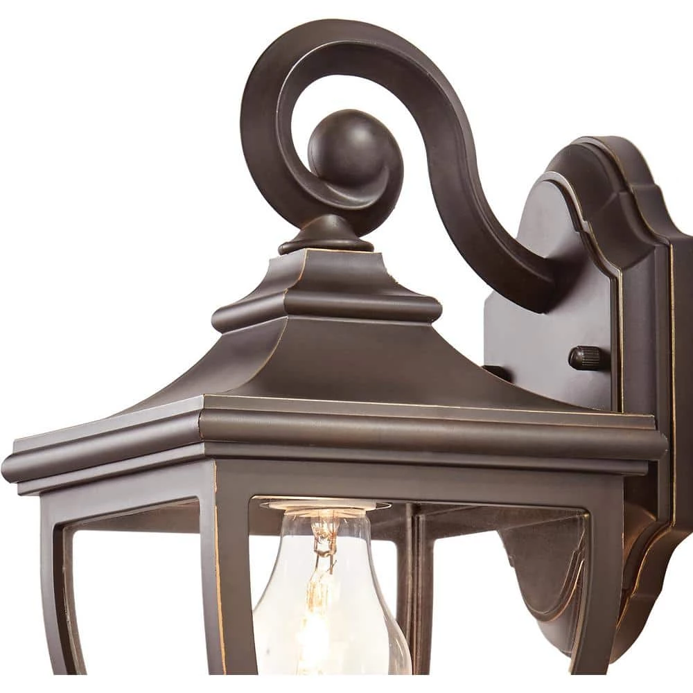 A classic design for this Home Decorators Collection outdoor wall mount lantern will bring an elegant look for the exterior of you home. The unique arm design of this fixture combines classic to transitional style. Finished in an Oil Rubbed Bronze accented with Clear Glass is a timeless statement. Uses (1) E26 bulb up to 60-Watt or CFL or LED equivalent (sold separately).