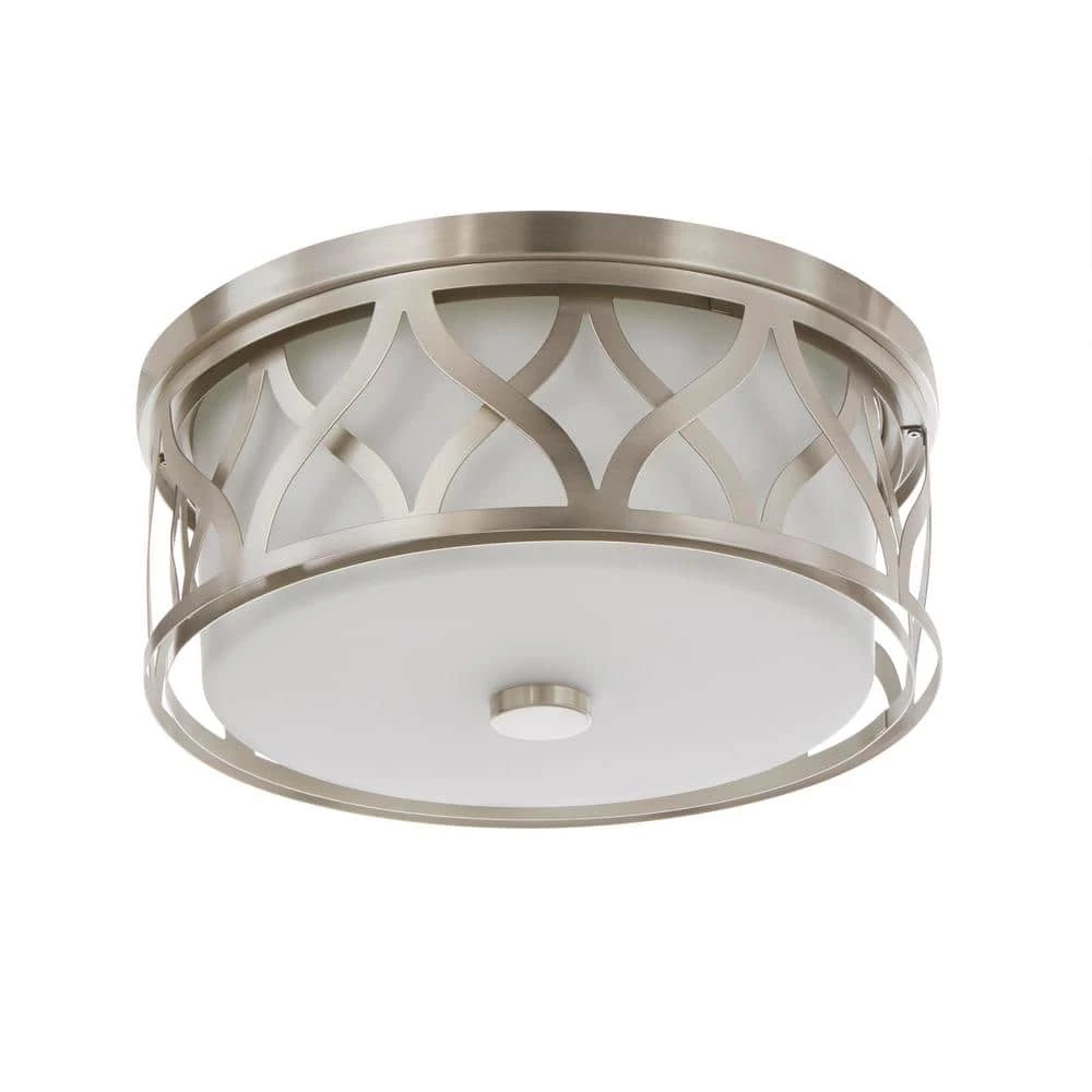 This 3-Light Flush mount features an interesting geometric pattern that has a graphic feel without overpowering the space. With It is Brushed Nickel finished frame and Etched White glass shade, the light gently diffuses with a touch of class. This flush mount is an elegant addition sure to add a little glitz to any room.