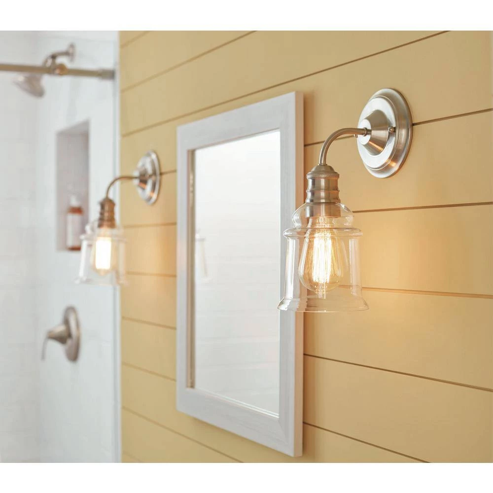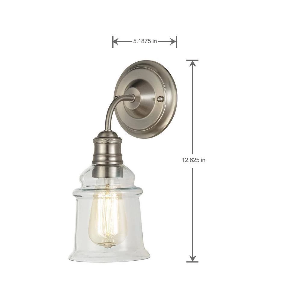 A 1-Light vanity sconce that adds visual interest to any lighting scheme. Clear glass shade is elevated over a Brushed Nickel back plate. Simple in design, yet bold in the details.