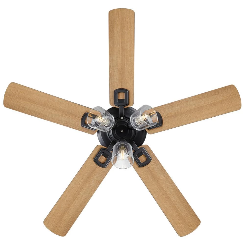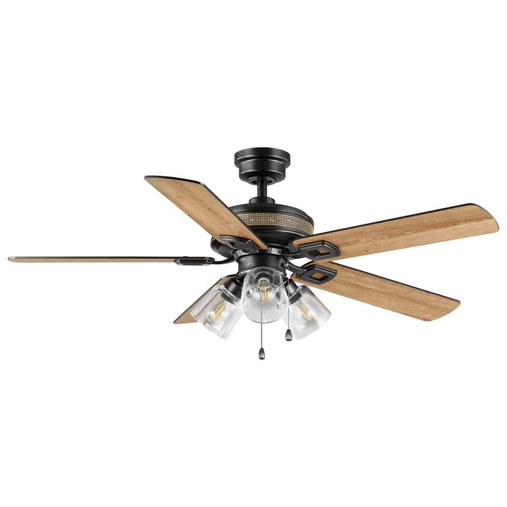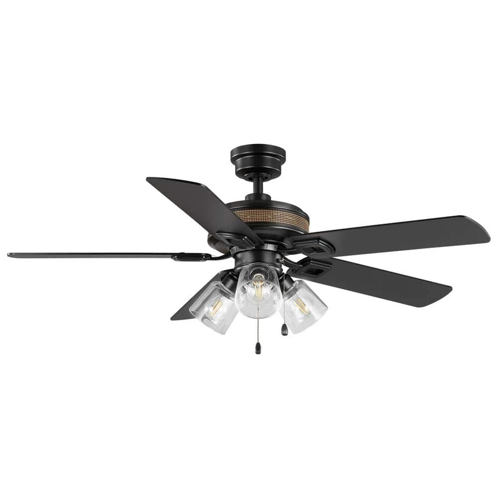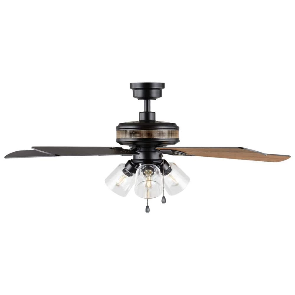 This transitional style 52 in. Sederio ceiling fan from Home Decorators Collection offers ample light output and quiet performance to enhance your indoor living spaces. The rich matte black finish is paired with 5 reversible blades in matte black and natural oak finishes to easily blend with your existing decor. The 3-light light kit includes clear glass shades and uses three 6.5-Watt standard base LED bulbs for ample light output. The fan’s powerful and quiet 3-speed reversible motor is conveniently controlled via the included pull chains for year-round comfort. Installation is a breeze with QuickFit features like Accu-Arm blade arms, QuickConnect blades and a slide-on mounting bracket.