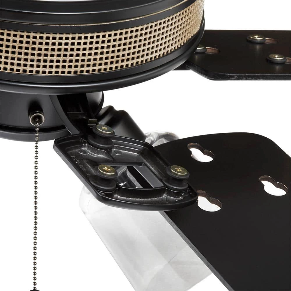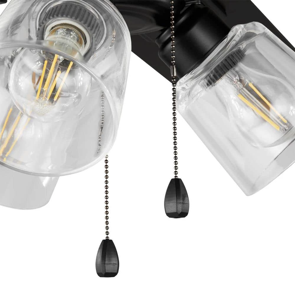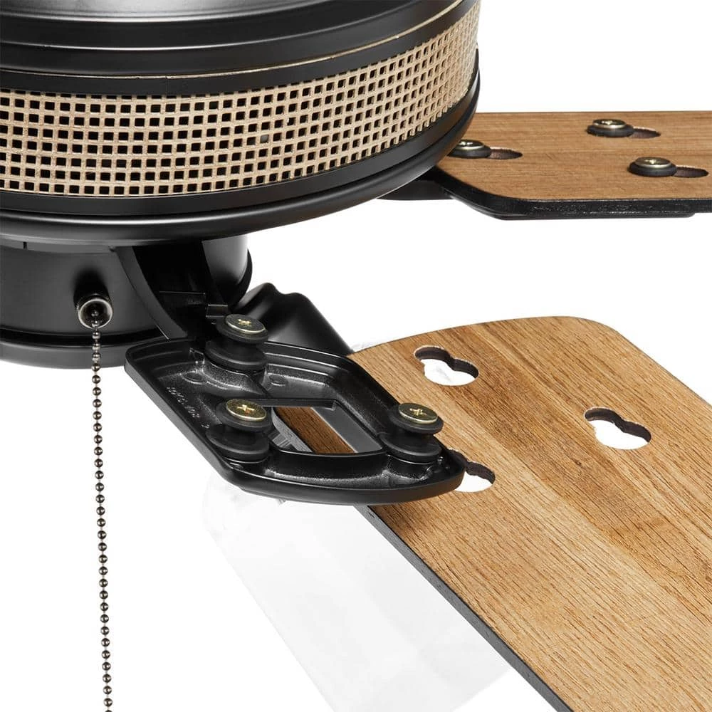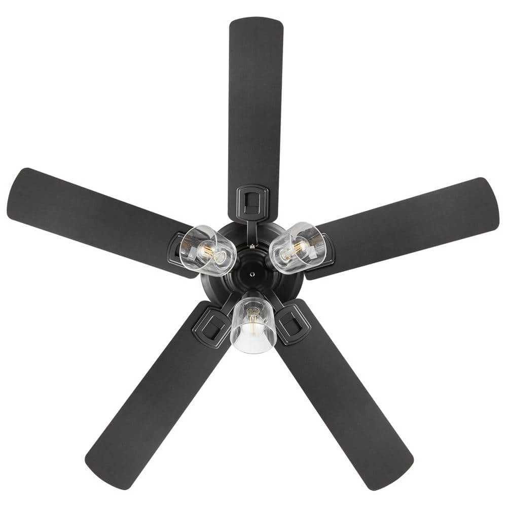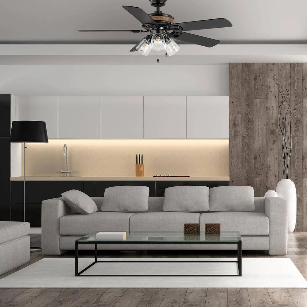 This transitional style 52 in. Sederio ceiling fan from Home Decorators Collection offers ample light output and quiet performance to enhance your indoor living spaces. The rich matte black finish is paired with 5 reversible blades in matte black and natural oak finishes to easily blend with your existing decor. The 3-light light kit includes clear glass shades and uses three 6.5-Watt standard base LED bulbs for ample light output. The fan’s powerful and quiet 3-speed reversible motor is conveniently controlled via the included pull chains for year-round comfort. Installation is a breeze with QuickFit features like Accu-Arm blade arms, QuickConnect blades and a slide-on mounting bracket.