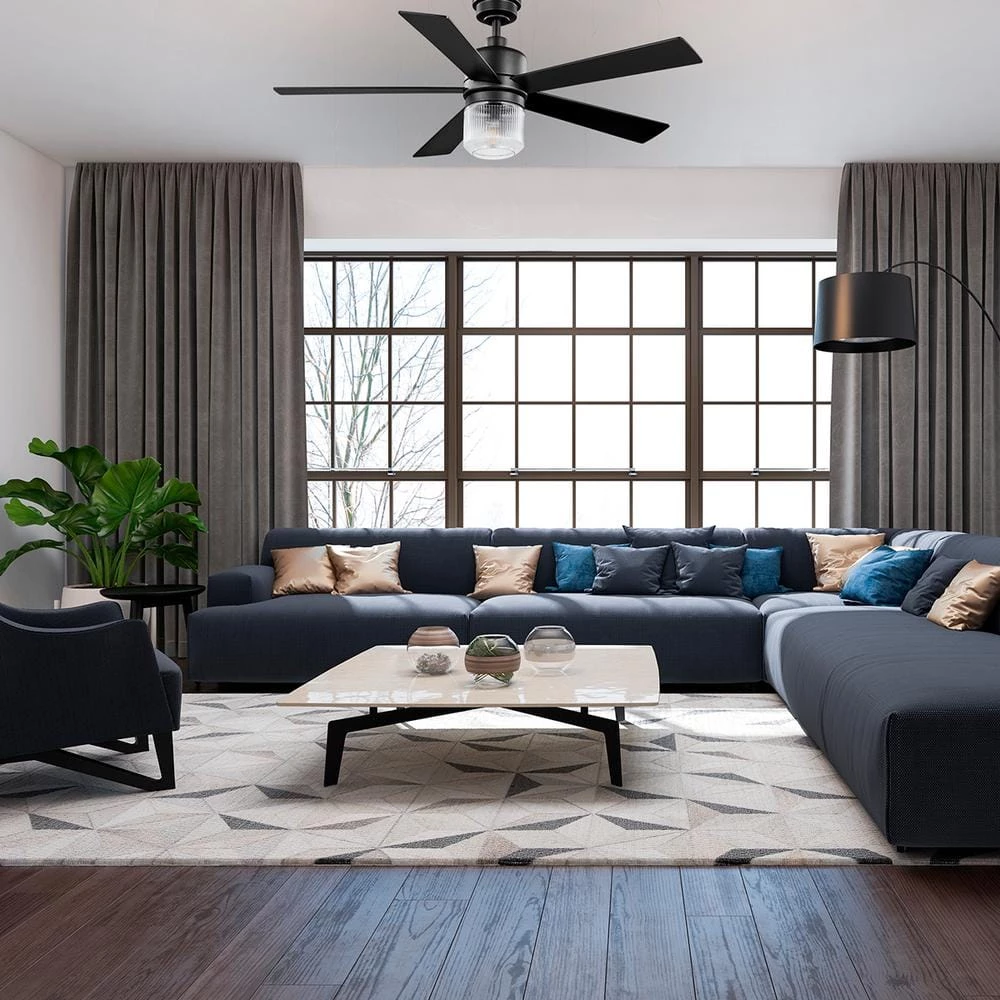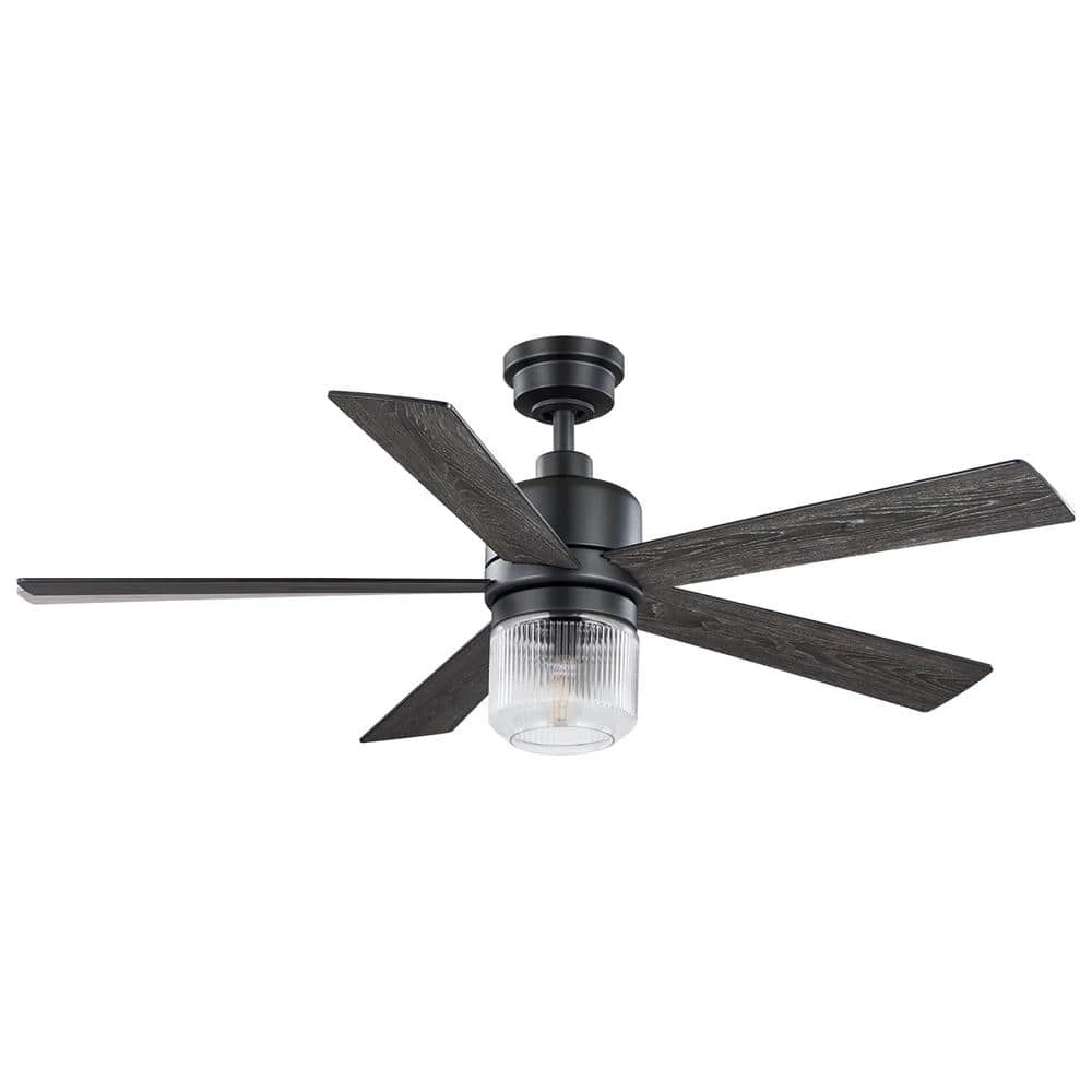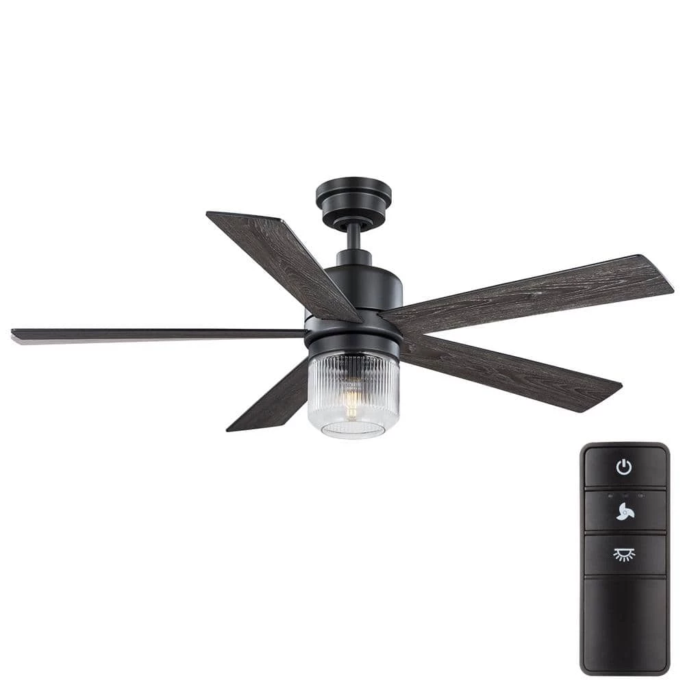 The 52 in Veterno ceiling fan from Home Decorators Collection is an artistic twist on traditional style. The sleek design is appointed with a stark matte black finish coupled with 5 reversible blades in cerused ash and black finishes to easily blend with your indoor decor. The beautiful clear textured glass light kit uses one 6.5-Watt LED bulb. A convenient hand-held remote control is included to easily control the fan’s 3 speeds and light (on/off/dimming). The powerful and quiet motor will provide ample airflow for your indoor large room living spaces (up to 324 sq. ft.).