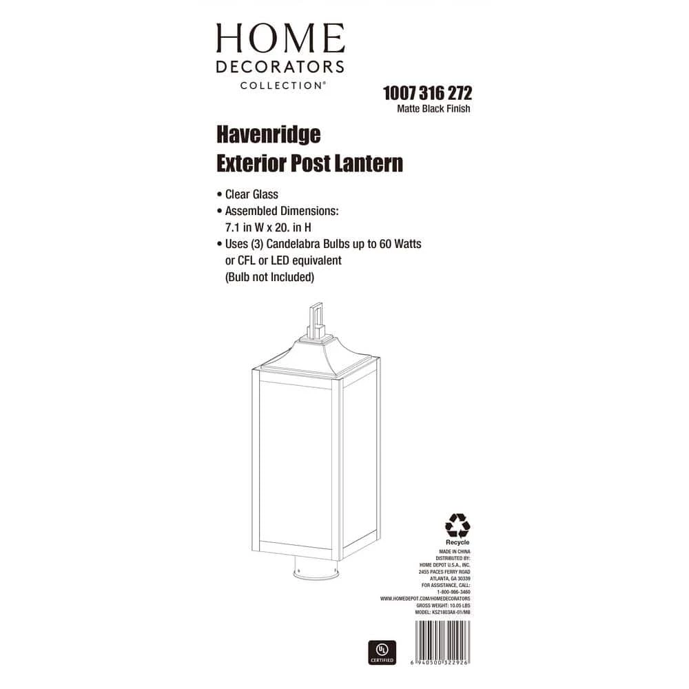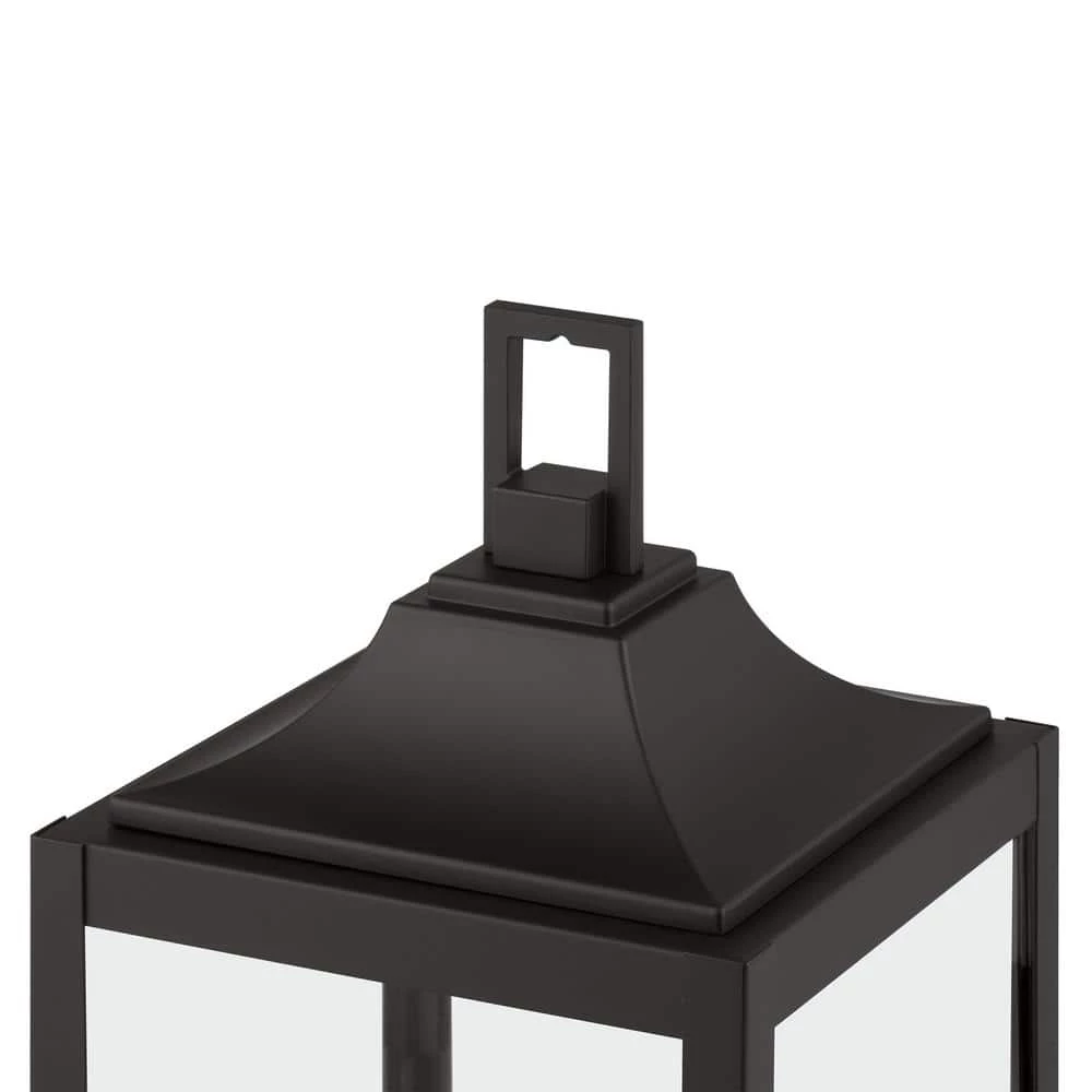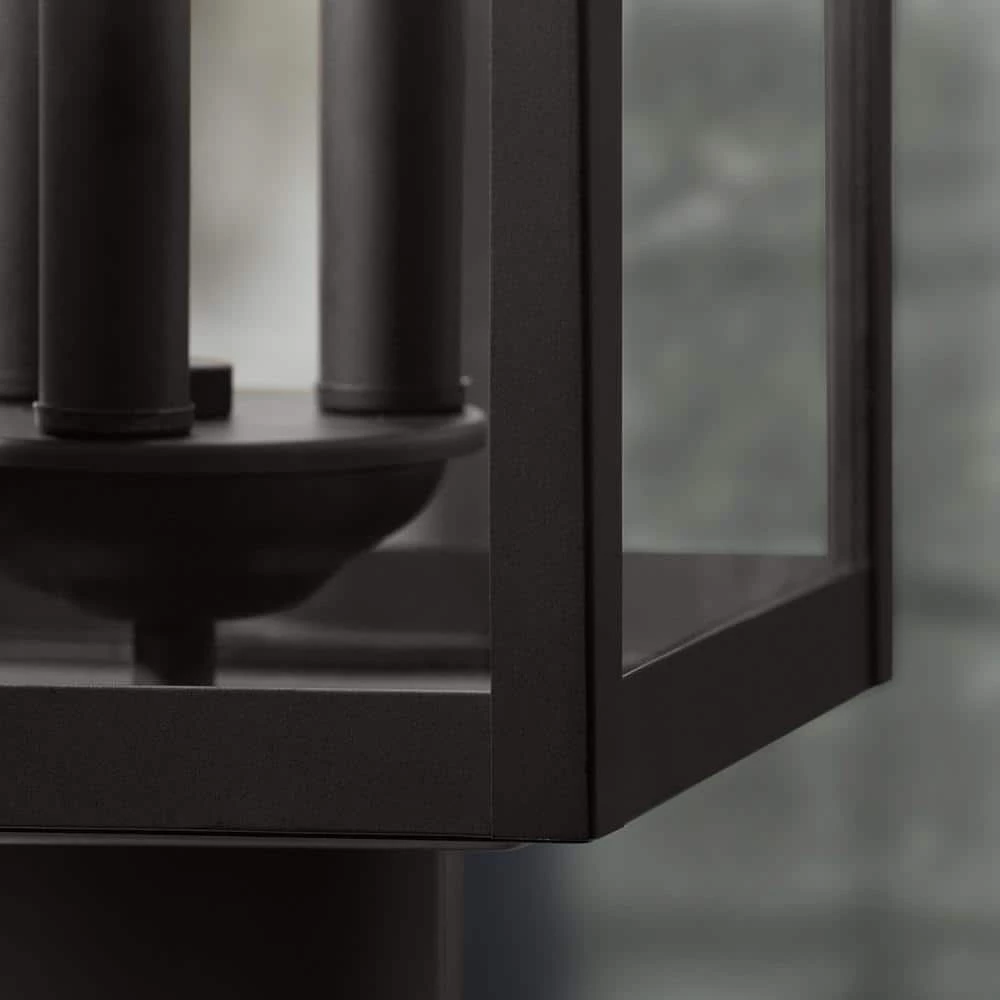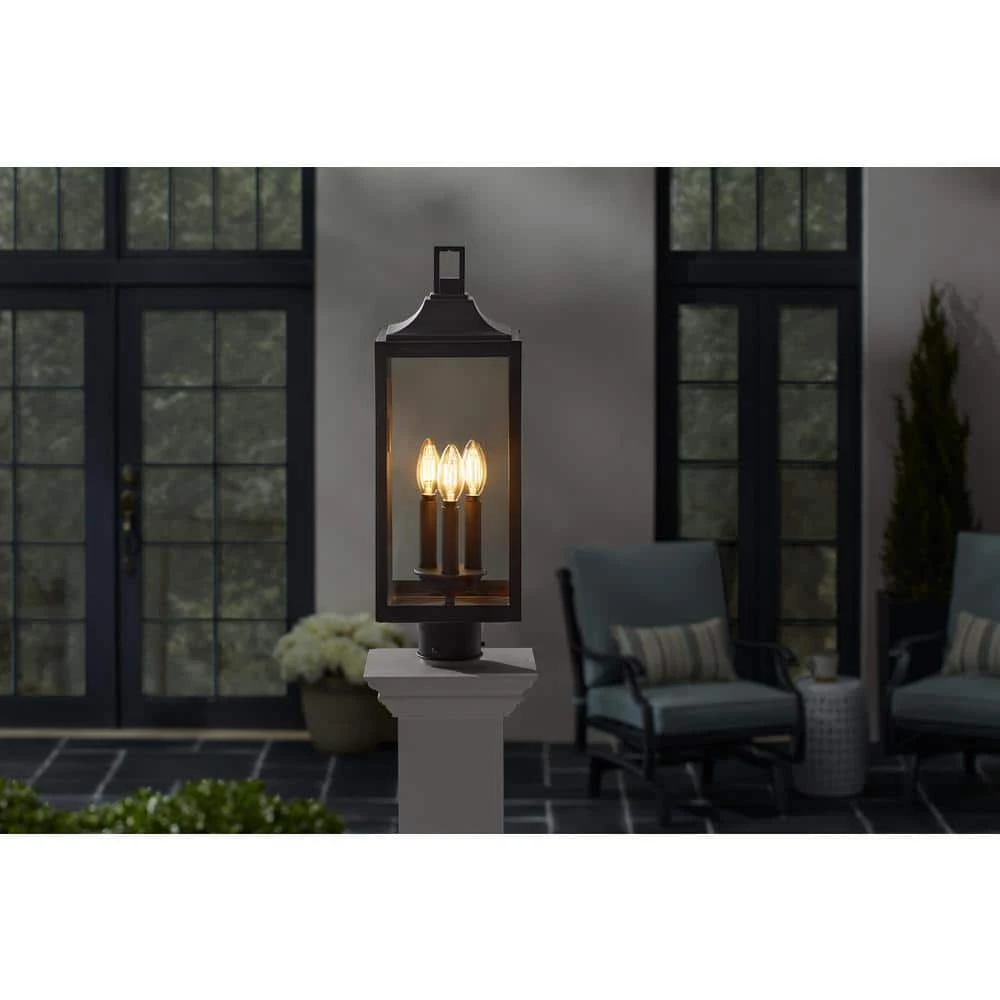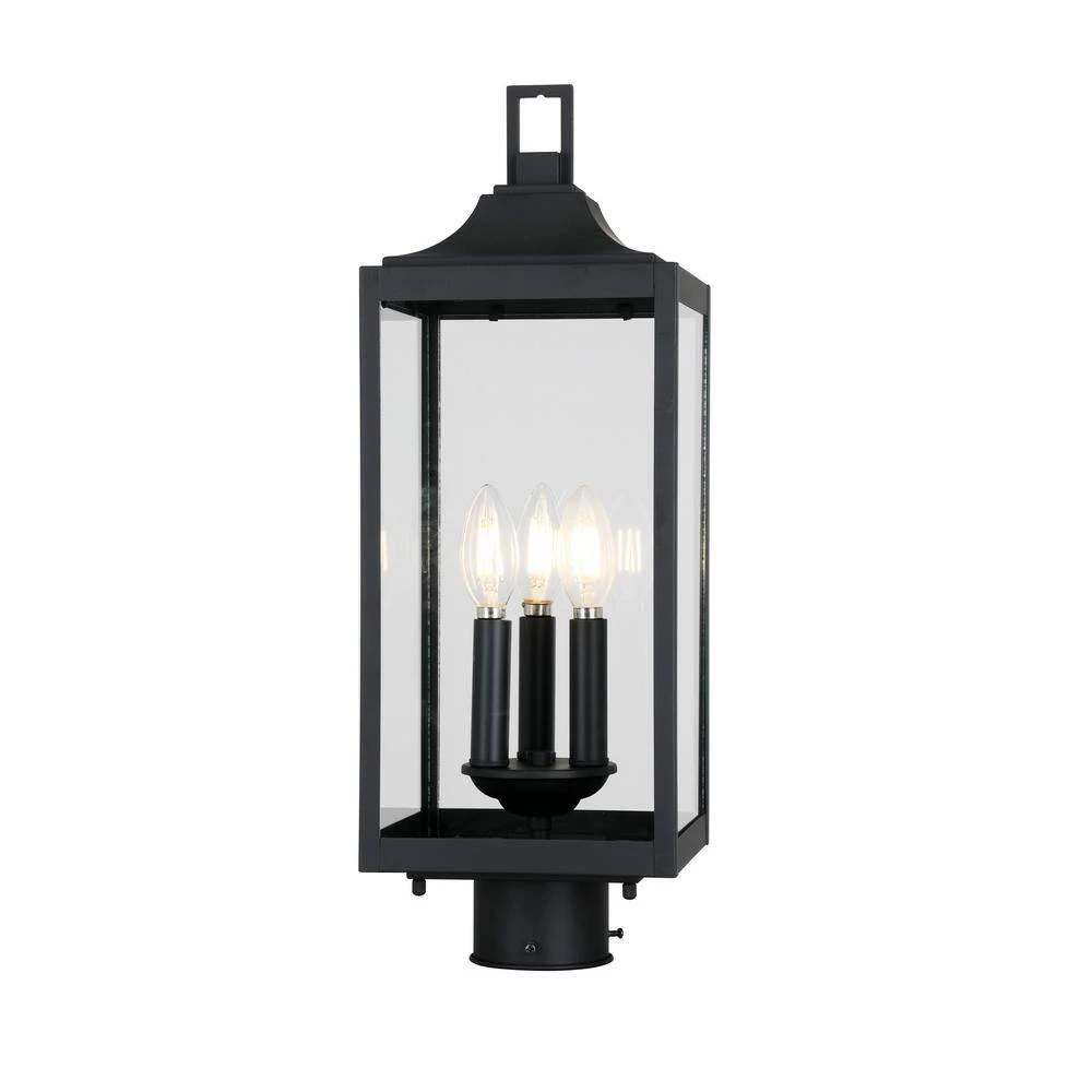 Create a modern farmhouse look for your home with the clean architectural feel of this 3-Light Matte Black post lantern. The elongated rectangular silhouette with a sheperds hook arm attaching it to a backplate makes this timeless design compatible with a variety of exteriors. Clear glass panels complete this inviting appeal adding a sense of warm ambiance to your home.
