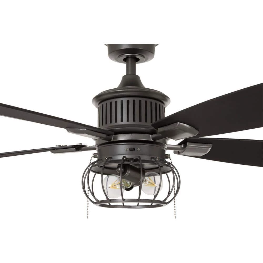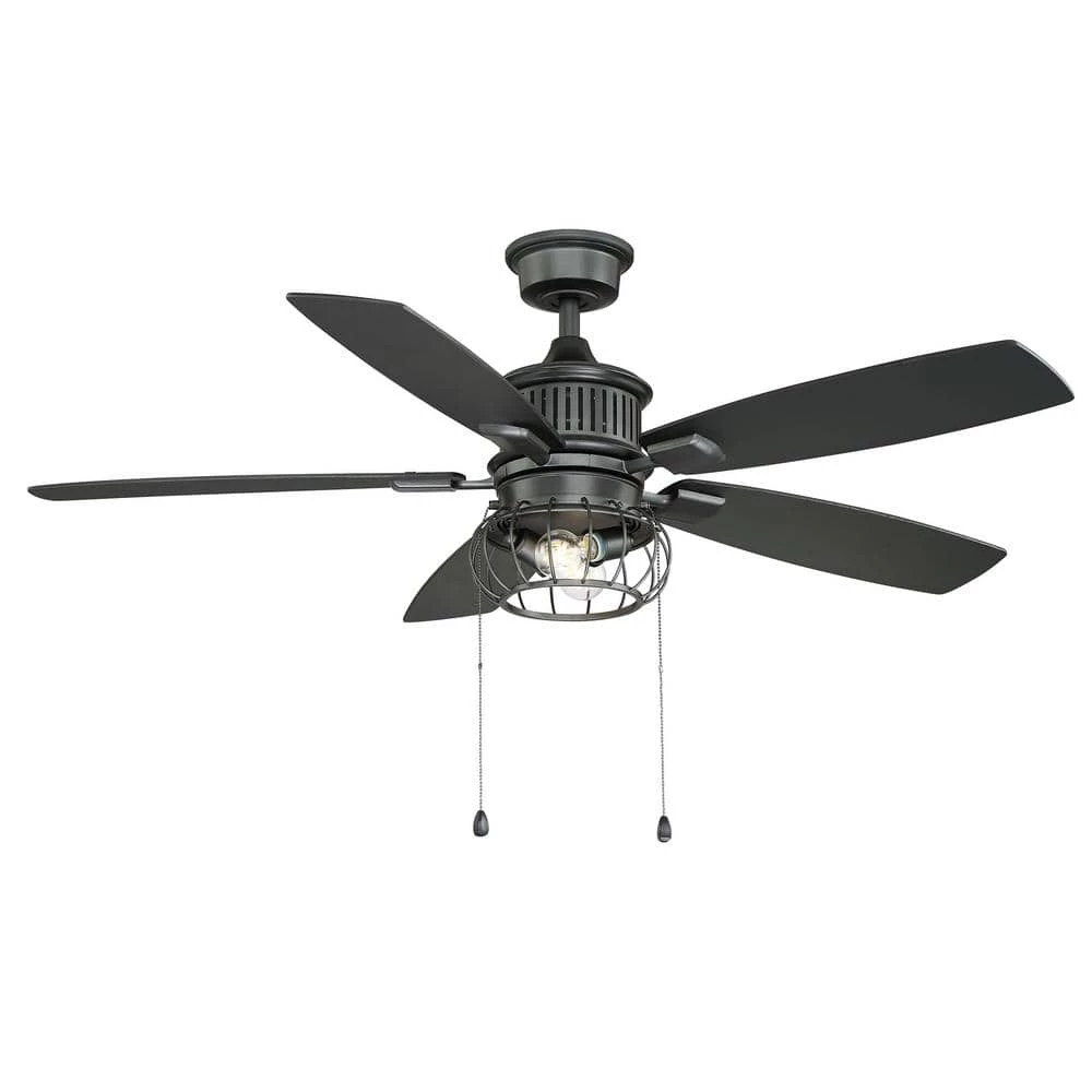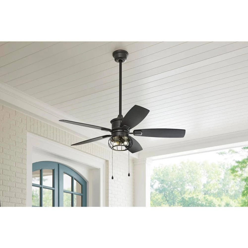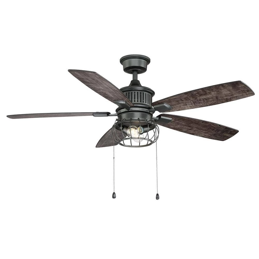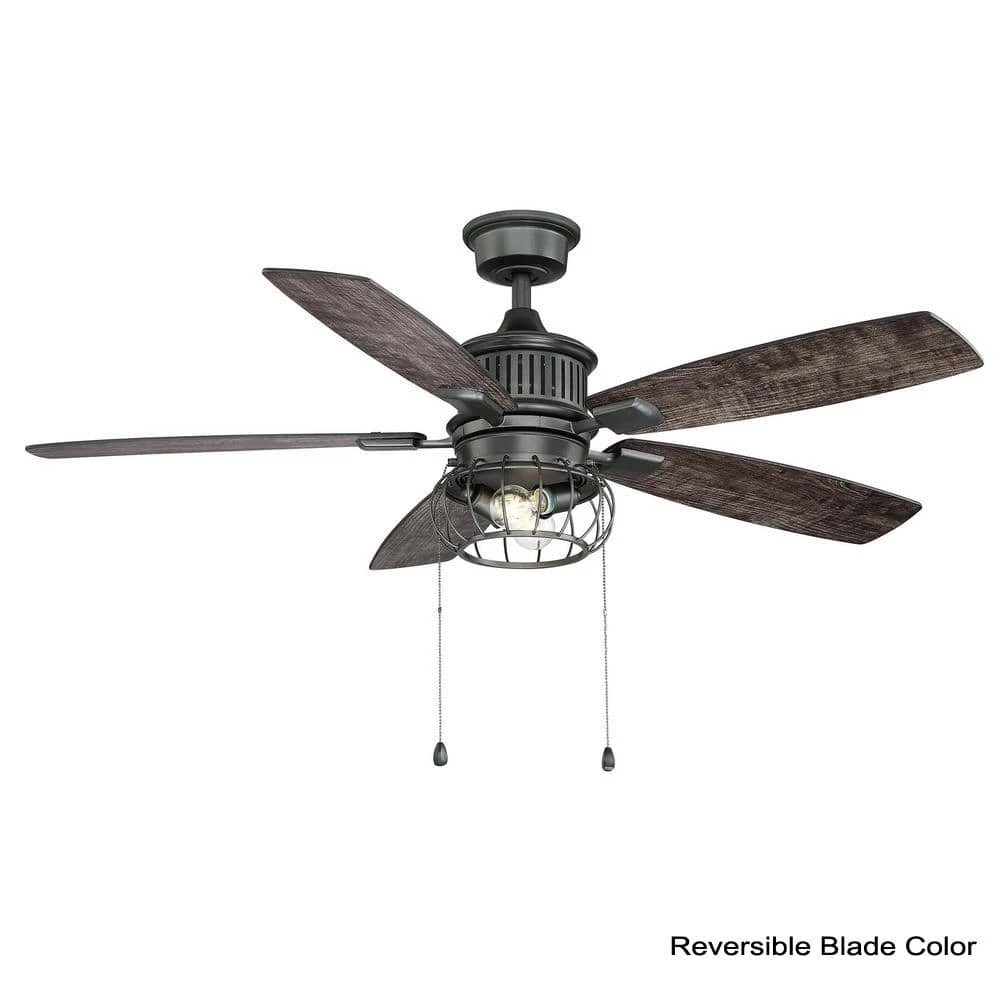 The 52 in. LED Indoor/Outdoor Natural Iron Ceiling Fan has a unique cage light kit with clear filament LED bulbs. Has reversible black and trendy seasoned wood blades to give you options for your decor. This fan is damp rated for outdoor use as long as it is installed under a covered ceiling and comes with a lifetime motor warranty.