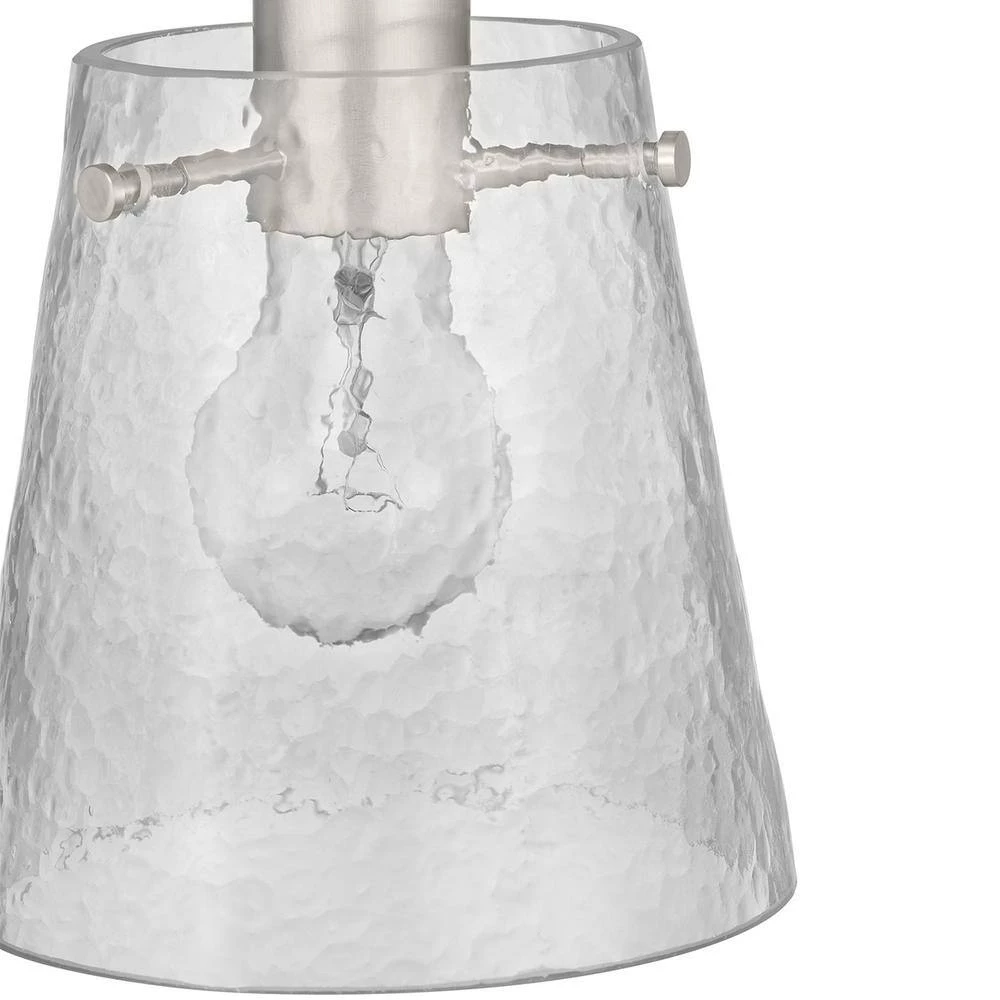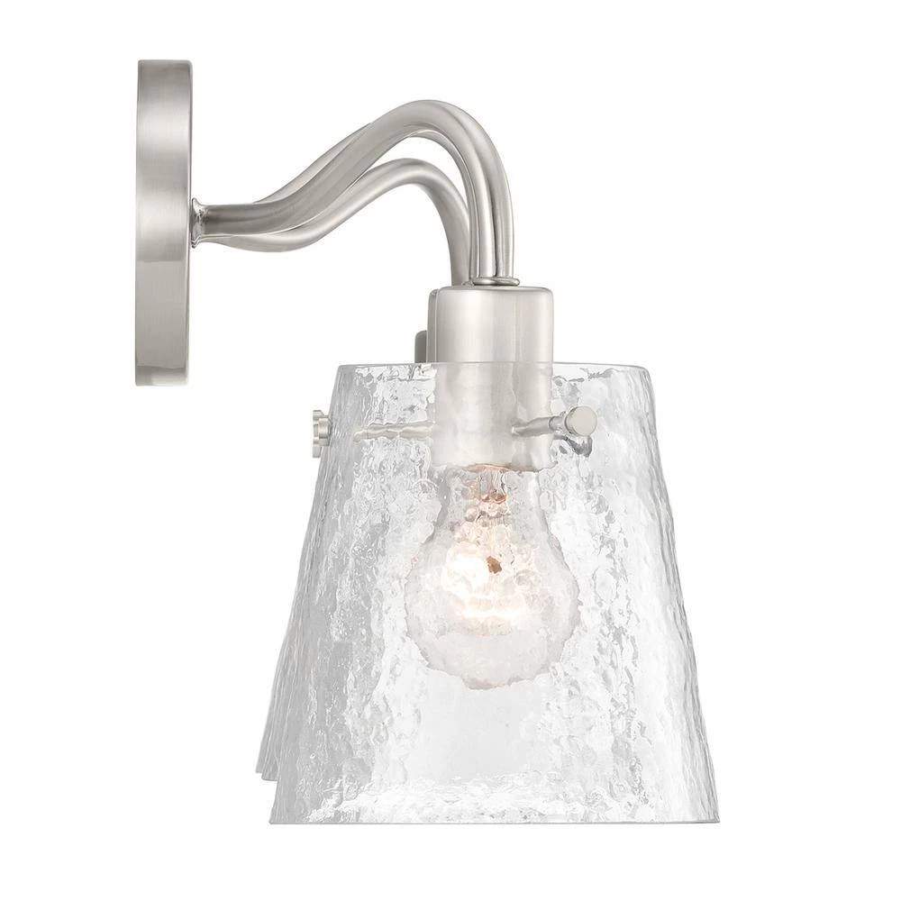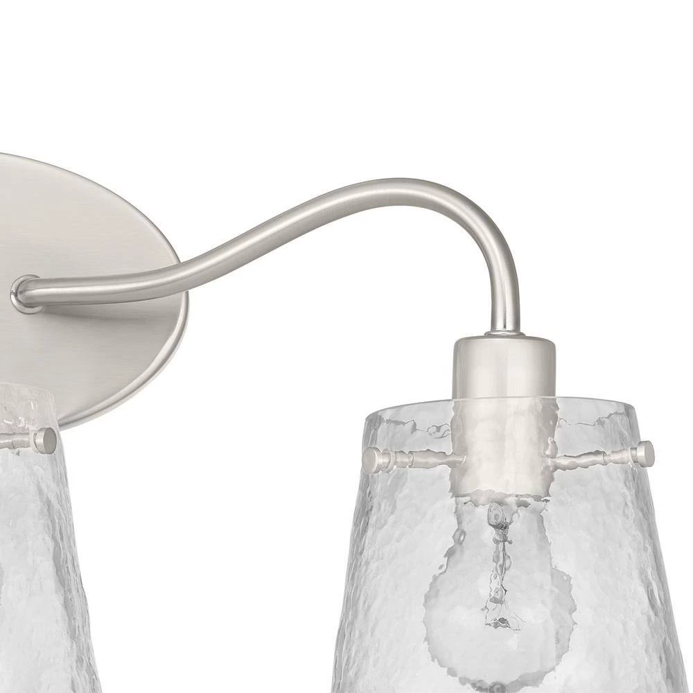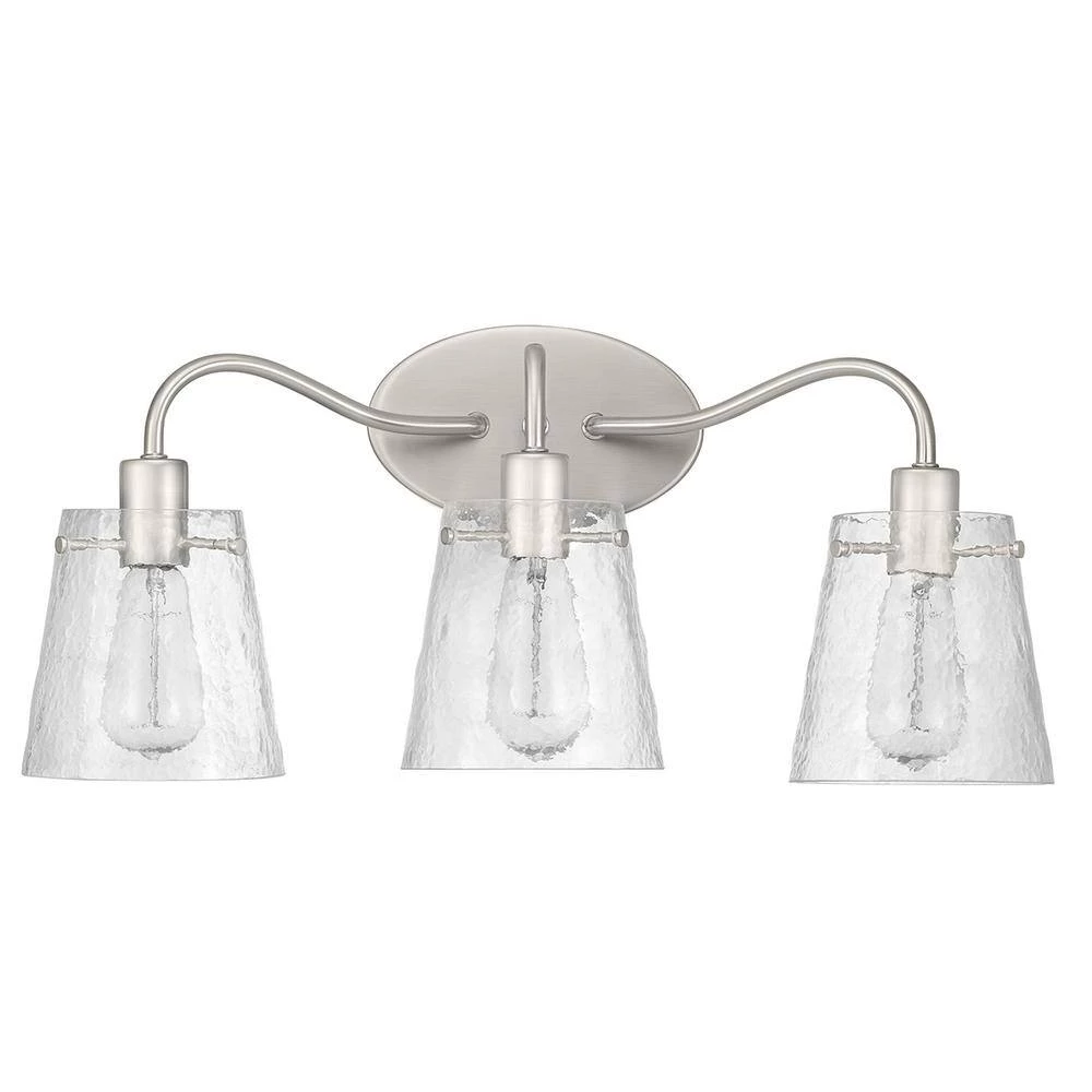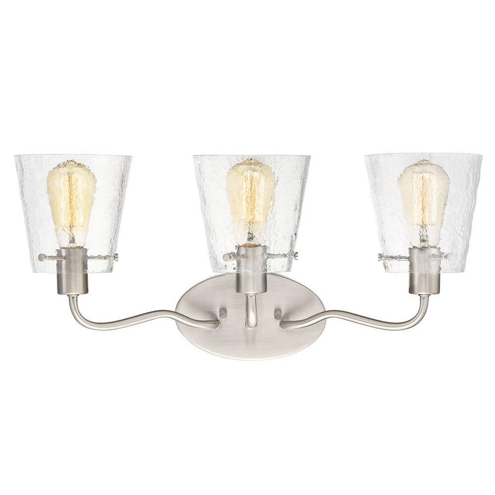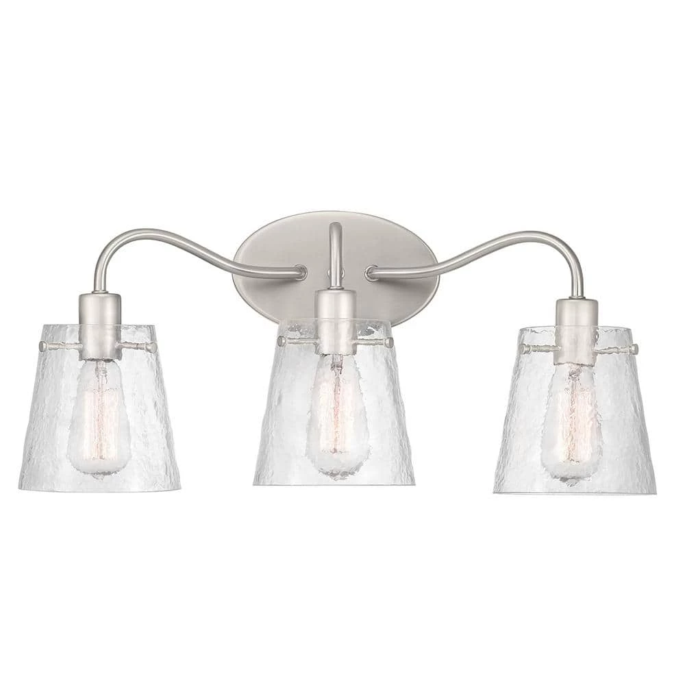 Add a touch of sophistication to your home with our Archdale bath vanity. The Archdale 3-light vanity fixture in brushed nickel provides abundant light for your bath vanity, while adding a layer of today’s style to your interior design. On-trend details, like the clean, clear hammered water glass shades, the elegant flowing arms and oval backplate are defining features of the Archdale Collection.