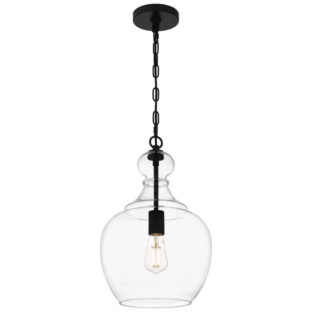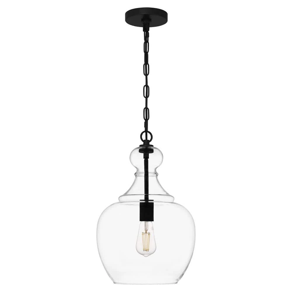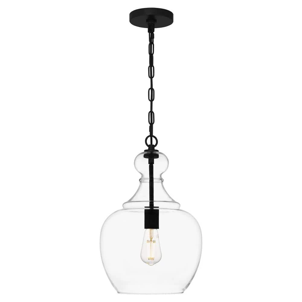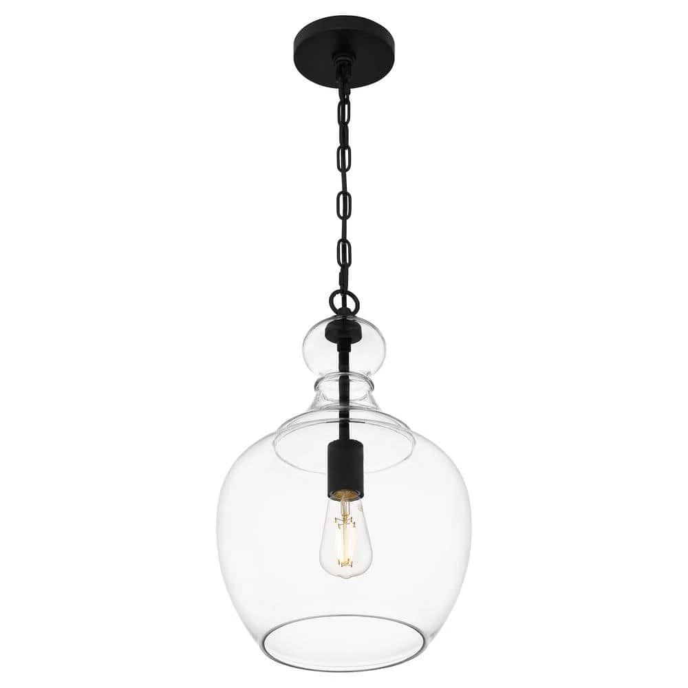 Inspired by the bold, sweeping lines of industrial architecture, this 1-light pendant brings true mood lighting to your space. The sleek matte black finish is offset by the blown glass shade. Dome-shaped, the clear glass allows for an uninterrupted view inside the light that provides a wide, ambient glow to your space. Pair 2 over your kitchen island for a polished, refined look.