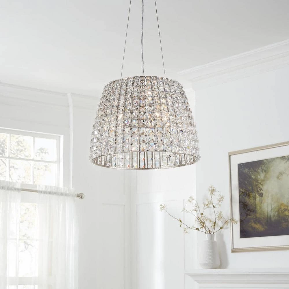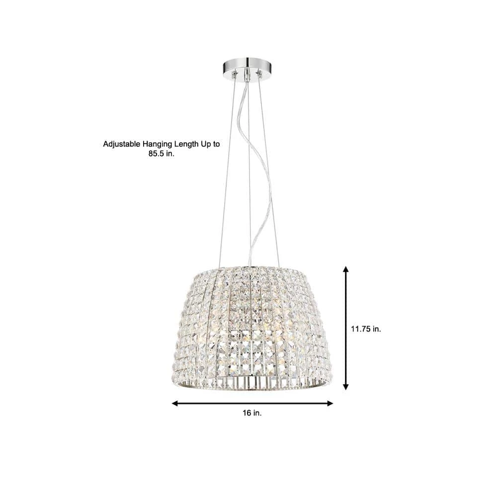 Enhance your home interior with this Beatrice 3-light 16-in. pendant. Perfect for a kitchen, foyer, dining room and more, it provides a clear glass drum shade and crystal accents, creating decorative charm. This adjustable, dimmable fixture offers steel construction for lasting use.
