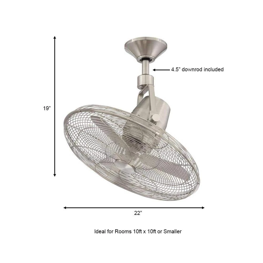 The Home Decorators Collection Bentley III 22 in. Indoor/Outdoor Brushed Nickel Oscillating Ceiling Fan with remote control has a caged fan design and is great when air circulation needs to be directed or if space is tight. It also has an oscillating feature that sways back and forth, creating a nice breeze. Both fan speed and oscillation can be control by the handy remote control. This fan is also rated for damp locations so it can be used under covered outdoor locations.