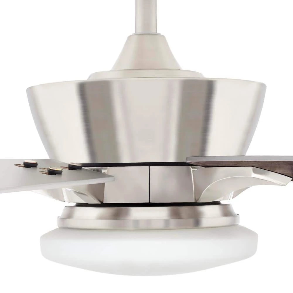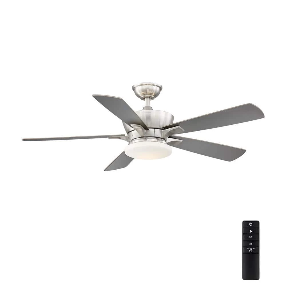 Make a room cooler with this Home Decorators Collection Bergen 52-in. LED ceiling fan. Made for 12 ft. x 12 ft. rooms, it features twist and lock glass for an easy installation. The dome light kit with frosted glass and a handheld remote deliver versatile lighting options. A brushed nickel finish and five reversible blades create a charming look.