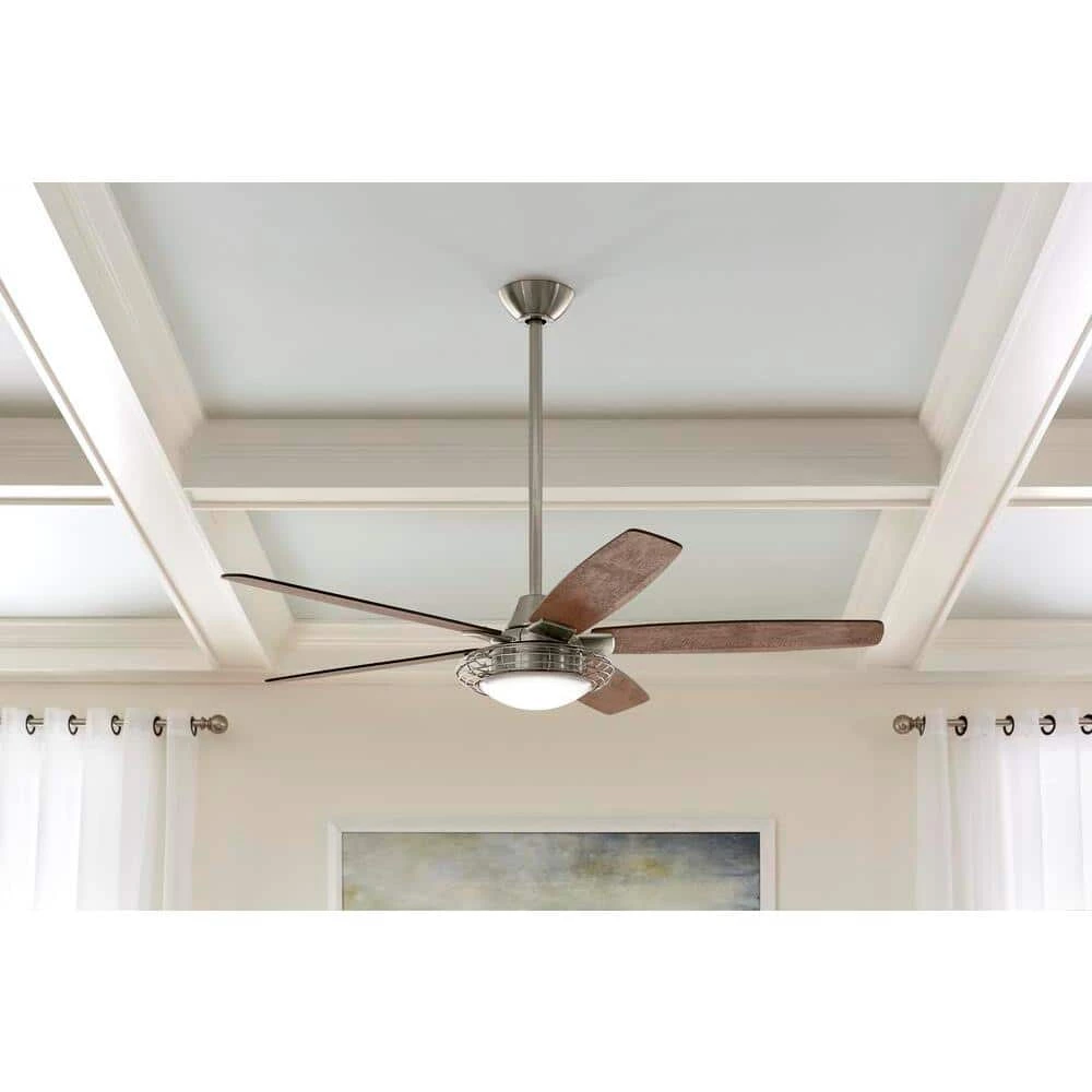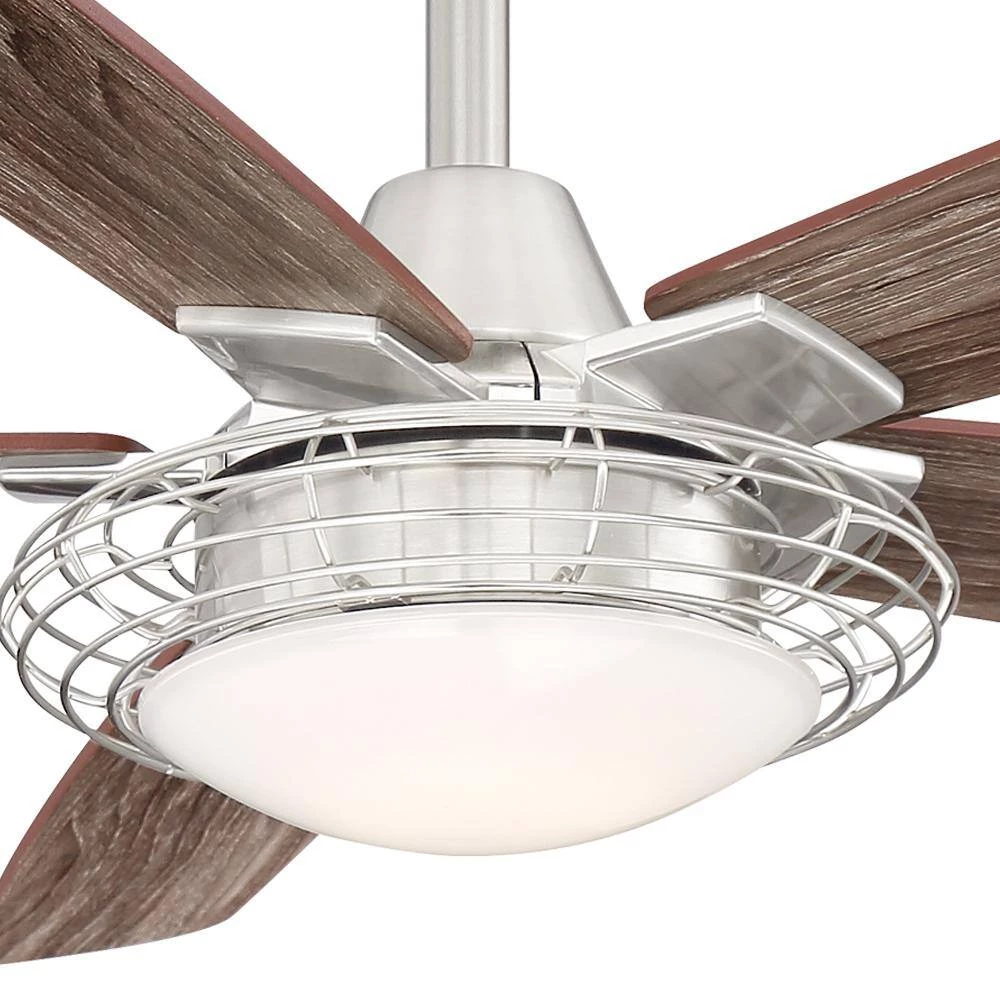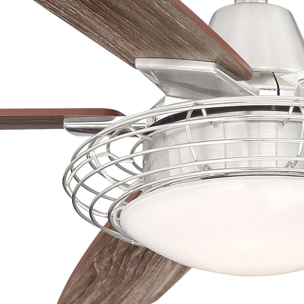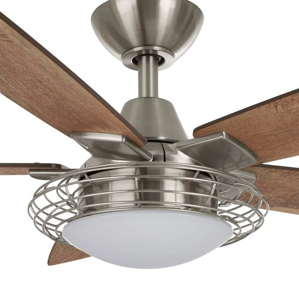 The 52 in. Integrated LED Indoor Ceiling fan features retro styling to bring a sophisticated look to your decor. It boasts a distinctive wire cage body combined with a 14-Watt integrated etched opal glass light with unique detailing. Each of the 5 blades feature a brushed nickel finish to bring a contemporary feel to any room. A heavy-duty 188 x 20 mm reversible motor and wall remote offers a 3-speed fan control and full range light dimmer to suit your personal needs.