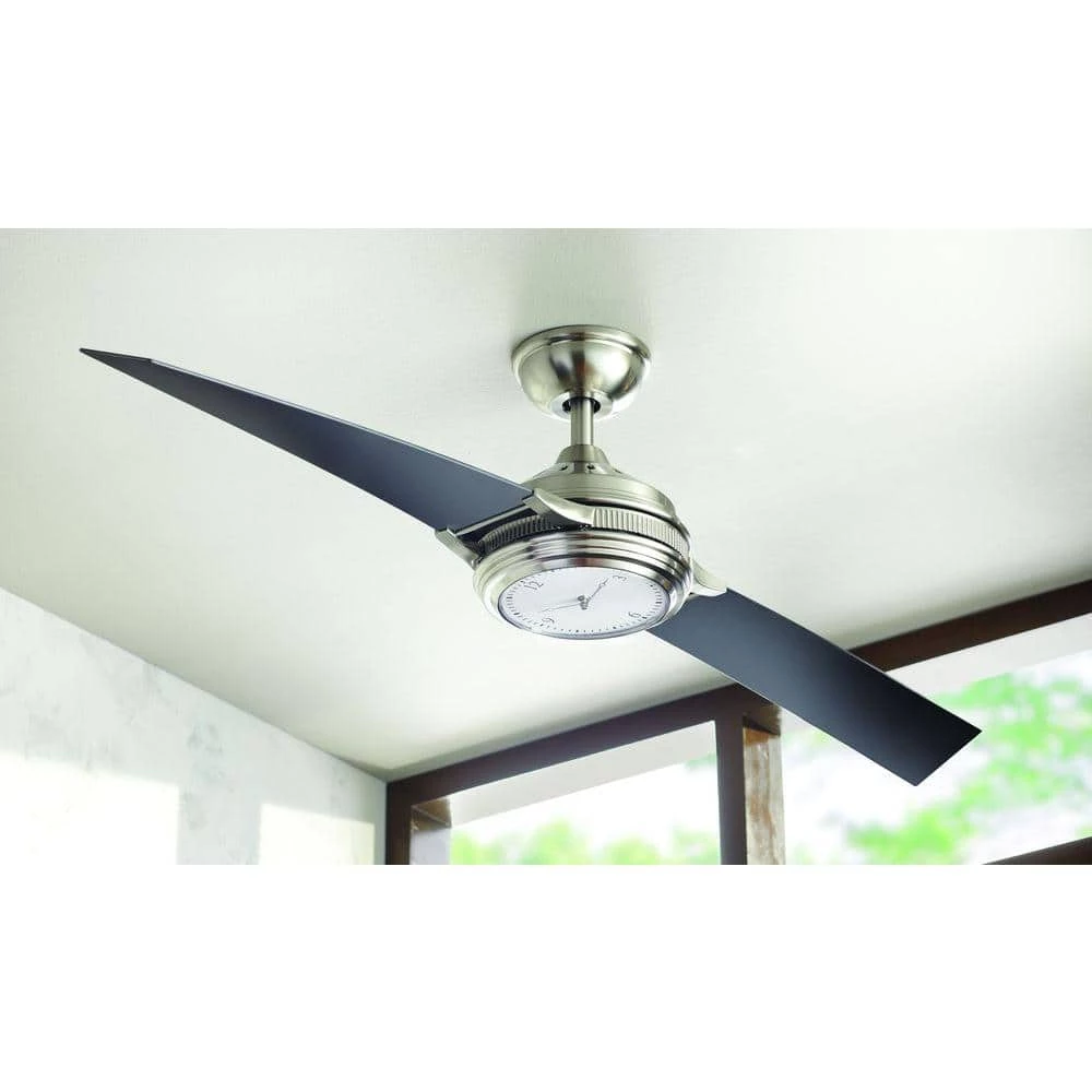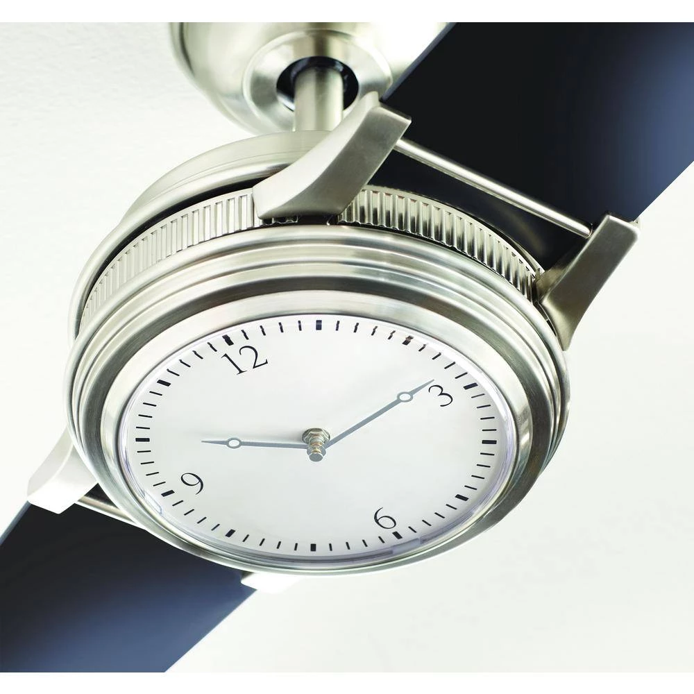 The Home Decorators Collection Breckenridge 56 in. Brushed Nickel Ceiling fan has a functional clock as the light plate piece. Also 4 LEDs are used to see the time at night. The newly designed remote control has many features such as 9 speeds, light timer, comfort breeze, light dimmer and fan reverse function. DC motor fans are 70% more energy efficient than AC motor fans (when comparing efficiency (CFM/W) of DC vs AC motors in published FTC Energy Guides for ceiling fans).
