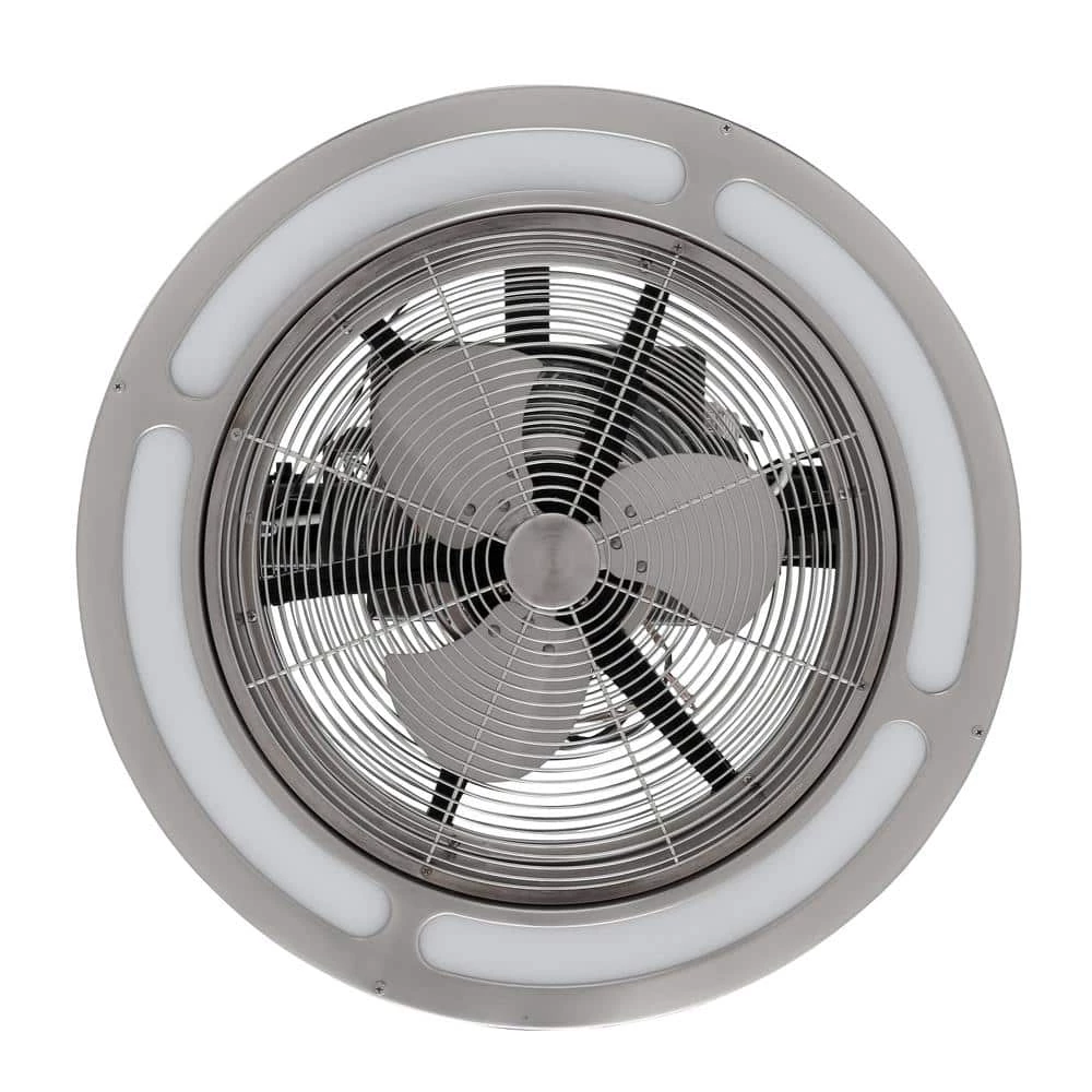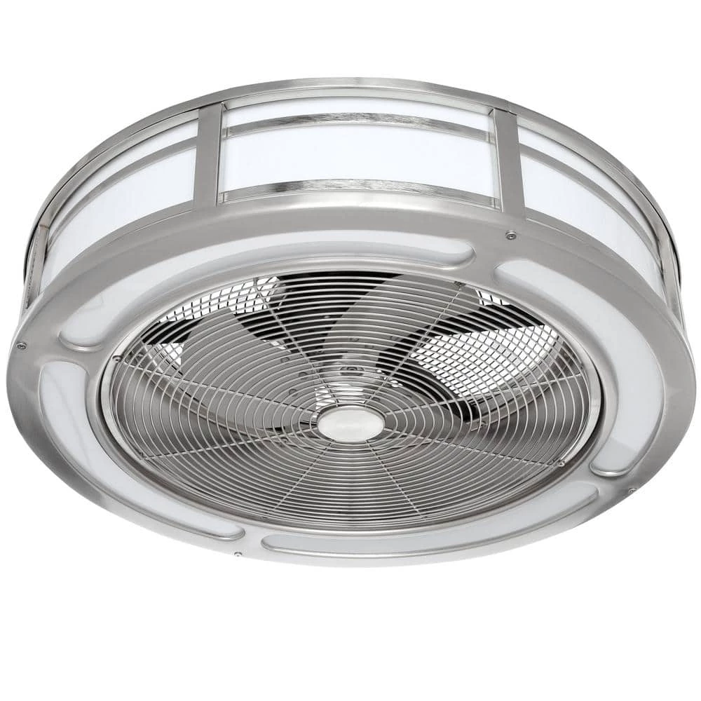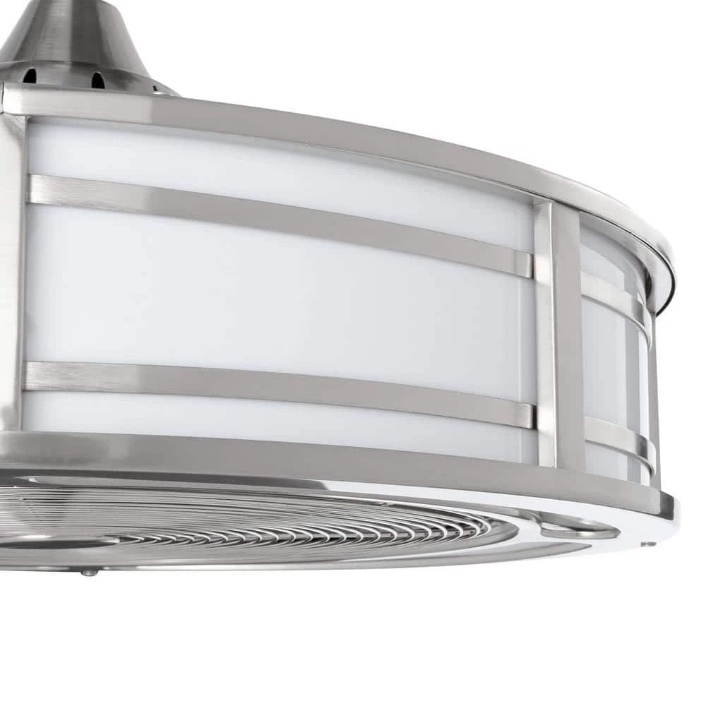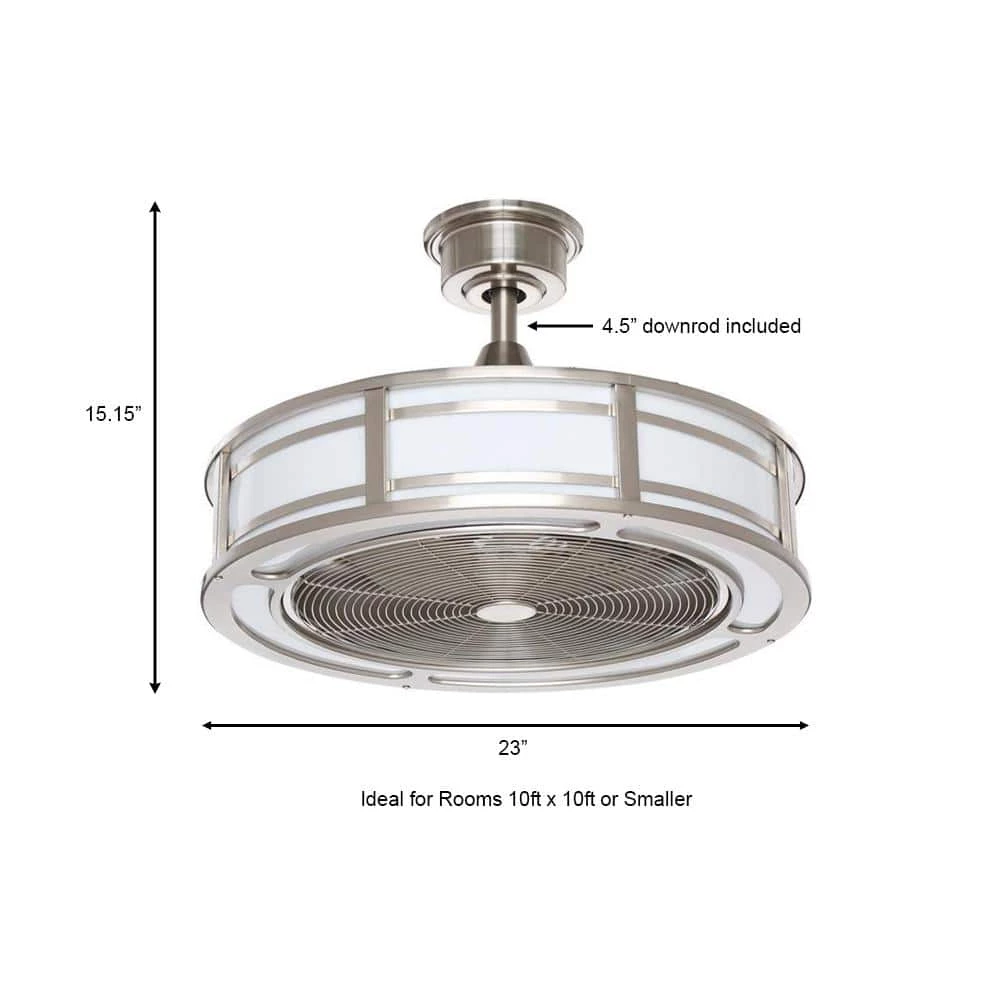 Cool down any living room or covered patio with the Drum Style 23 in. Brushed Nickel Ceiling Fan from the Home Decorators Collection. This ceiling fan features a frosted glass drum-style light and weather-resistant, brushed nickel blades that complement transitional and contemporary decors. This fixture is suitable for damp locations for use in your outdoor spaces. It includes a downrod, remote control and two dimmable 26-W LED light strips. Use the remote control to choose your desired fan speed and independent light settings.