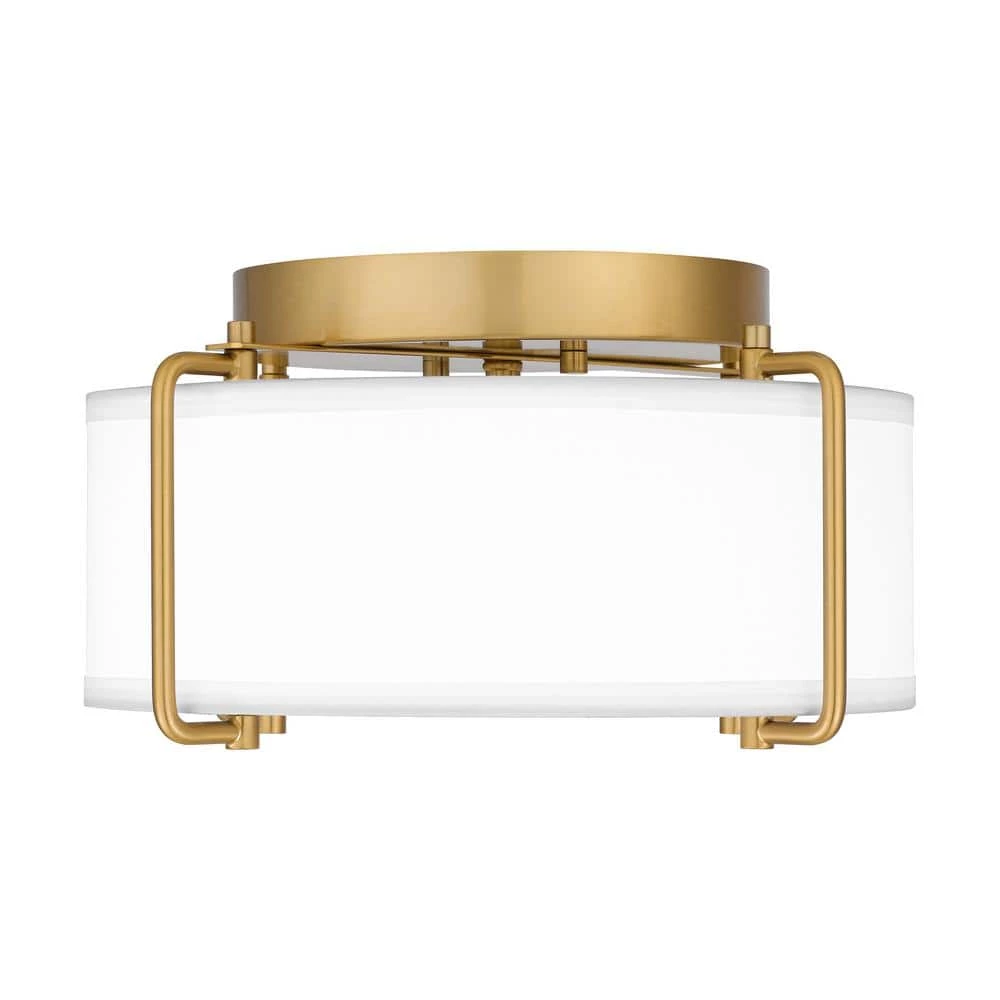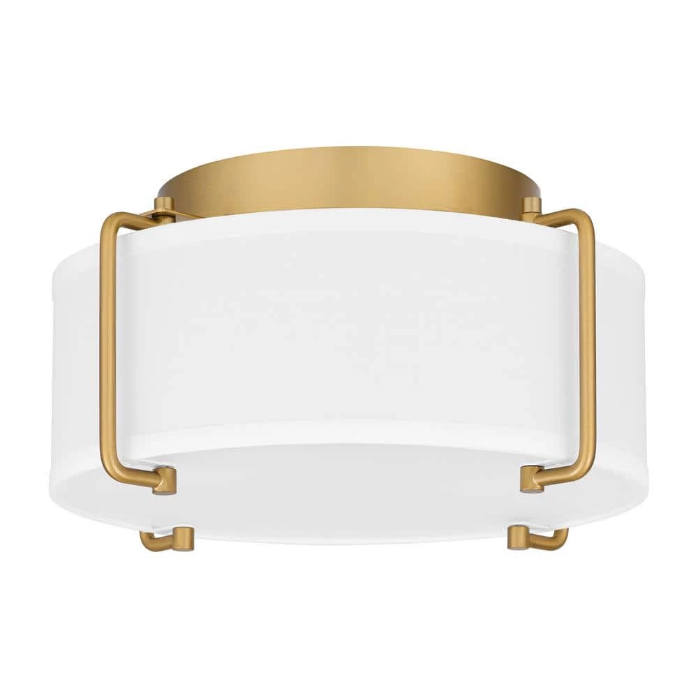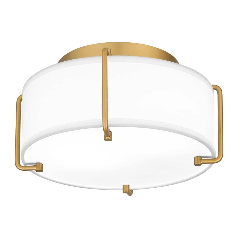 Display unique artistry with this 2-light flush mount ceiling light from the Home Decorators Collection. The elegant brushed gold metal frame is complemented by a downward-facing white drum shade. Its circular base requires the light to be hardwired so the unit can be turned on/off with the flip of a switch. This light fixture has dimmable capabilities when paired with dimming compatible bulbs (sold separately). Shop the rest of the Brookley collection for additional colorways and similarly designed items.