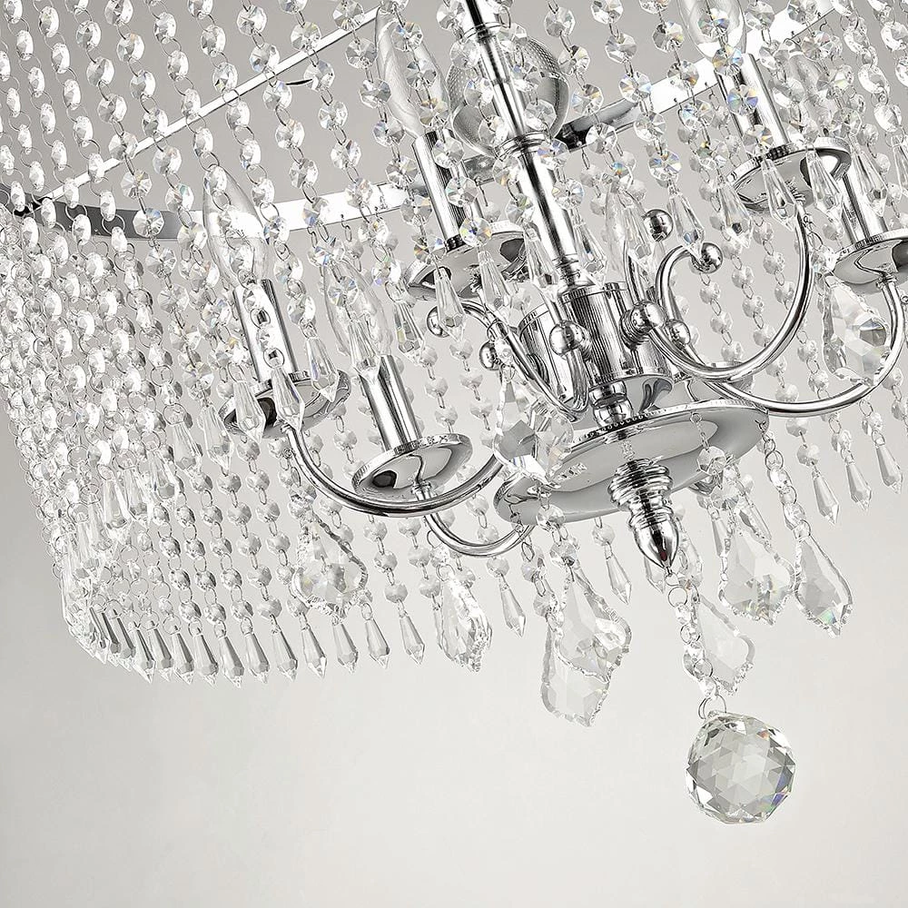 The Calisitti 6-light chandelier is so elegant it is dripping in crystal. From the top font, to the shade and all the way to the bottom of the pendant are different sizes and cuts of crystal. The subtle Polished Chrome finish allows the crystal to be the real star.