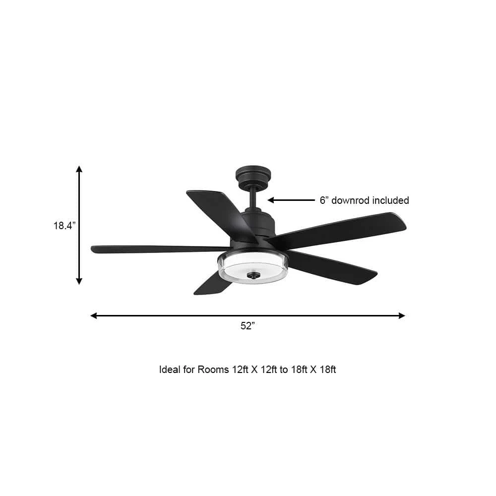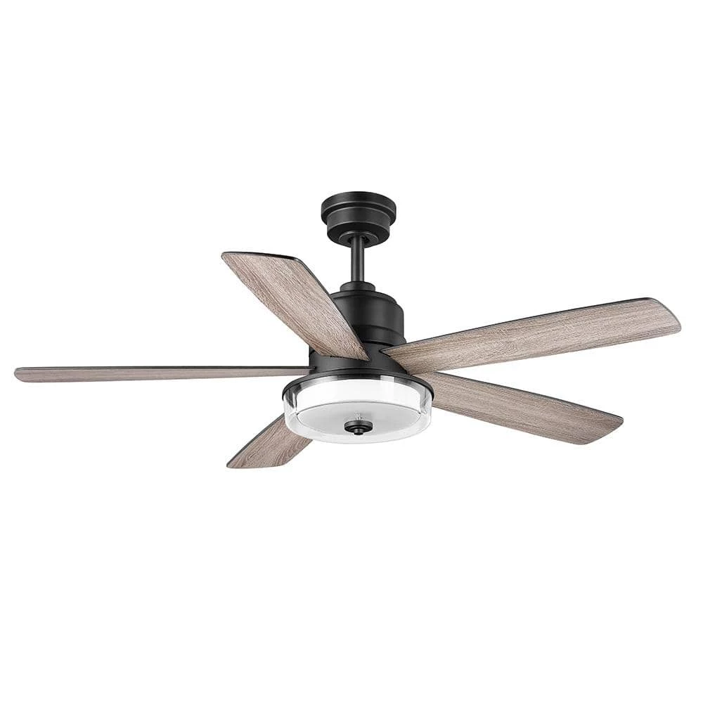 The Home Decorators Collection 52 in Castleford fan offers an easy way to enhance your indoor living spaces. This transitional ceiling fan offers powerful and quiet performance for year-round comfort. The matte black finish is paired with 5 reversible blades in vintage pewter oak and matte black finish to easily blend with your decor. The Castleford includes an integrated and dimmable LED module light kit that allows you to choose from 6 different color temperature settings ranging from warm white (2700K) to daylight deluxe (6500K) to match your home’s current lighting. Control is at your fingertips with the included handheld remote to operate the fan’s 3-speeds and light. A wall cradle is included to store the remote when not in use.