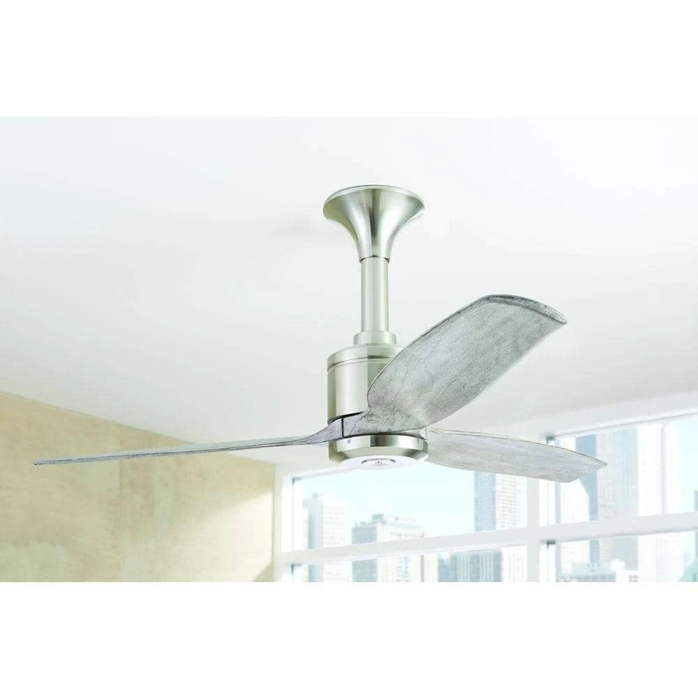 The Home Decorators Collection Chaplin 52 in. Brushed Nickel Ceiling Fan has a modern style design and real wood blades in distressed gray. This is a hugger style ceiling fan, so it’s designed for low ceilings. The newly designed remote control has many features such as nine speeds, a light timer, comfort breeze, light dimmer and fan reverse function. DC motor fans are 70% more energy efficient than AC motor fans (when comparing efficiency (CFM/W) of DC vs AC motors in published FTC Energy Guides for ceiling fans).