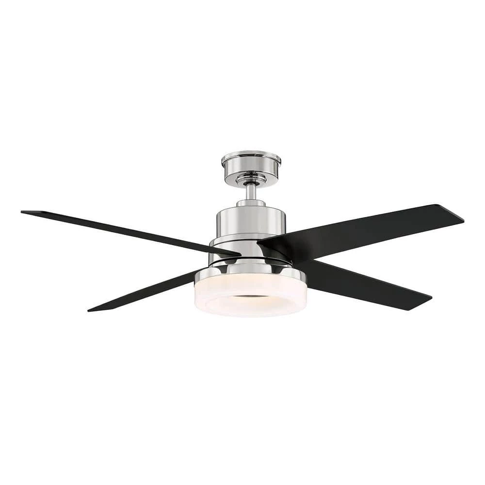 The Home Decorators Collection Cityview 54 in. Polished Nickel Ceiling Fan with LED ring light is perfect for room size up to 18 ft. x 18 ft. This fan offers reversible black/Jacobean walnut blades to give you 2 versatile design options to help match your interior decor. The integrated LED light kit provides soft white light. The included remote controls the dimming and speed functions.