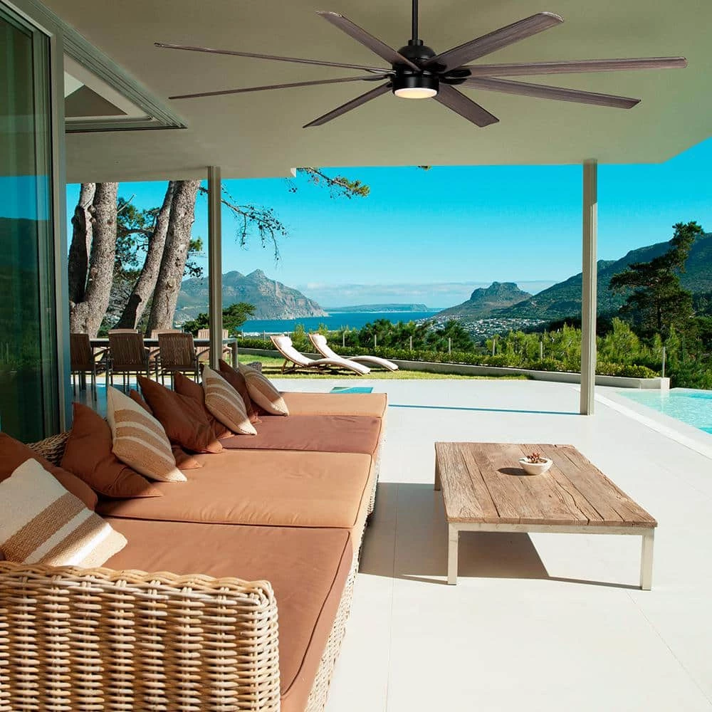 I purchased this fan for my covered porch, and it’s been a great addition. The matte black finish is durable and weather-resistant, and the integrated LED light provides plenty of illumination. The remote control is easy to use and works well.