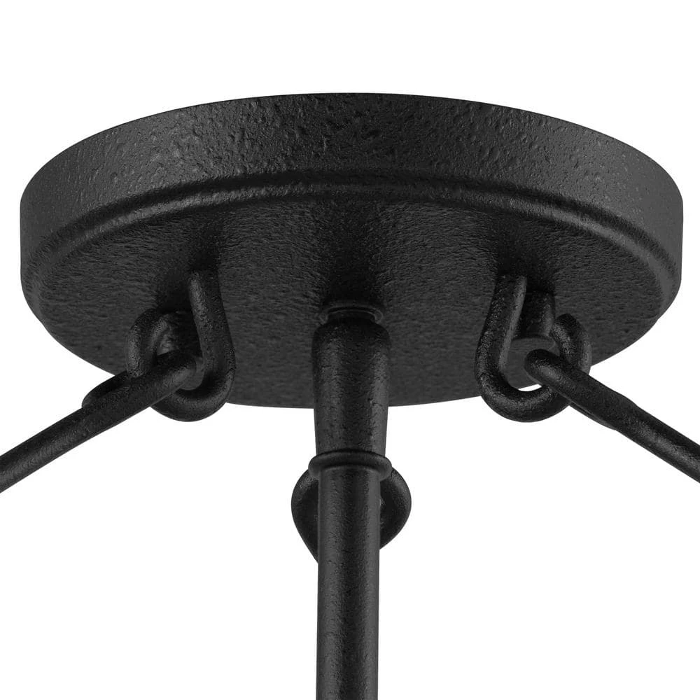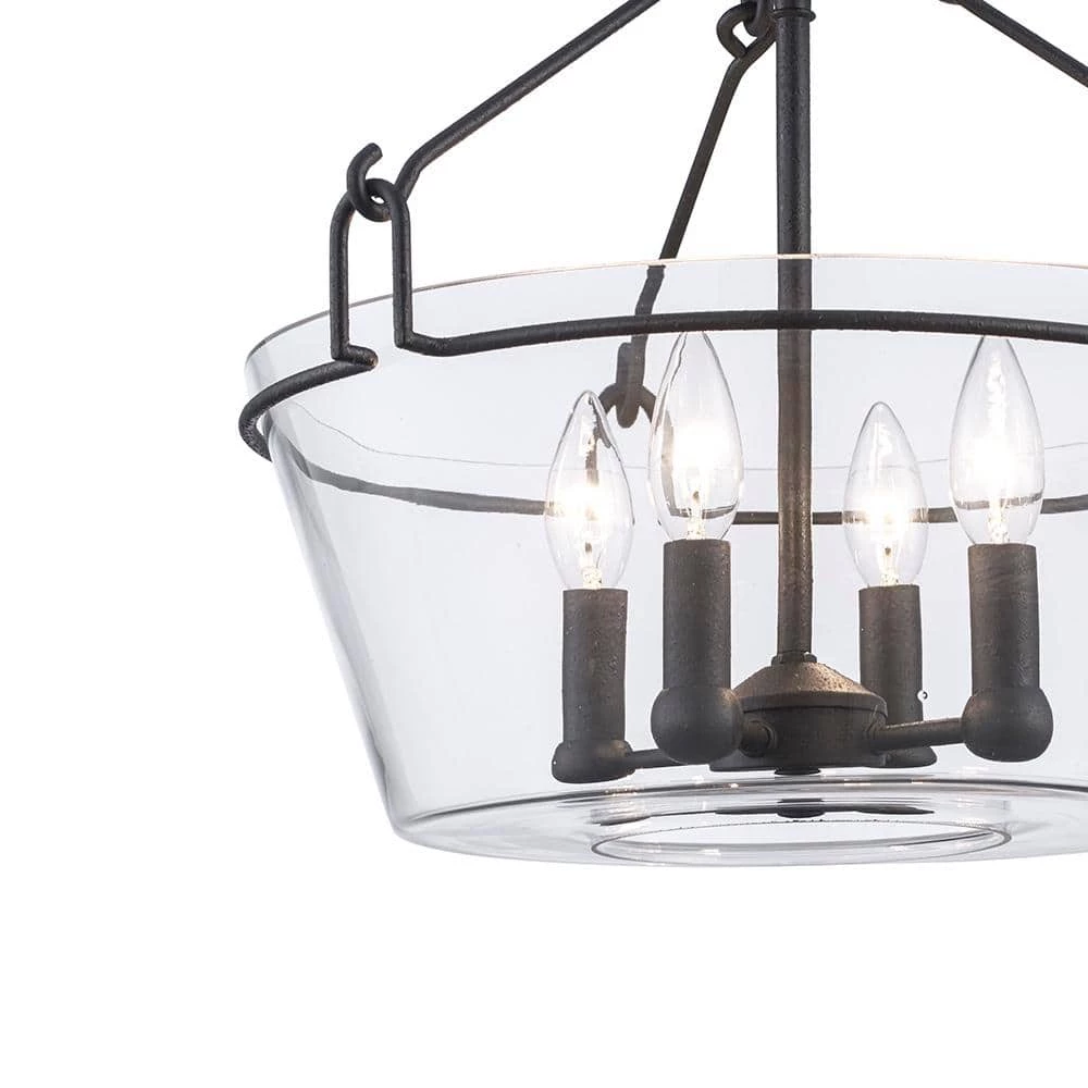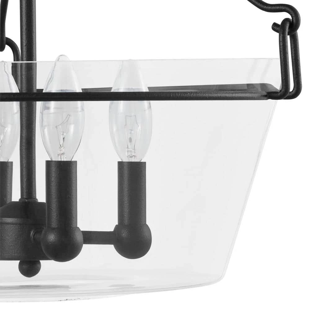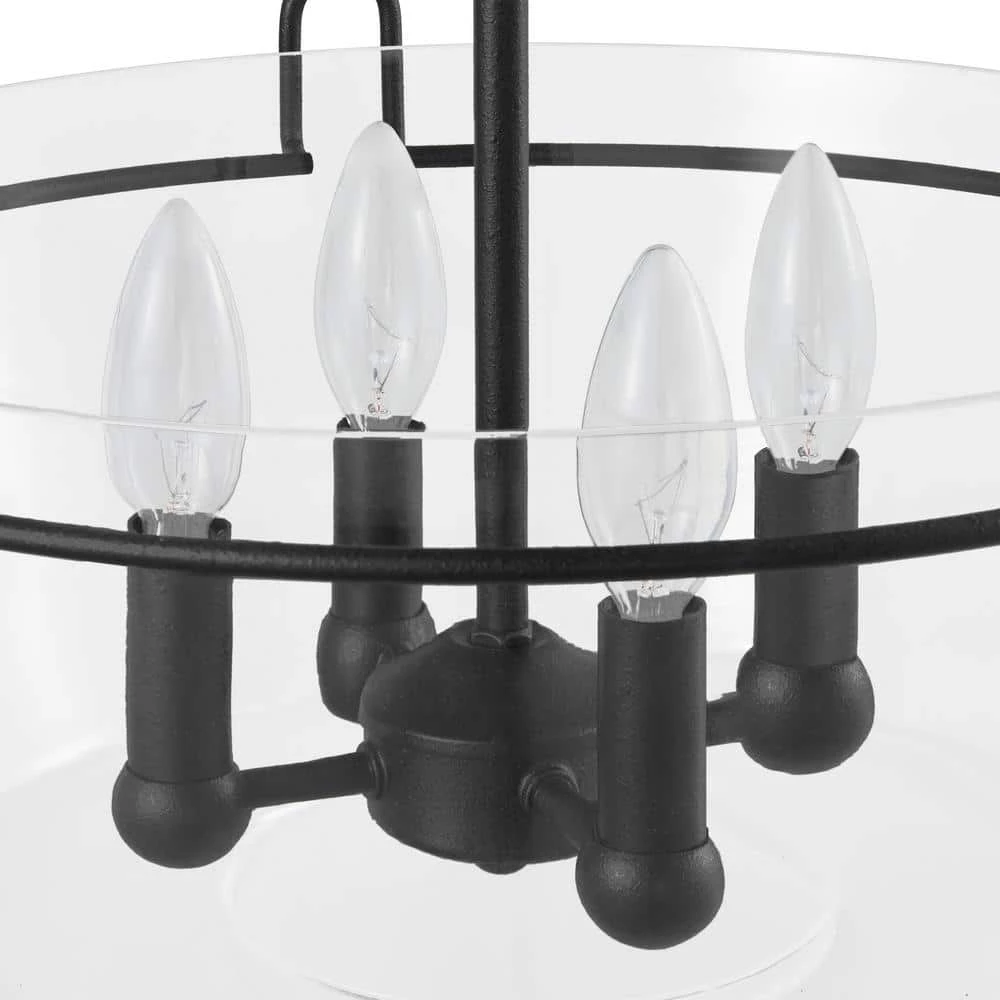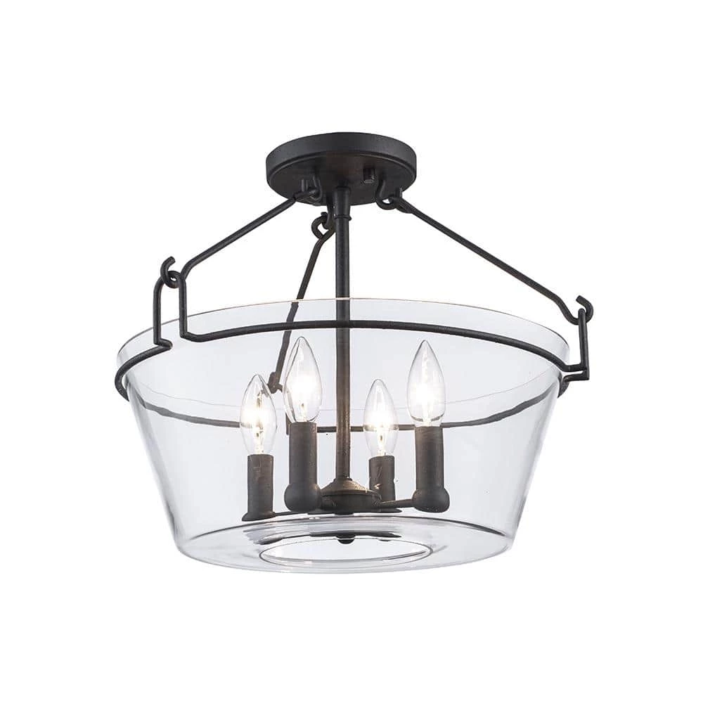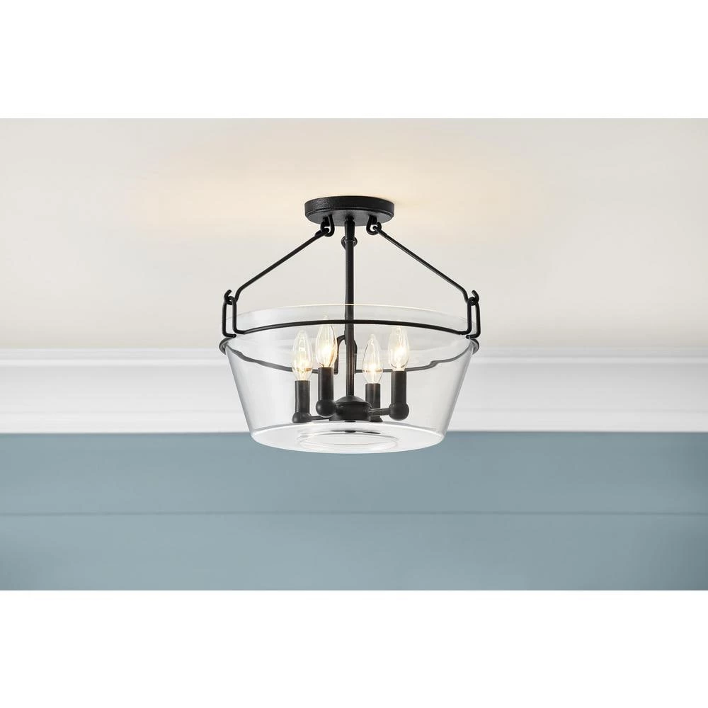The Crestlane 4-light semi-flush mount from Home Decorators Collection is a versatile ceiling fixture that can be used in a wide variety of interior spaces and decor styles. A classic black finish is paired with clear glass, a combination that lends itself to a modern design. The glass bowl-style shade hangs from 3 support rods which give the piece an elegantly rustic feel. 4 candlestick-style bulbs are housed in the shade, providing ample light output in kitchens, living rooms, dining areas, and more. This semi-flush fixture hangs at a fixed height, attaches to a matching black ceiling canopy, and is dimmable when used with a compatible dimmer switch.