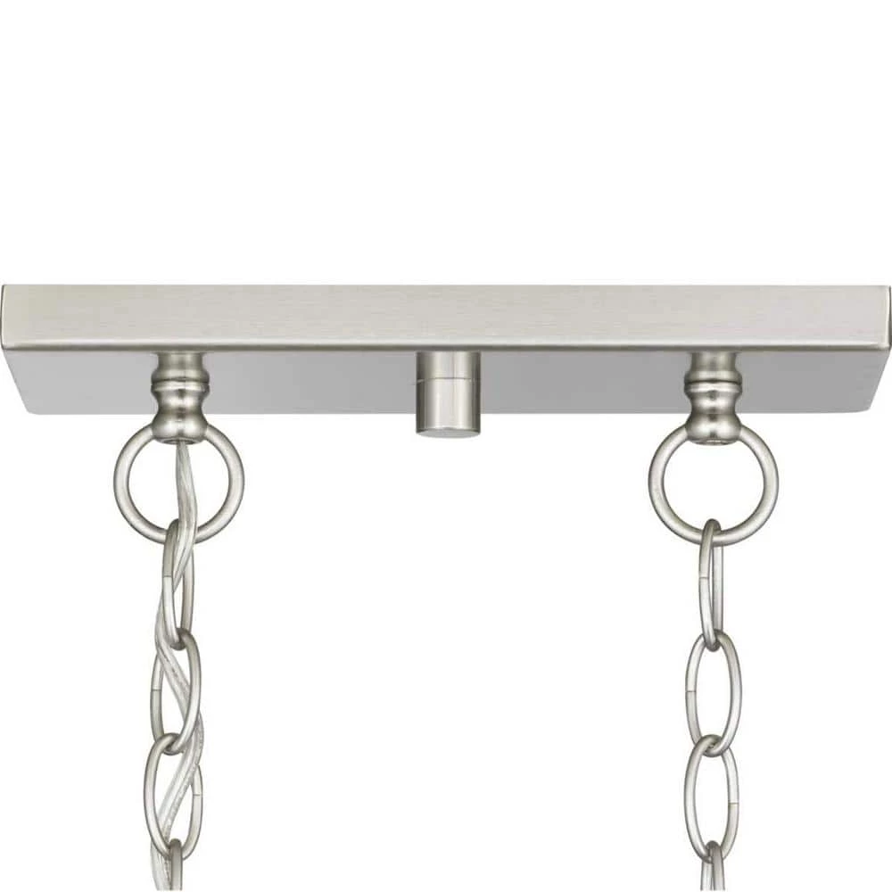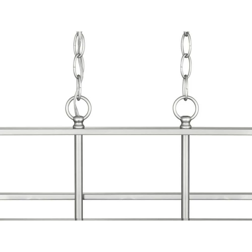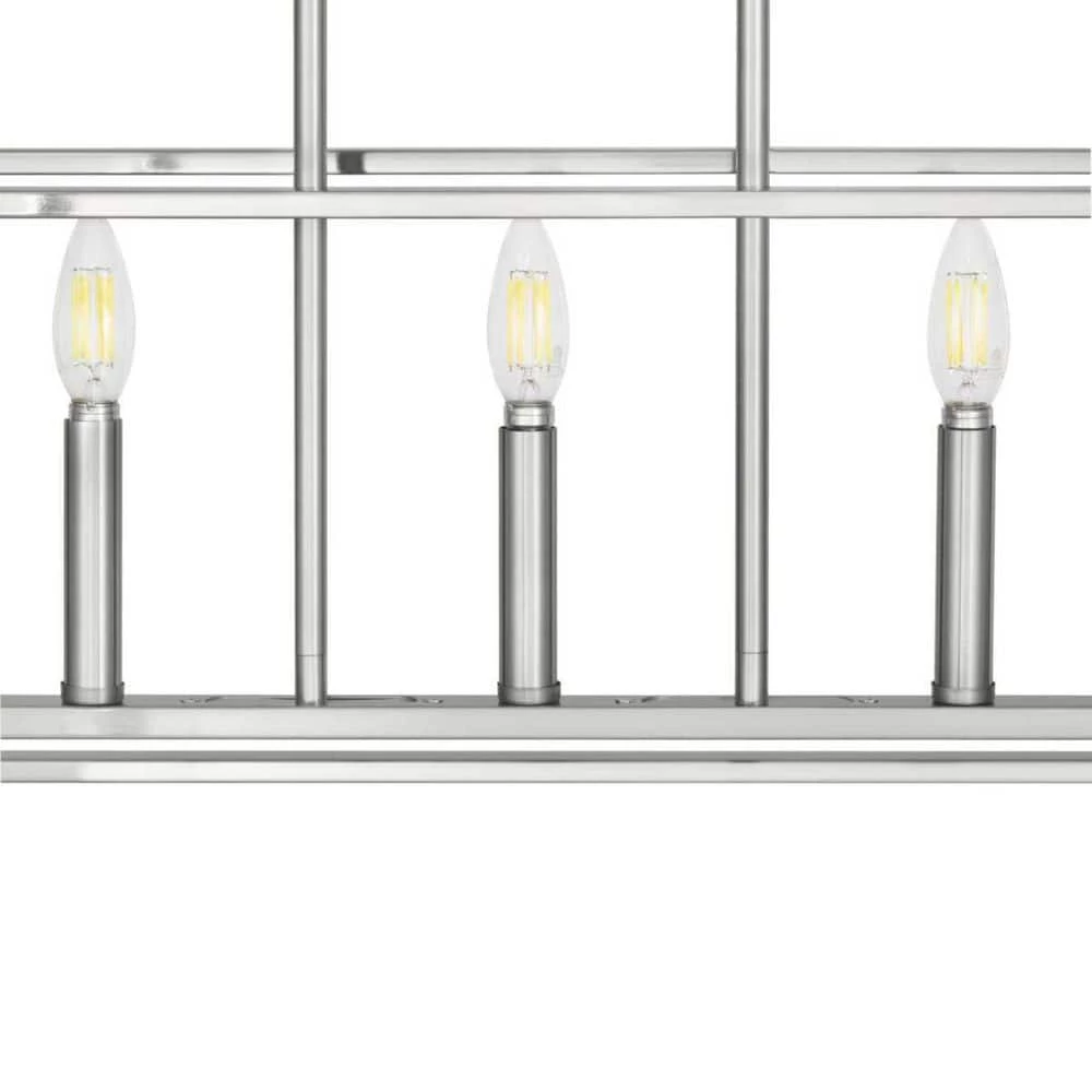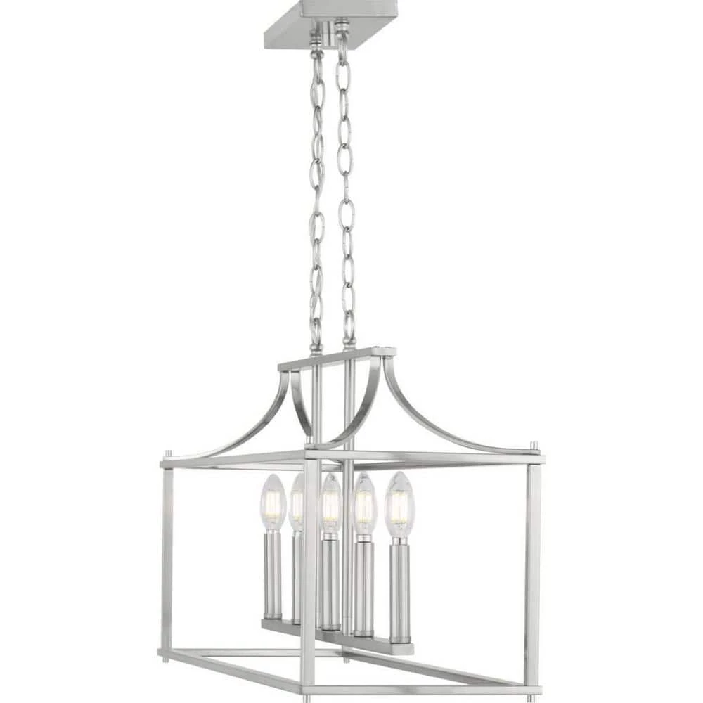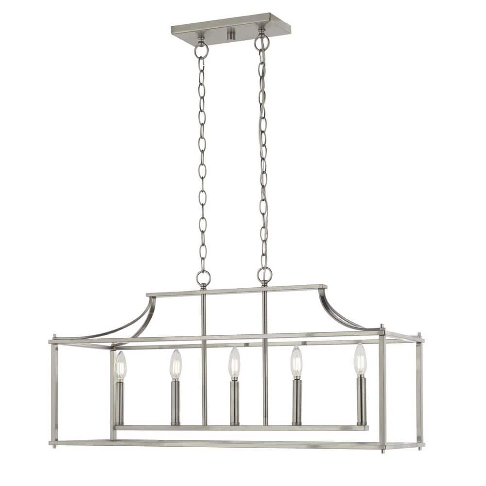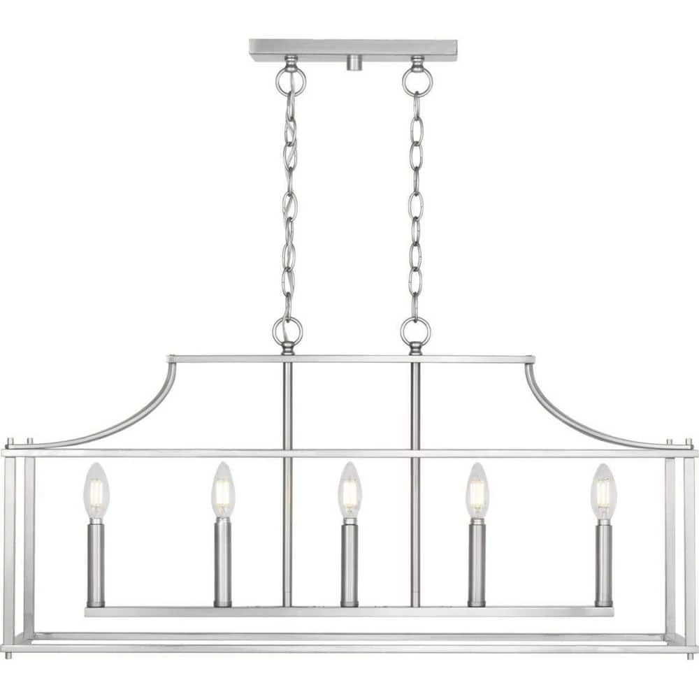Create the perfect aesthetic with the exquisitely crafted 5-light linear chandelier. An open-cage frame coated in a gorgeous Brushed Nickel finish exposes the candelabra style bulbs for a classic look. Enhance your kitchen island or dining room table with the classic styling of this 5-light island chandelier.