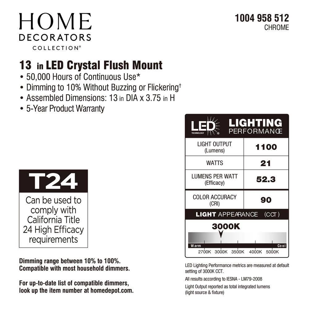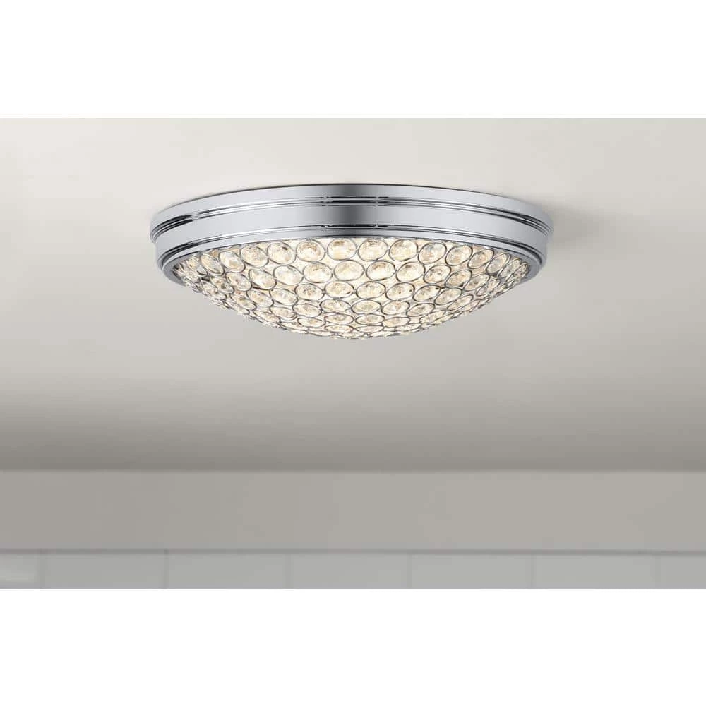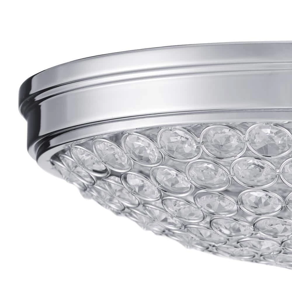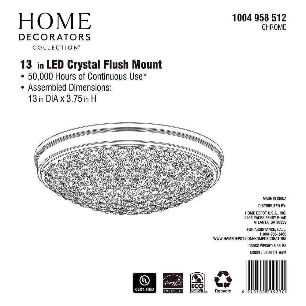 Add an elegant look to your decor with this chrome and crystal flush mount. The etched crystals radiate light in all angles creating a beautiful ambiance. The long-lasting LED technology provides light output equivalent to 120-Watt of traditional incandescent lighting, while using less than 20% of the energy for year round savings. Enjoy a 5-year warranty and a rated life of 45-years or 50,000-hours of continuous use. The ENERGY STAR certified light source is maintenance free with no bulbs to change. Its even easy to install with a provided bracket and only requires 1 person to install.