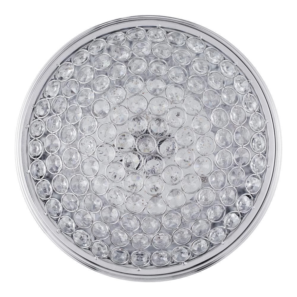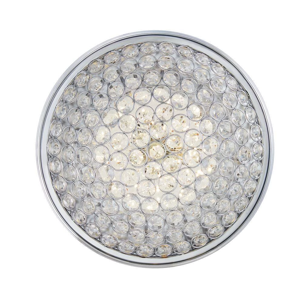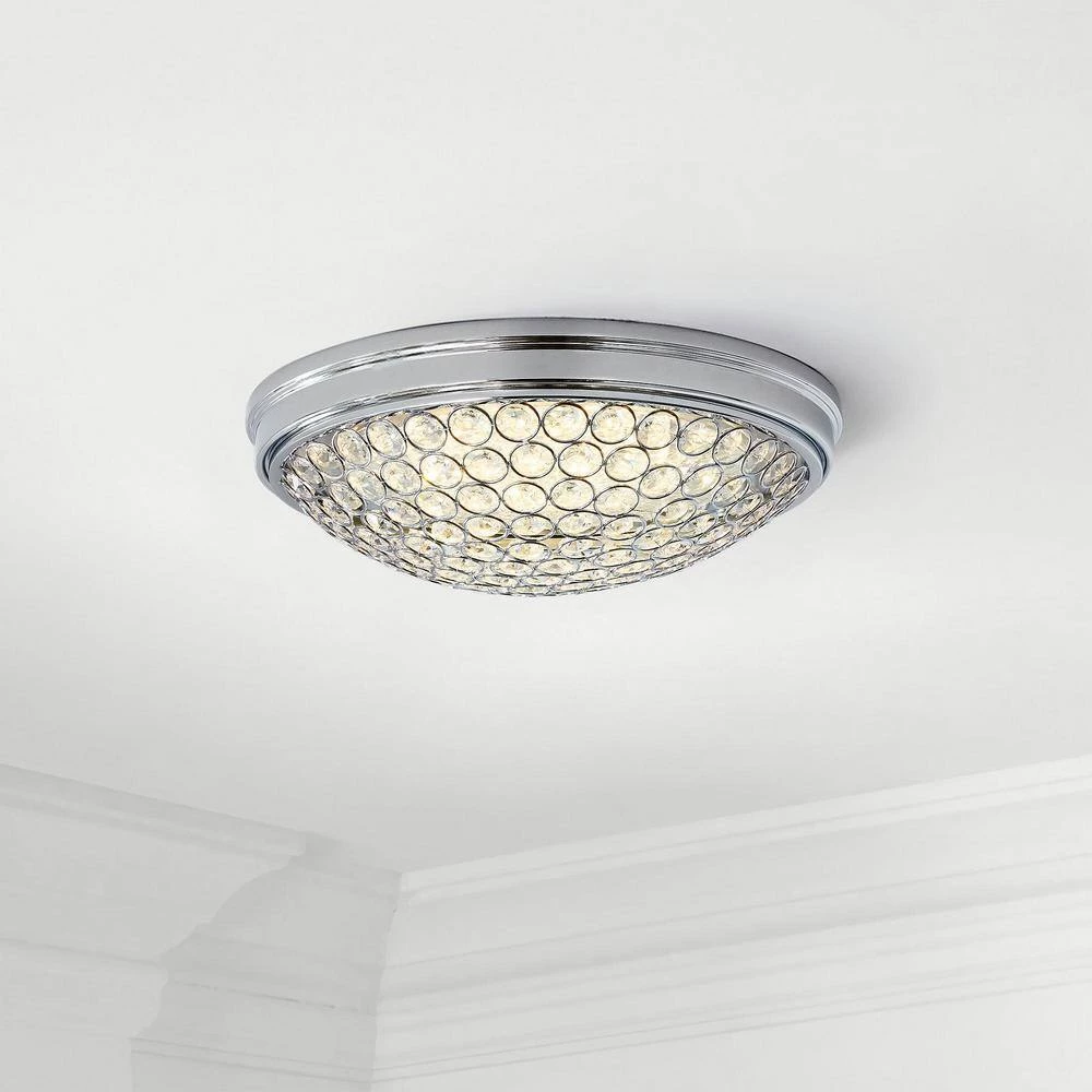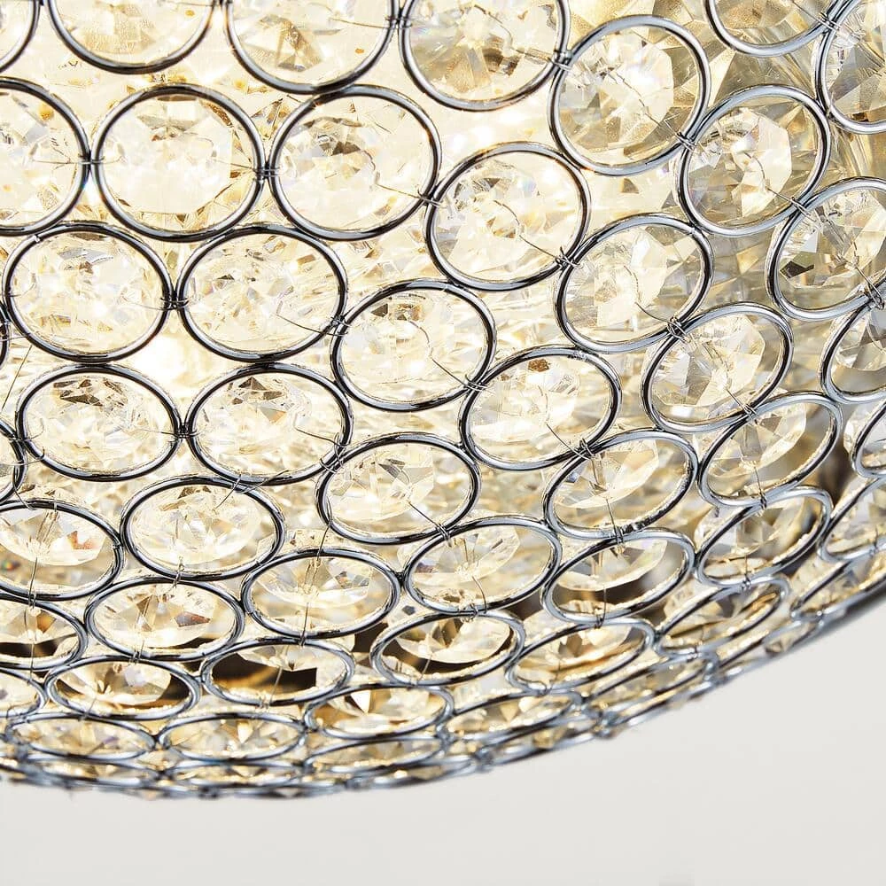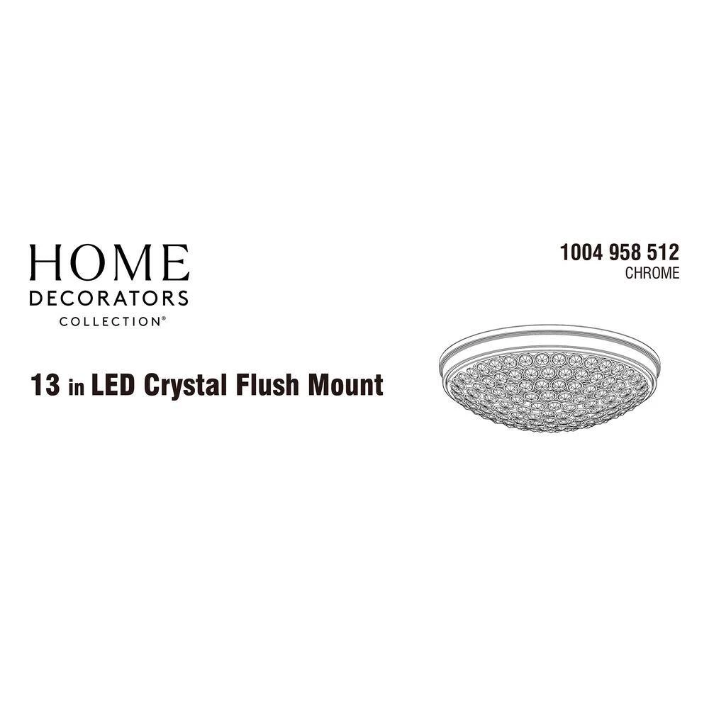 Add an elegant look to your decor with this chrome and crystal flush mount. The etched crystals radiate light in all angles creating a beautiful ambiance. The long-lasting LED technology provides light output equivalent to 120-Watt of traditional incandescent lighting, while using less than 20% of the energy for year round savings. Enjoy a 5-year warranty and a rated life of 45-years or 50,000-hours of continuous use. The ENERGY STAR certified light source is maintenance free with no bulbs to change. Its even easy to install with a provided bracket and only requires 1 person to install.