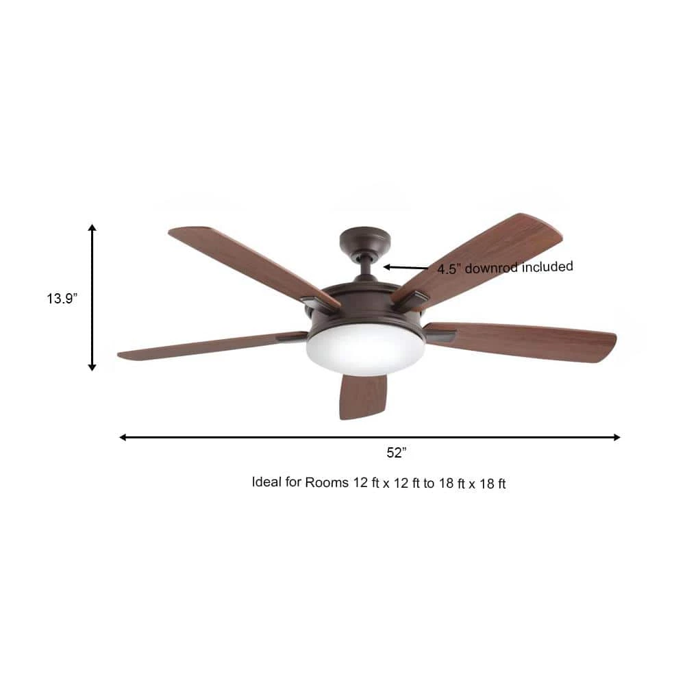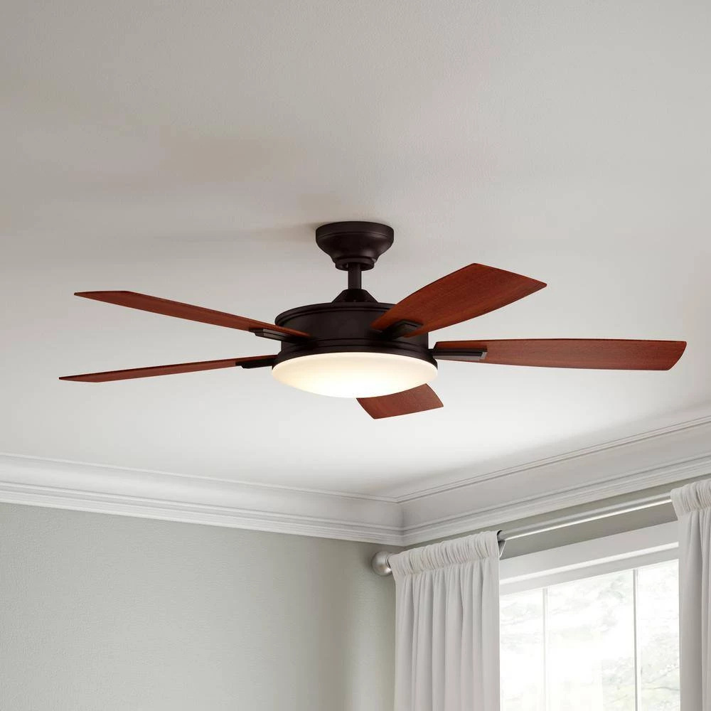 The Daylesford 52 in. Oil-Rubbed Bronze Ceiling Fan features a wide-diameter hub with integrated LED light to impart a sophisticated, modern look to your decor. This fixture from Home Decorators Collection features 5-reversible blades – dark walnut on one side and medium maple on the other – that produce abundant airflow to keep your indoor space superbly ventilated. Whether in low, medium or high speed, this stylish ceiling fan is whisper-quiet and wobble-free for utmost functionality.