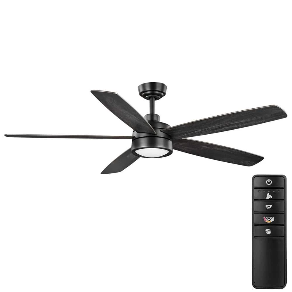 The 60 in. Driskol Smart Ceiling Fan from Home Decorators Collection is the perfect way to add a ceiling fan to your smart home ecosystem. This fan offers a variety of control options: remote control (included), control via your smart device (phone or tablet) with the HubSpace App or voice control with Amazon Alexa or Google Assistant. The integrated 21-Watt LED offers ample lighting and the ability to choose from 6 different light temperature settings ranging from 2700K to 6500K. The rich, matte black finish is complemented with five reverisible blades in natural oak or espresso stained oak finishes. The frosted shatter resistant plastic shade that mimics frosted glass with the added benefit of not breaking if dropped during cleaning. Designed for indoor use in great rooms, the Snyder features a quiet, yet powerful, 5-speed reversible DC motor for year-round comfort and energy efficiency. DC motor fans are 70% more energy efficient than AC motor fans (when comparing efficiency (CFM/W) of DC vs AC motors in published FTC Energy Guides for ceiling fans).
