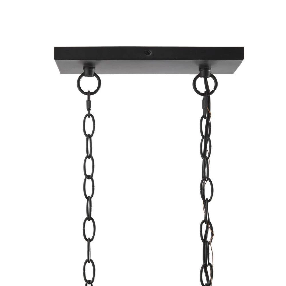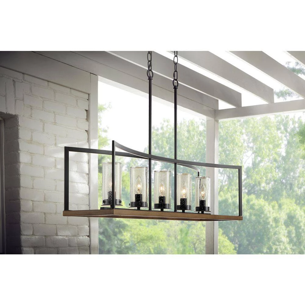 Warm maple toned wood accents and matte black metal elevate the farmhouse to a modern, contemporary destination. The 5 lights (60-Watt base) are accented with seeded glass hurricane covers to further elevate the-piece. An artisinal looking fixture that can be right at home indoors or out. Damp rated and appropriate for outdoor installation. Easy installation with an adjustable drop.