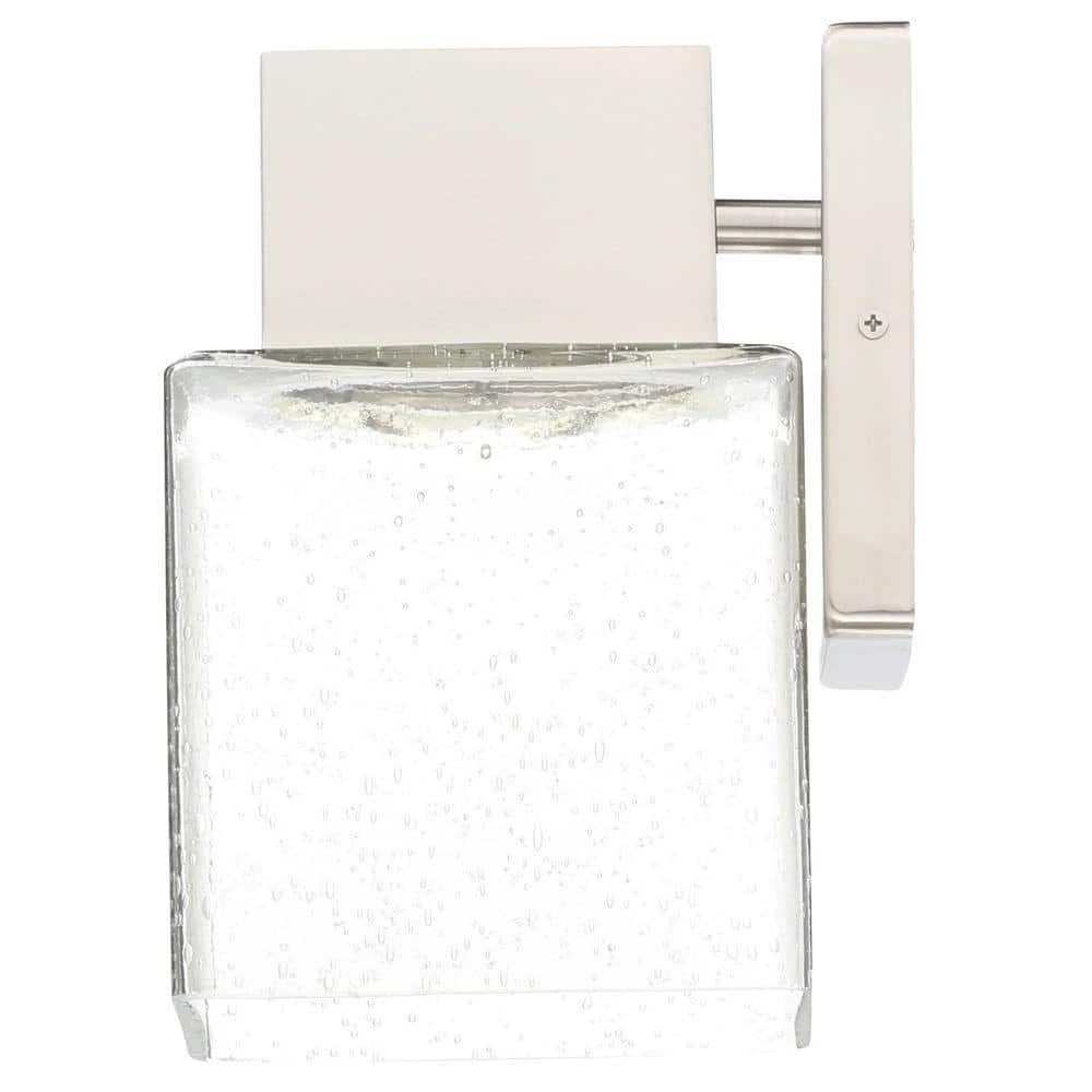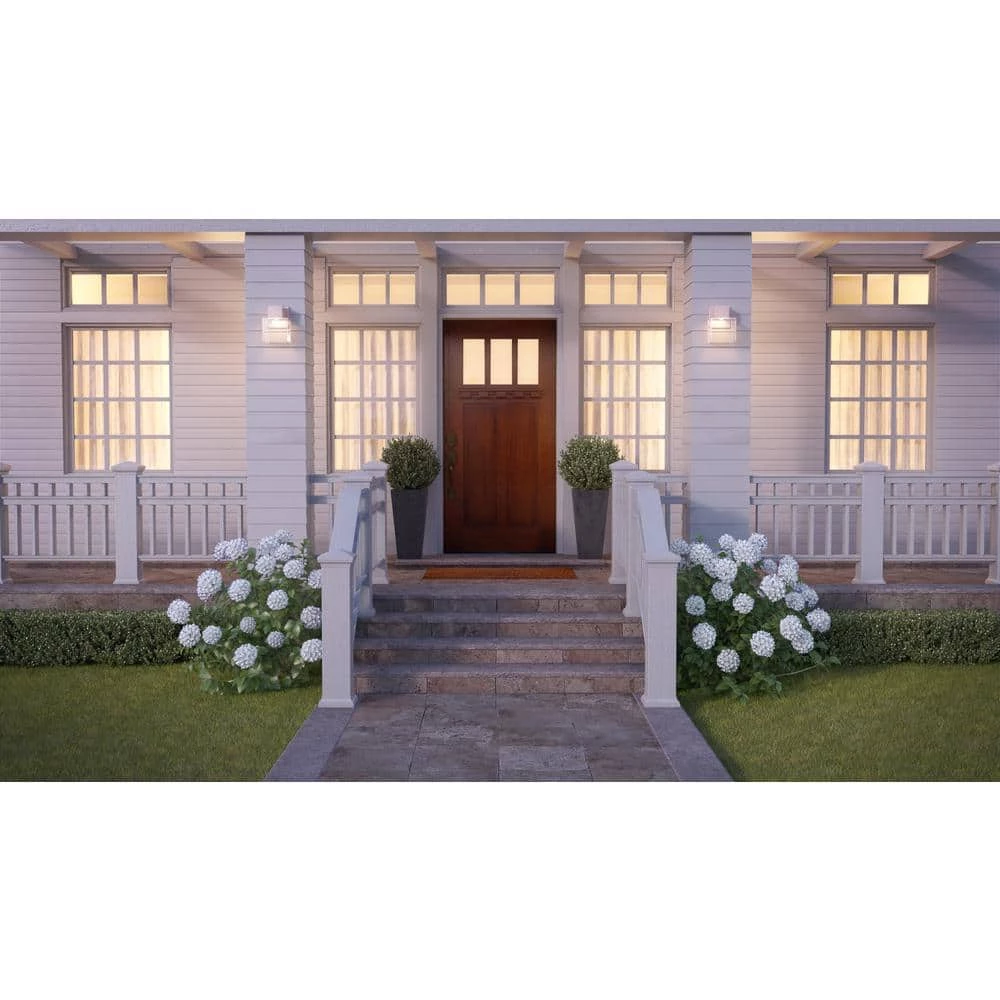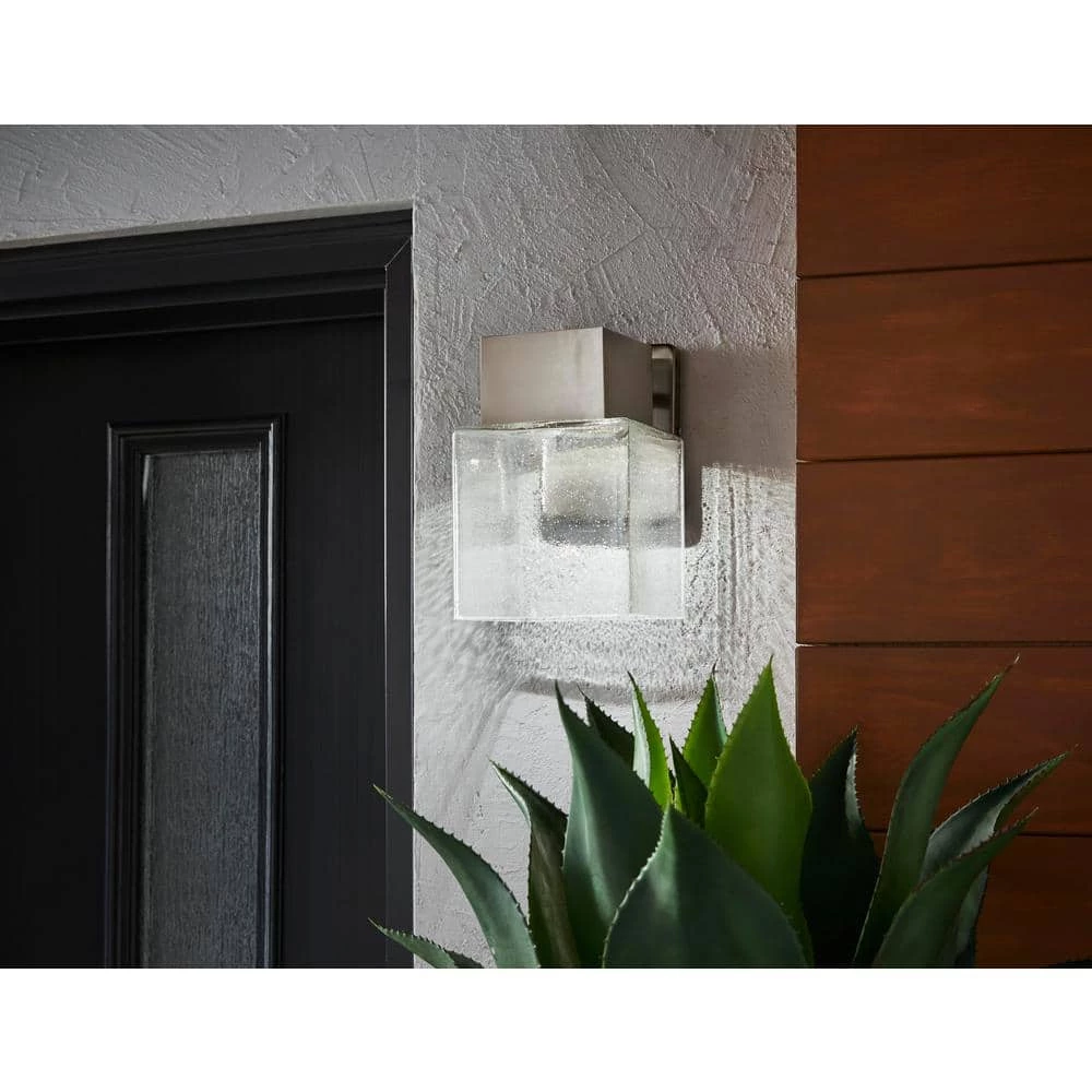 The Essex LED Wall Lantern from Home Decorators Collection is designed with a low-wattage LED light source that never needs replacing, producing the same light as a regular bulb using a fraction of the electricity. This outdoor wall lantern is presented in a striking contemporary style that complements transitionally styled homes, exquisitely detailed with a brushed nickel finish and clear, seedy glass shade. Weather-resistant with an added waterproof seal, this lantern provides up to 35,000 hours of illumination, offering the ultimate in outdoor lighting convenience.