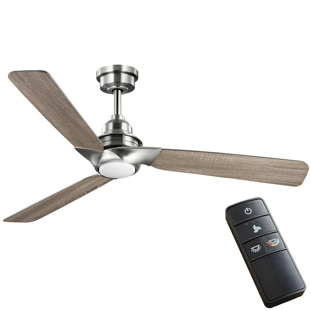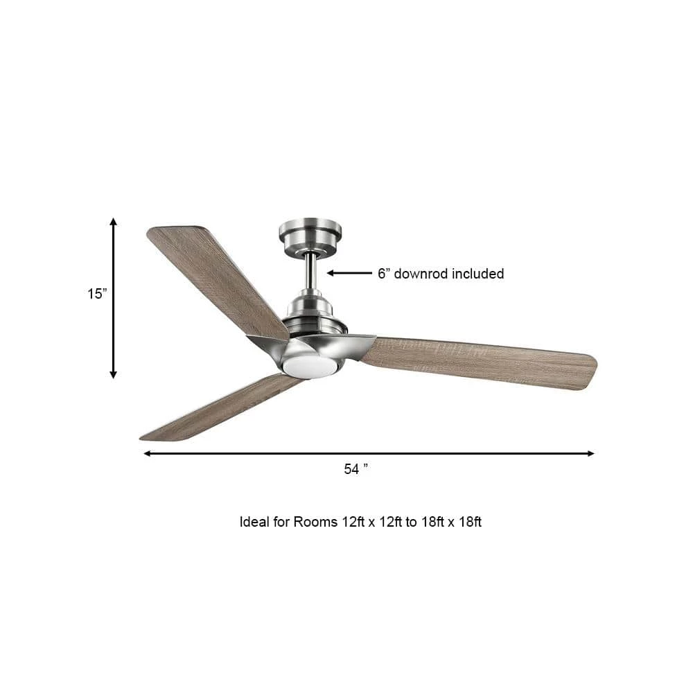 Modern styling and technology are combined to produce the stunning 54 in. Ester ceiling fan from Home Decorators Collection. The Ester fan has a sleek brushed nickel finish paired with 3 vintage aged pewter finish blades and complemented by frosted white shatter resistant plastic light shade. The integrated 21-Watt LED light kit is dimmable and allows you to choose from 6 different color temperature settings ranging from warm white (2700K) to Daylight Deluxe (6500K). Convenient operation is at your finger tips with the included remote to control the fan’s 3-speeds and light. This fan looks great in large room indoor settings and is damp rated for use in covered outdoor spaces like porches and patios.