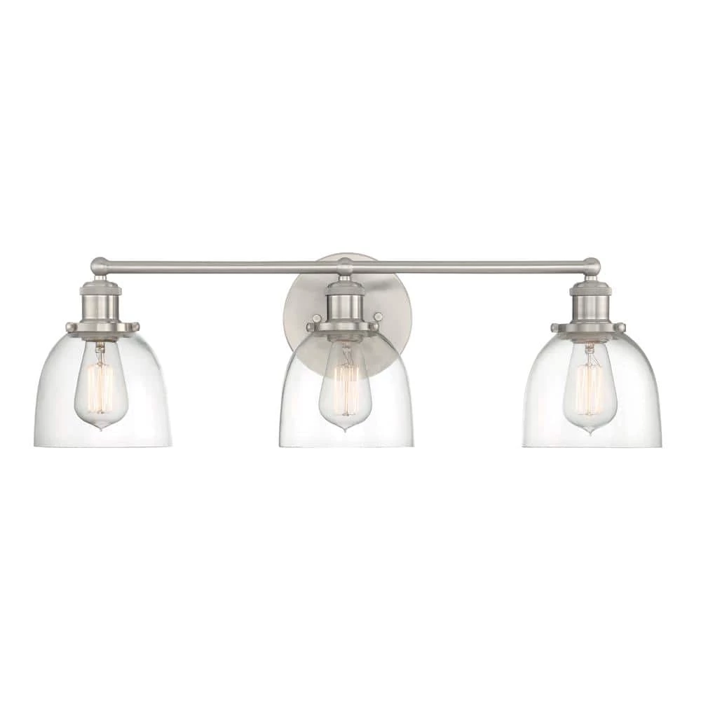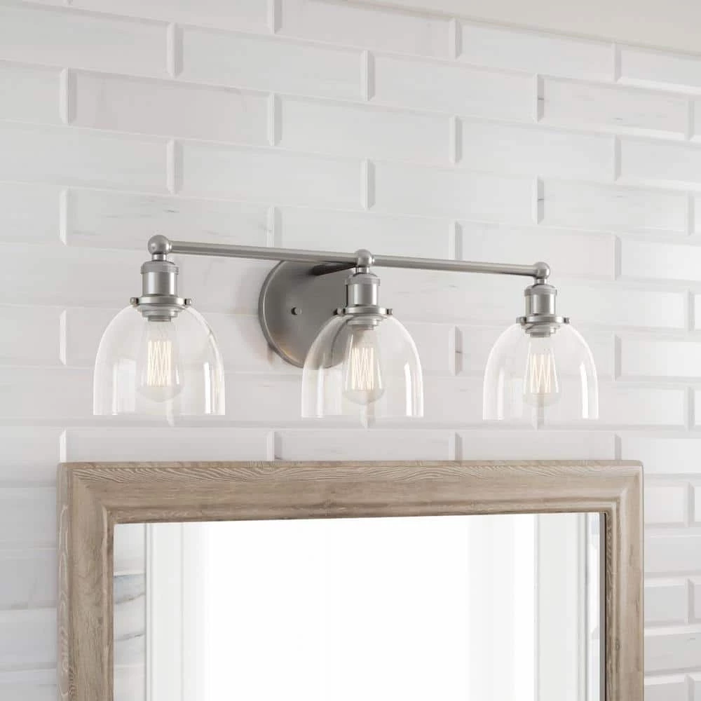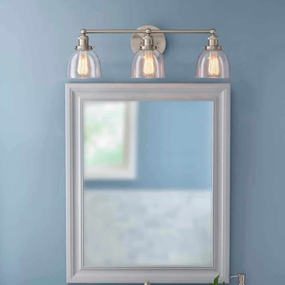 This Home Decorators Collection bath vanity light fixture offers smooth lines with a modern design. The protective brushed nickel finish provides a unique look to this light fixture. The clear glass shades provide clean illumination. These bath fixtures are built from steel to last for years to come and are designed for damp locations. These light fixtures come with everything you need for easy installation with the shade in the up or down position. This bathroom lighting vanity uses 3 screw based light bulbs up to 60-Watt each.