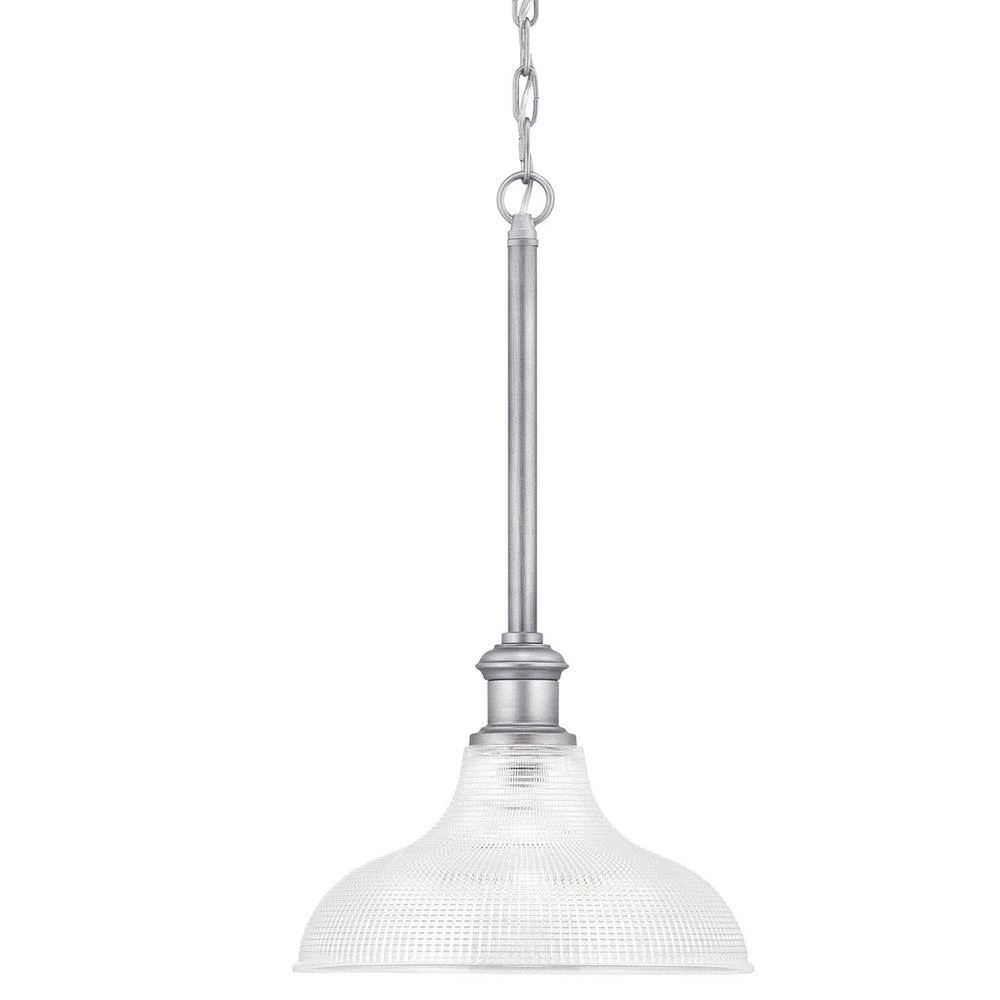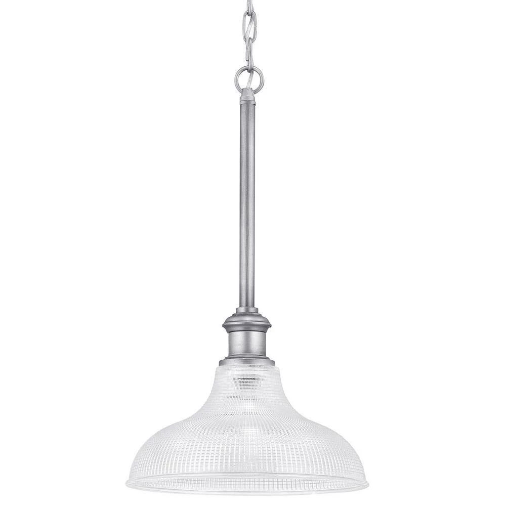 The Foxcroft collection is perfect for a variety of lighting spaces. The 1-light antique nickel pendant provides a touch of flair to your favorite space without going overboard. The clear prismatic glass shade brings richly textured detail to its modest design. The Foxcroft pendant accommodates one 60-Watt incandescent bulb (not included).