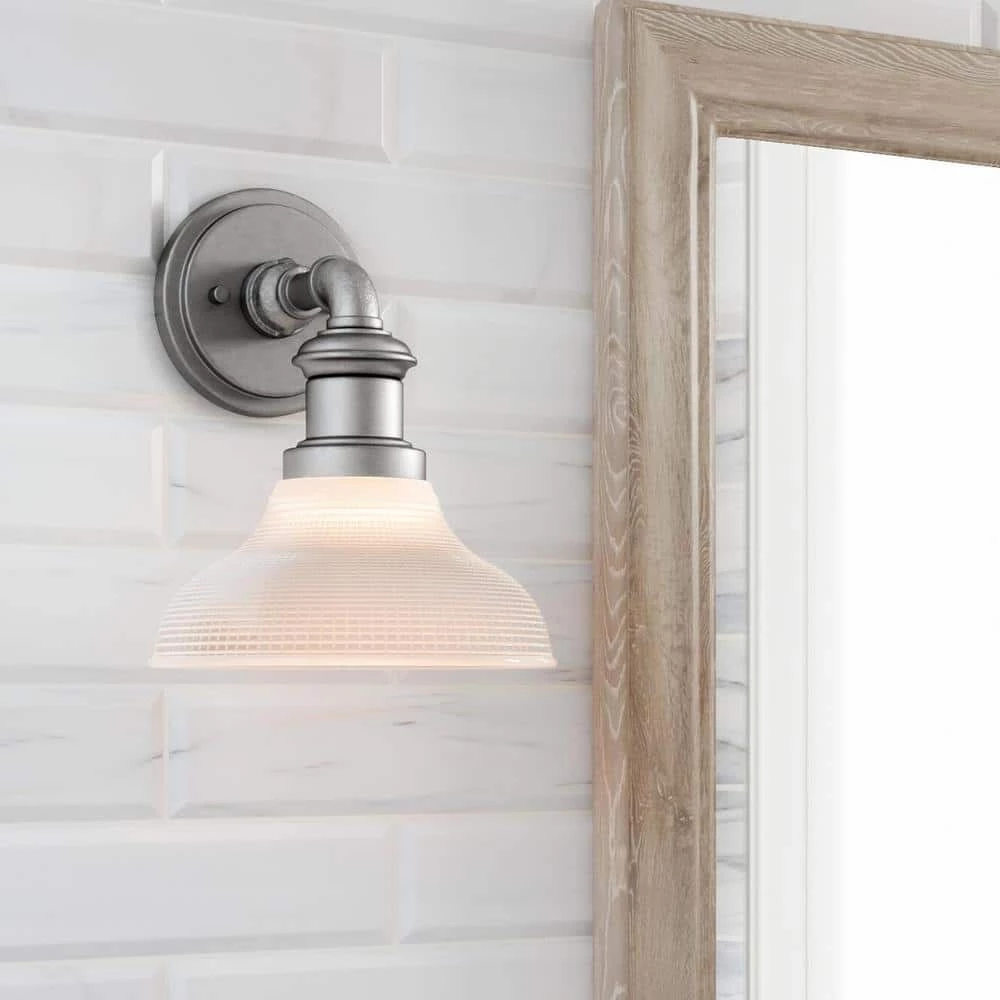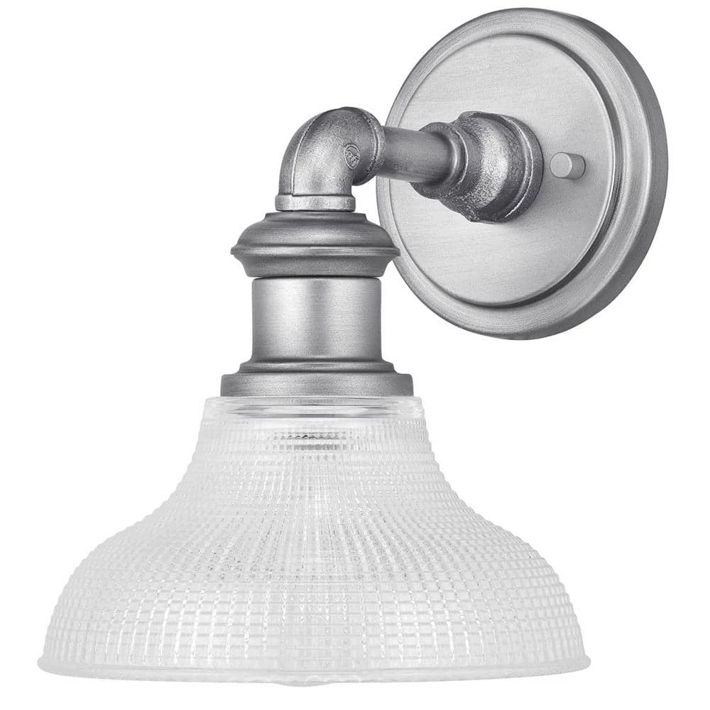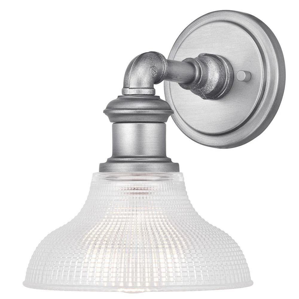 The Foxcroft collection is perfect for a variety of lighting spaces. The 1-light antique nickel sconce provides a touch of flair to your favorite space without going overboard. The clear prismatic glass shade brings richly textured detail to its modest design. The Foxcroft sconce accommodates one 60-Watt incandescent bulb (not included).