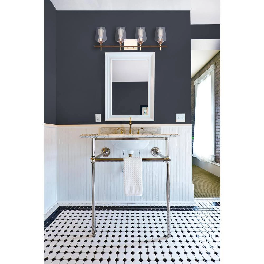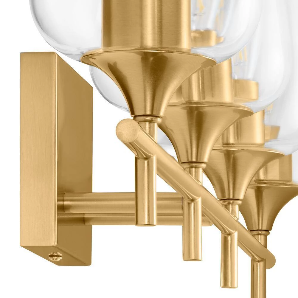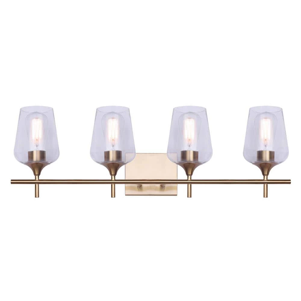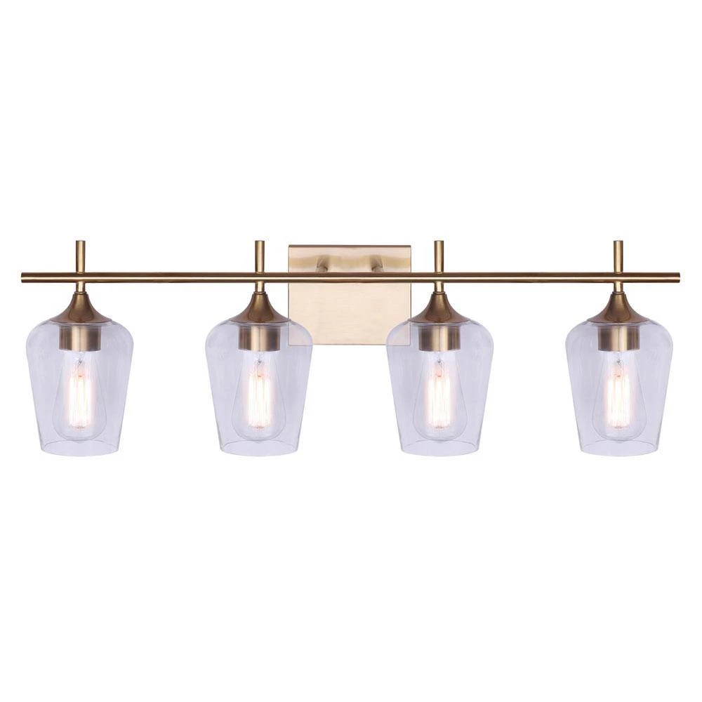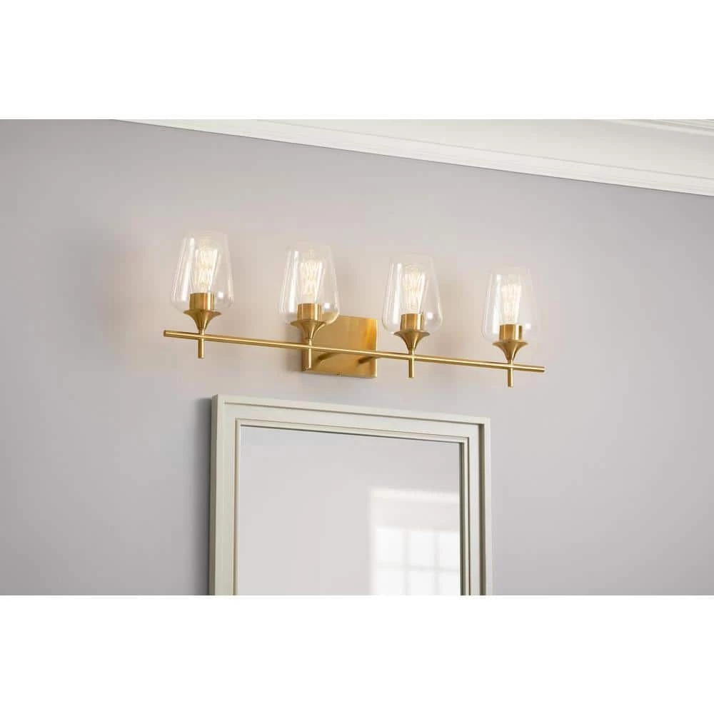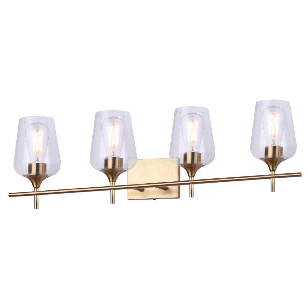 Elevate your space with this Gabrielle 4-Light Gold Vanity Light with Clear Glass Shades. The gold finish brings an elegant touch. It features bell-shaped clear wine glass shades and a solid metal bar. Add this to your bathroom or powder room.