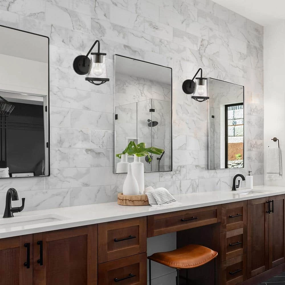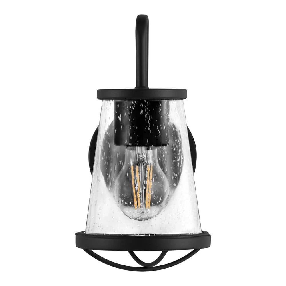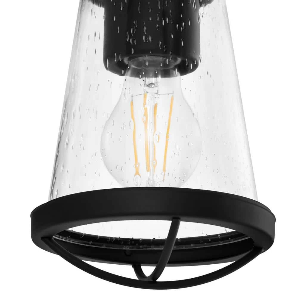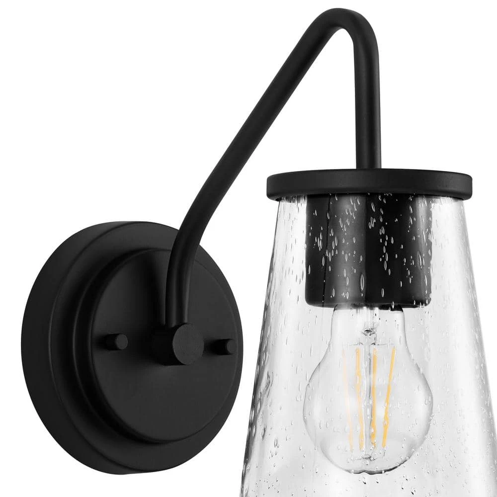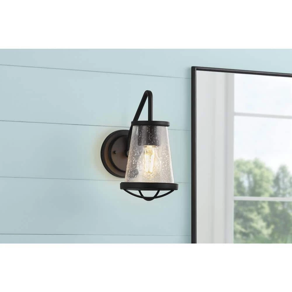 This Home Decorators Collection Wall Sconce is a perfect example of the Industrial Style redesigned for today’s home. With its simple design and Matte Black Finish, this fixture will be the star of your home. The unique clear seeded glass shade highlights the recommended vintage lamp and brings sophisticated warmth to your interior.