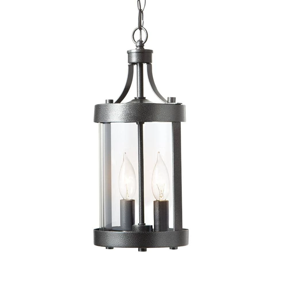 The Glastonbury Two-Light Outdoor Pendant Light adds a rustic touch to your home. It features an aged iron finish and a clear glass rounded shade that looks perfect in entryways and on porches and deck areas. This fixture also includes a matching chain that can be adjusted to your desired height, plus it’s sloped ceiling compatible.
