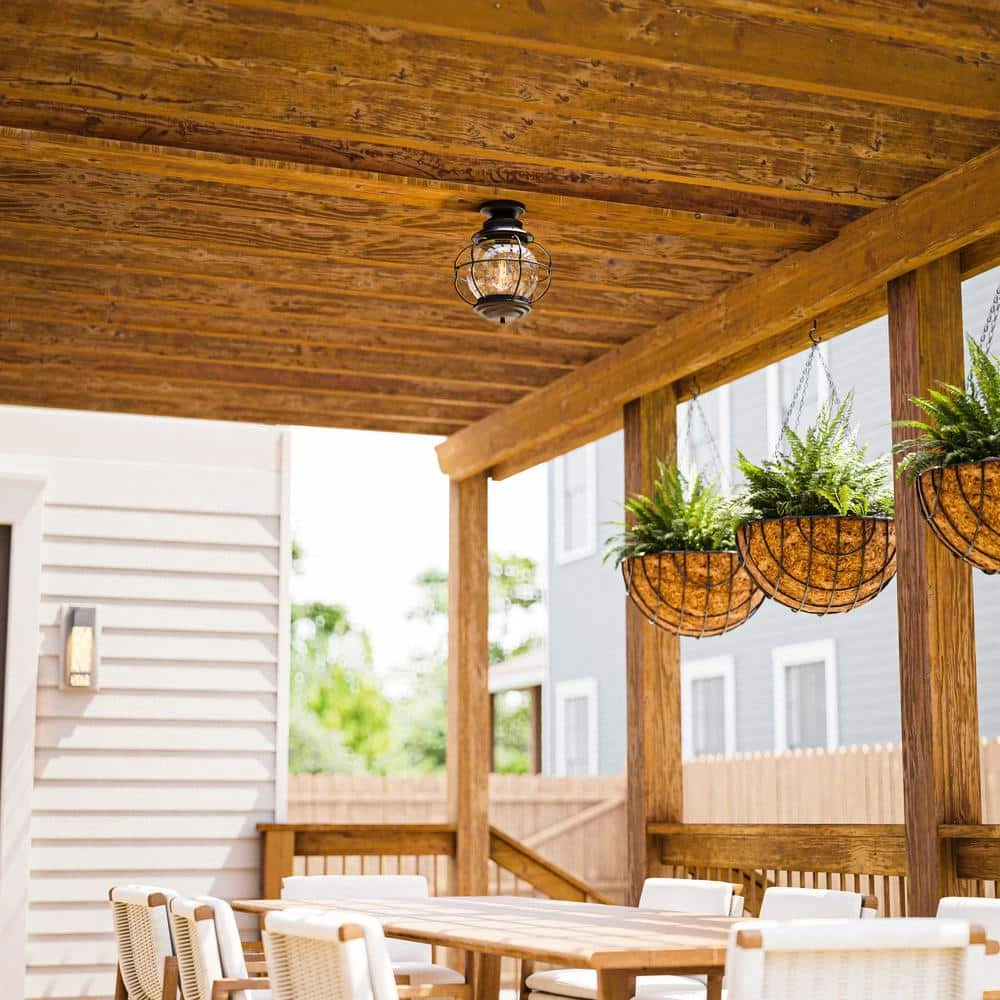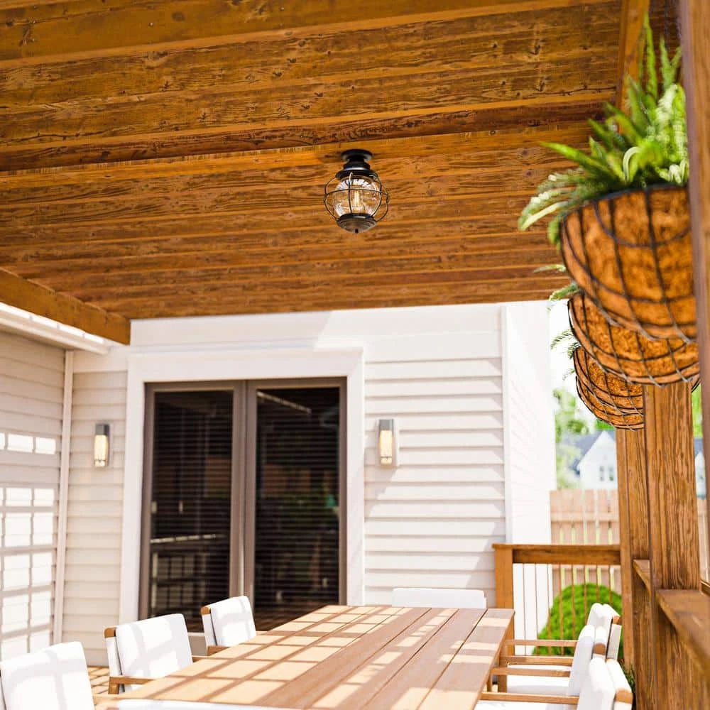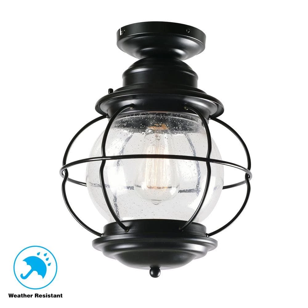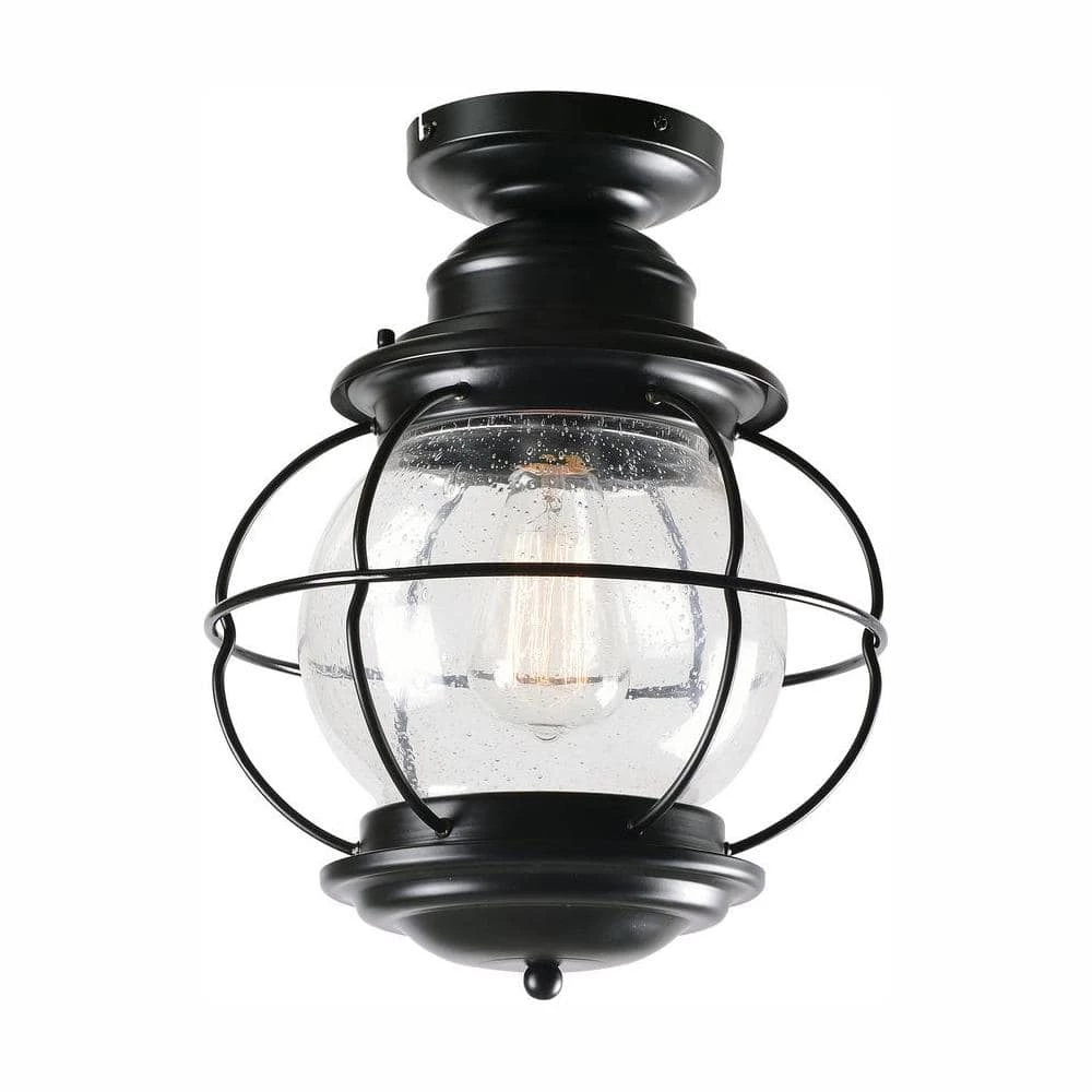 Coastal Black 1-Light Semi Flush Lantern with Caged Seeded Glass. Caged glass offers protection to the fixture as well as a nautical look. Works well with most design themes.