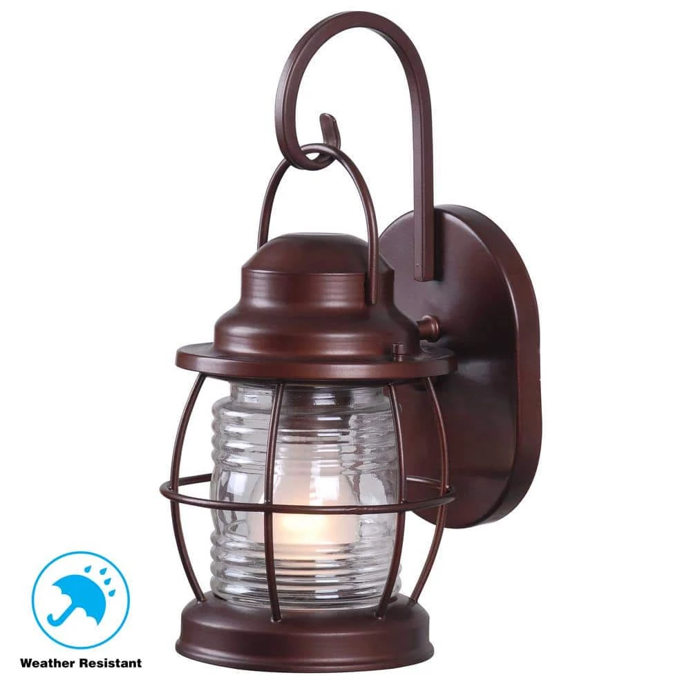 Get a fresh take on a coastal cottage classic with the exclusive Harbor Outdoor Small Wall Lantern in Copper Bronze from Home Decorators Collection. Channeling traditional colonial gas lanterns, this light features a bronze copper finish and luxurious clear ridged glass shade perfect for your modern home exterior. For ample outdoor lighting, use a single 60-Watt bulb (sold separately).