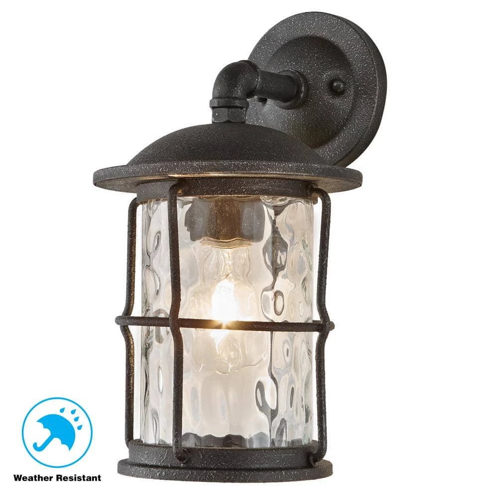 This one-light wall lantern is sure to enhance any home’s curb appeal. The frame features a round, cylinder-shaped water glass shade. Fixture is finished in a Gilded Iron.