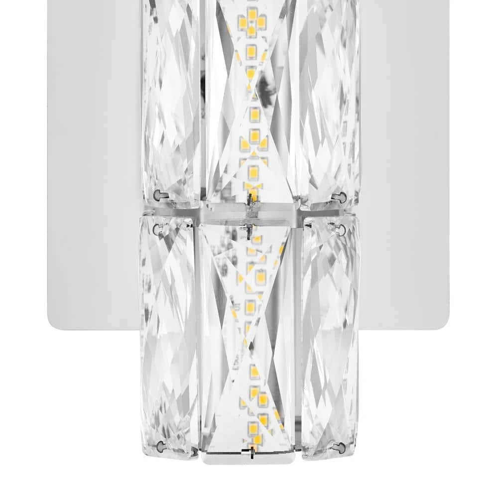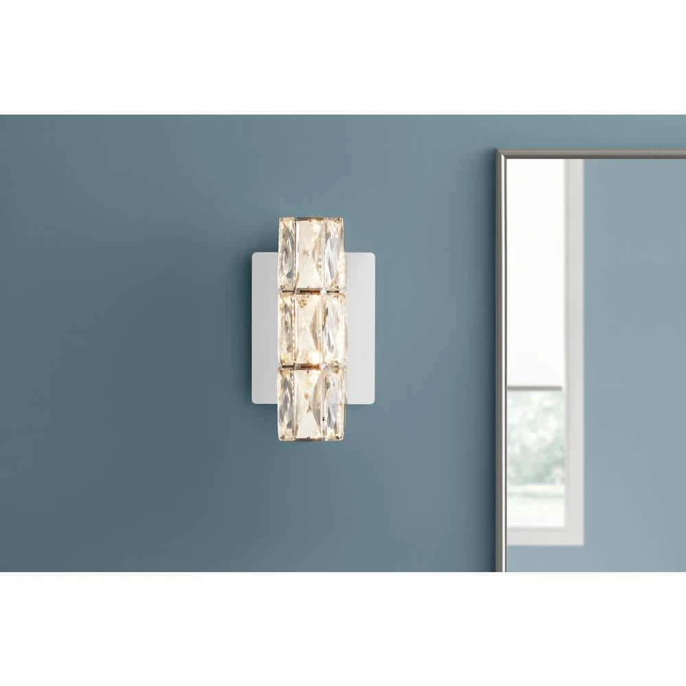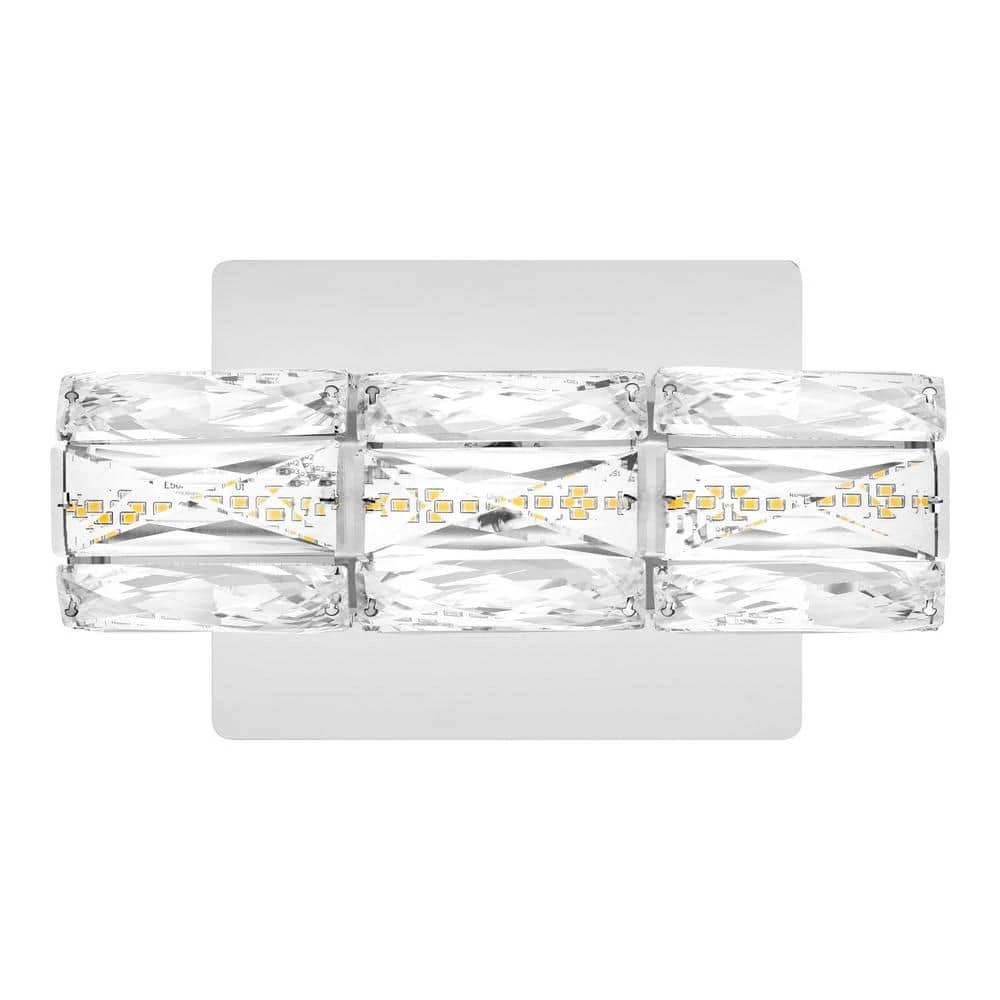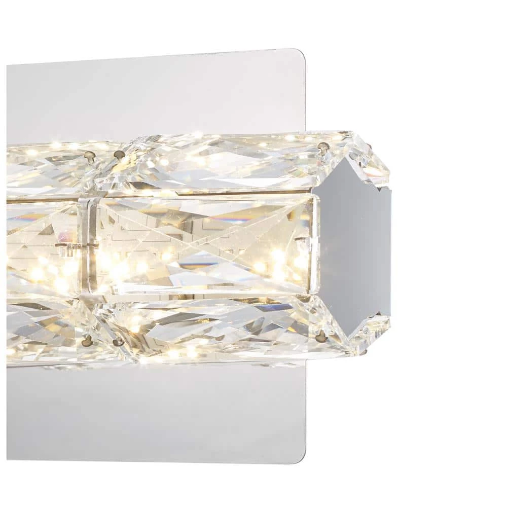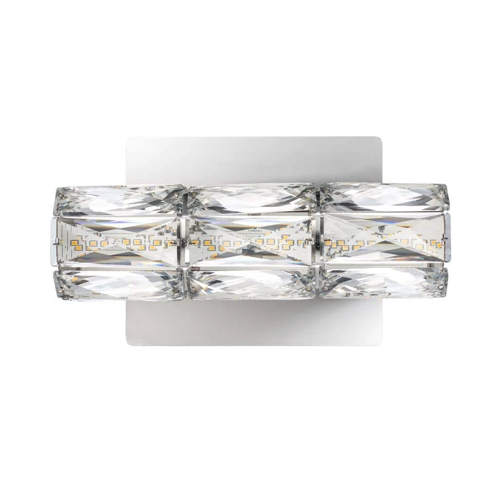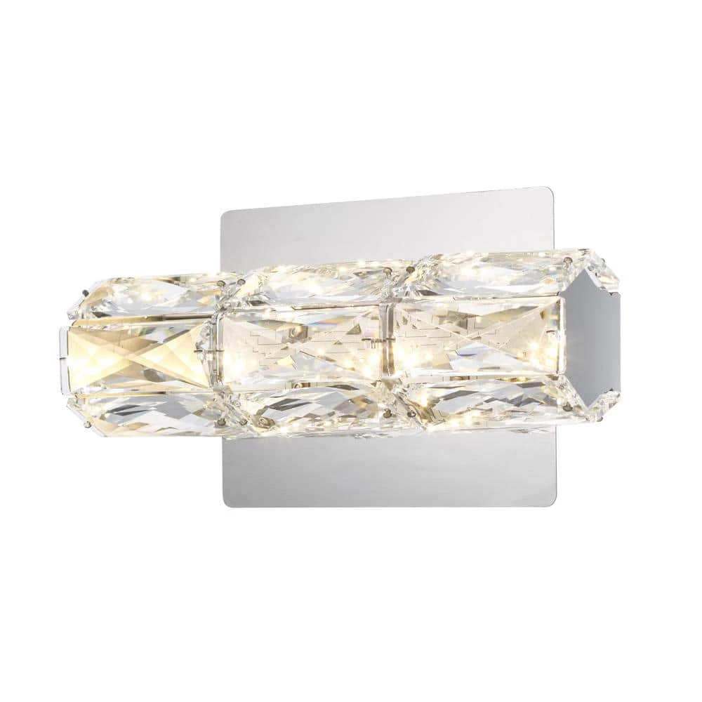 The Keighley Collection from Home Decorators offers modern, crystal shaded interior lighting for every room of the house. The Keighley LED wall sconce features a polished chrome finish and 9 in. linear shade made of glamorous crystal plates. Light from the integrated LEDs sparkles beautifully out from the shade while the polished chrome reflects the light for even brighter illumination. The integrated LED module is energy efficient and low maintenance as you will never have to change bulbs for the life of the fixture. This 9 in. wall light is the smallest vanity light in the Keighley bathroom collection and is ideal for use in small rooms or in larger rooms when used in multiples on either side of a vanity sink or mirror. It can be mounted vertically or horizontally for a customized look. for coordinating crystal lighting, shop the Keighley Collection.
