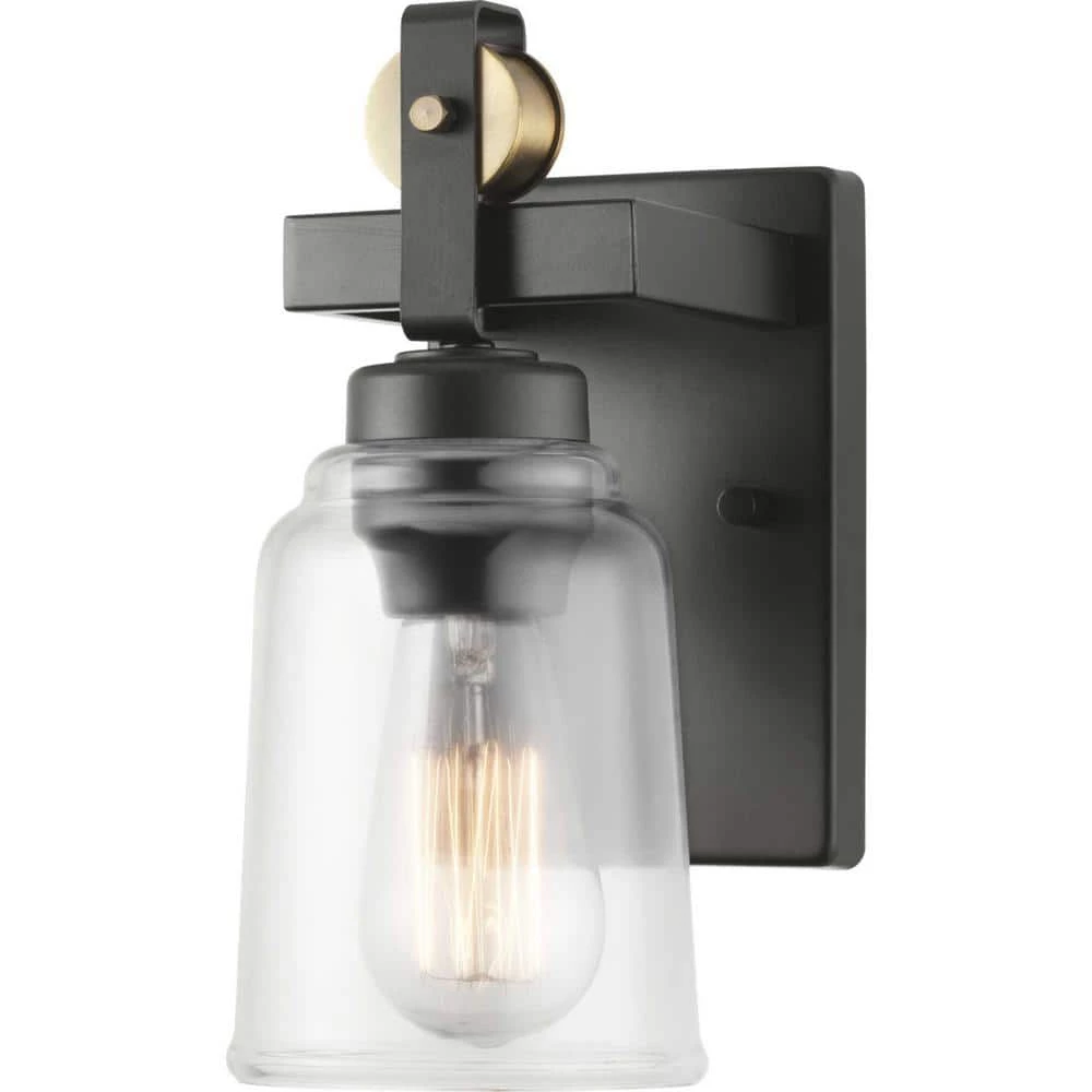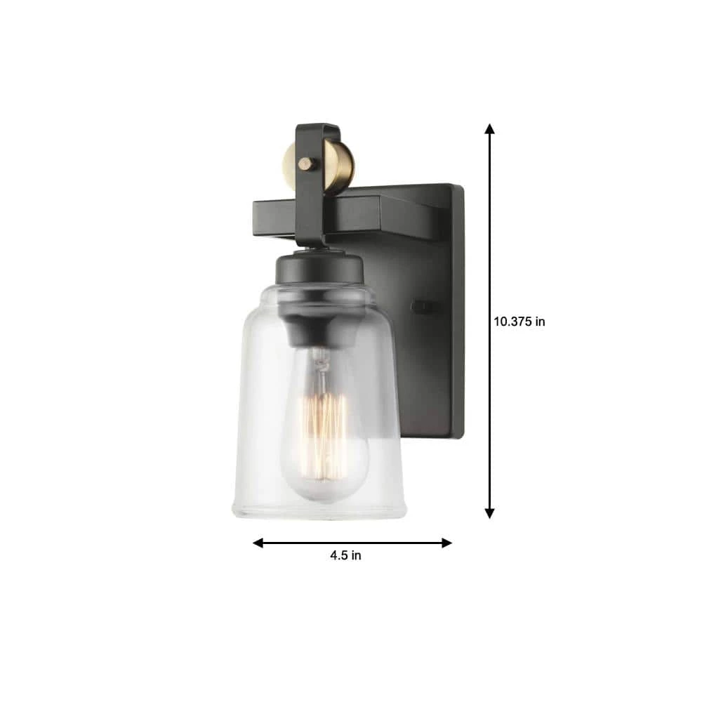 Influenced by a mid-20th century vintage industrial design, the Knollwood lighting collection has clear glass shades that will perfectly highlight the classic Edison bulb. The 1-light antique bronze wall sconce offers transitional style with timeless appeal. Incandescent medium-base blubs not included.