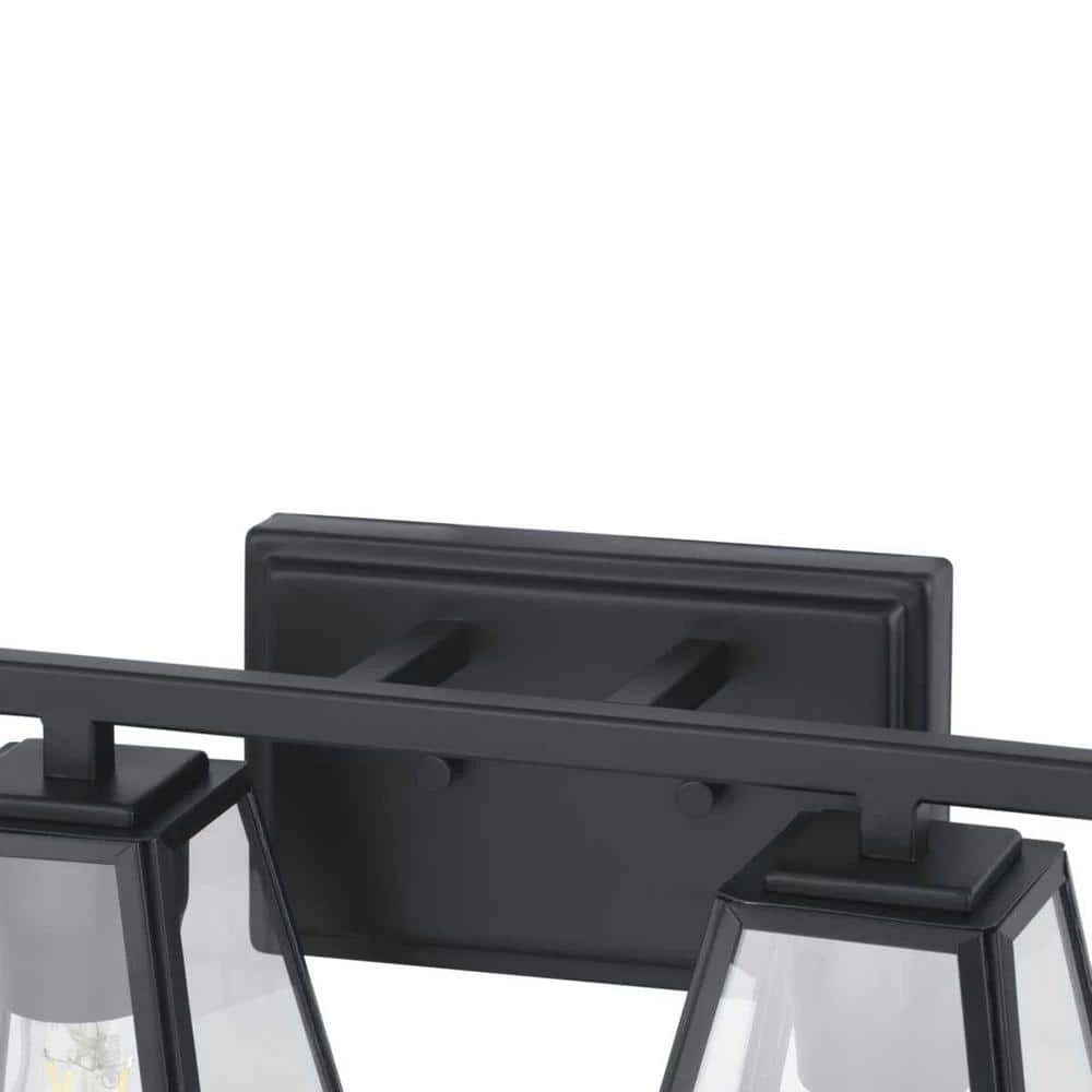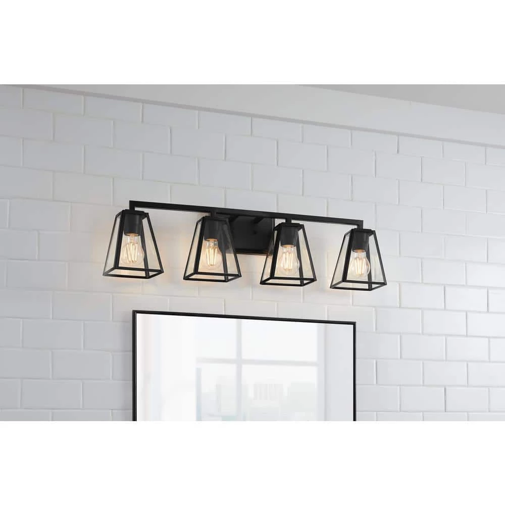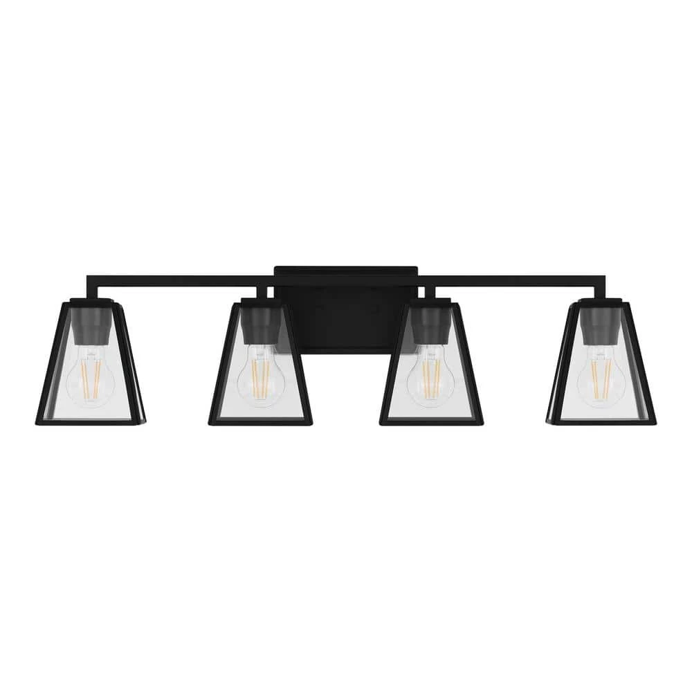 Crisp lines and geometric forms create a must-have design with the Mackenzie 4-Light Bath Vanity Light. A rectangular backplate and horizontal bar anchor the open-frame shades surrounding the light sources. A classic matte black finish completes the light fixture, making it ideal for any transitional style setting in need of a home decor upgrade. Bulbs not included.