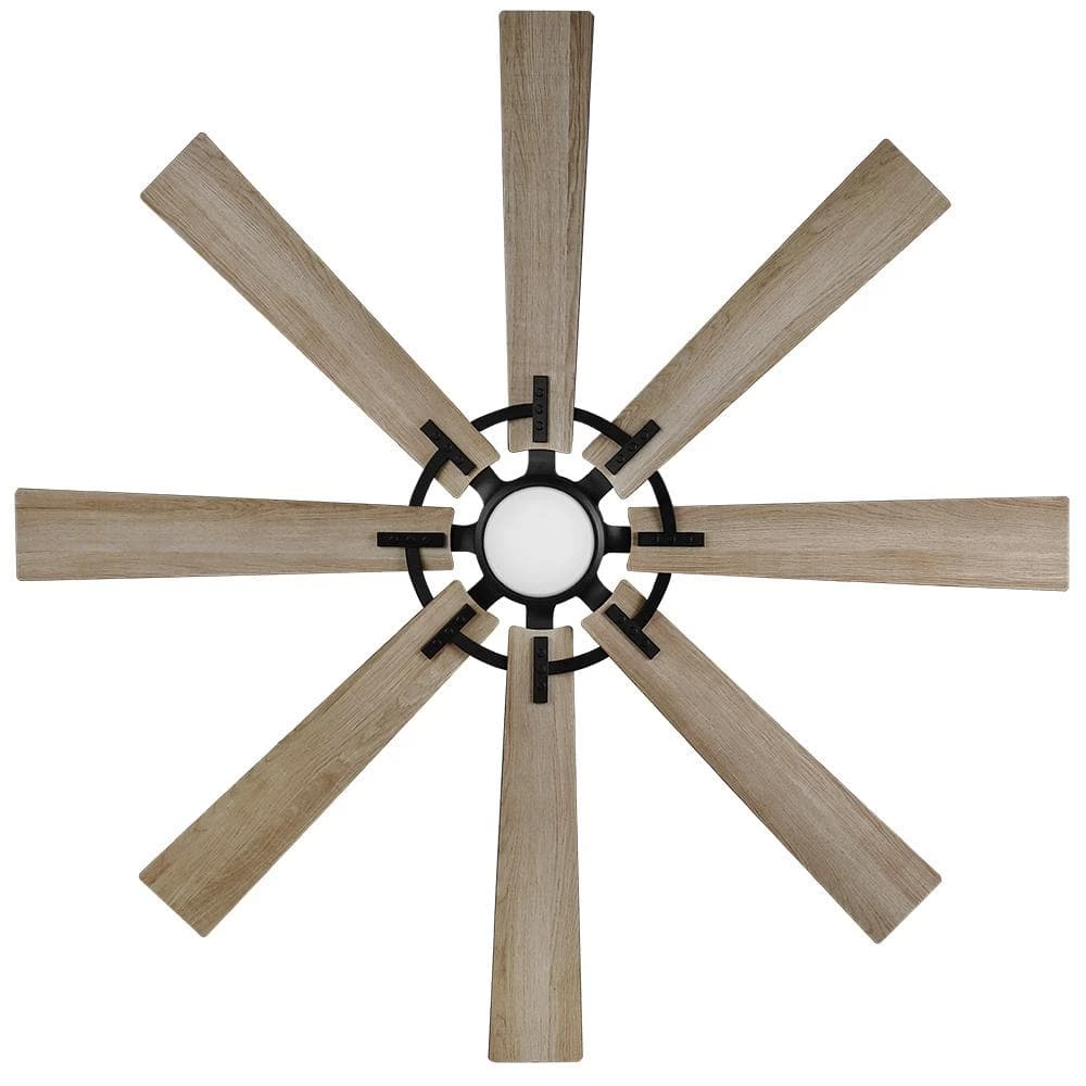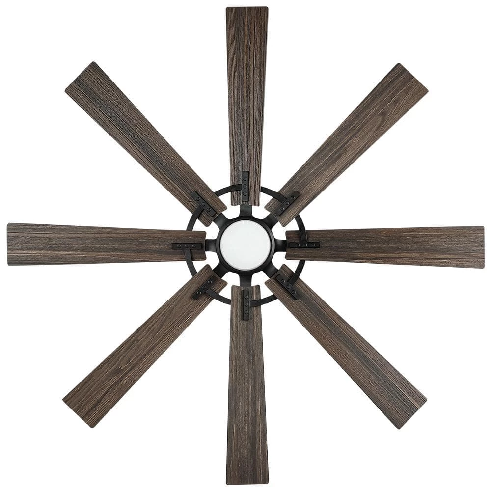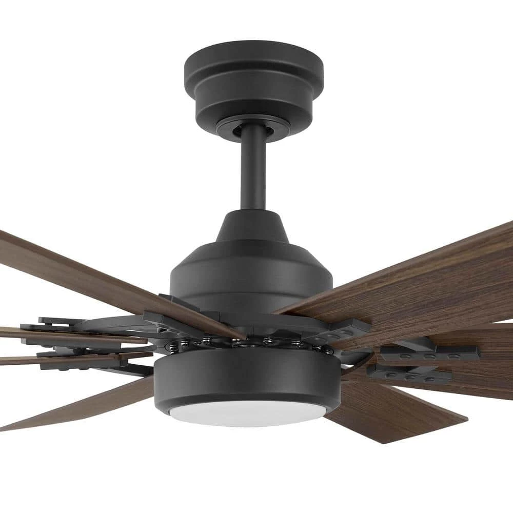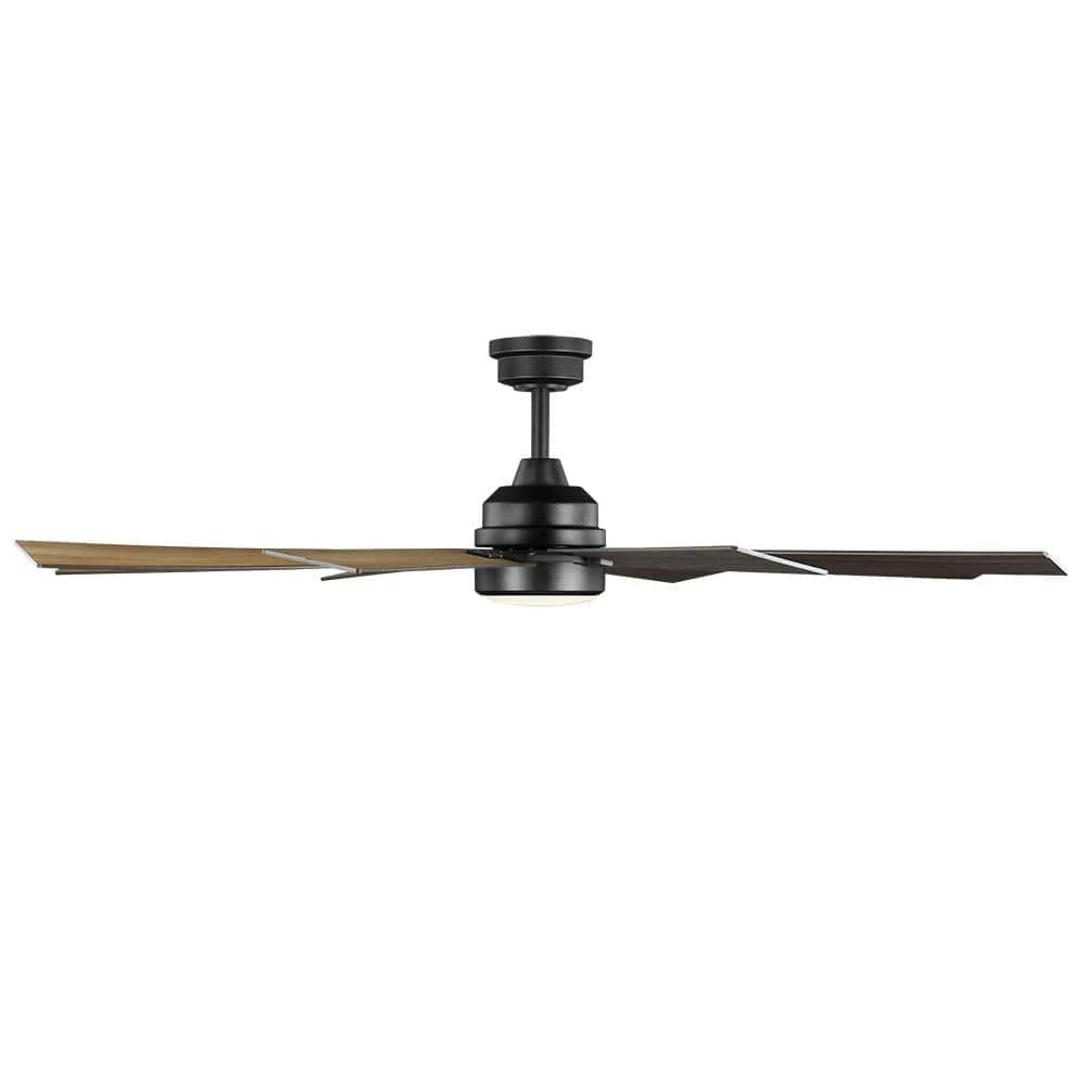 Stunning. Wow. Incredible. Just some of the comments you may hear when friends and family see your new 60 in. Makenna ceiling fan by Home Decorators Collection. This gorgeous windmill style fan features a powerful DC motor and 8 reversible blades to circulate air in great room spaces and covered outdoor locations like porches and patios. The fan’s stark matte black finish is complemented with a frosted glass light shade and reversible blades in distressed walnut and natural aged oak finishes to blend with many of today’s decor trends. The versatile integrated LED light is dimmable and allows you to choose between is different color temperature settings ranging from warm white (2700K) to daylight deluxe (6500K) to complement your homes lighting. Convenient operation is at your fingertips with the included remote that controls the fan’s 5 speeds, lighting options, and rotation direction. DC motor fans are 70% more energy efficient than AC motor fans (when comparing efficiency (CFM/W) of DC vs AC motors in published FTC Energy Guides for ceiling fans).