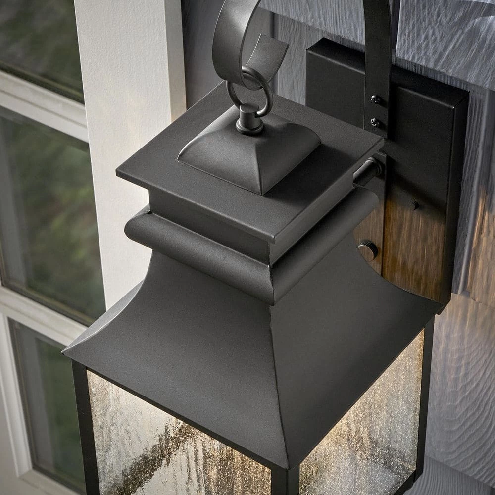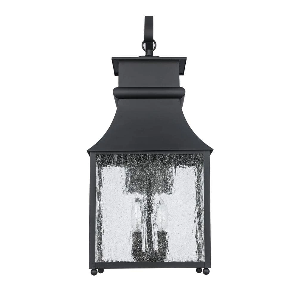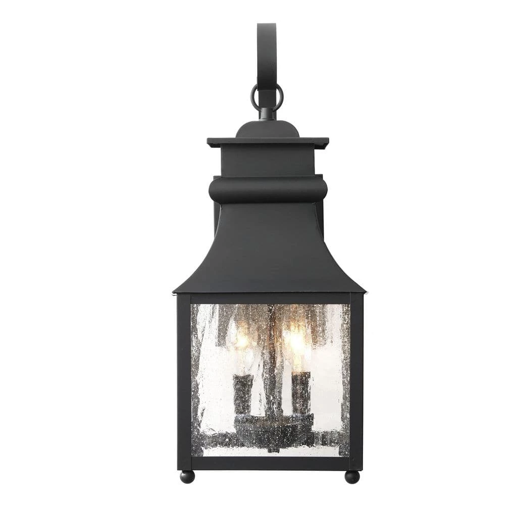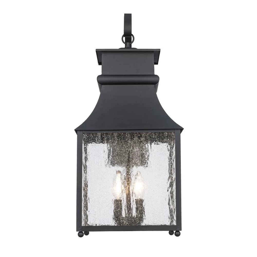 The Rainbrook collection from Home Decorators features craftsman outdoor lighting designed to add curb appeal and functionality to your home’s exterior living spaces. The Rainbrook 24 in. wall light is the largest in the collection. The fixture has a square body, is finished in matte black and includes seeded glass windows on each of the 4 sides. The fixture is open at the bottom to allow for directional lighting below, as well as easy access to change the bulbs when necessary. There are 2 candelabra bulbs that are housed inside the piece, offering enough light output for medium to larger sized porch areas and outdoor walkways. The lantern style body appears to “hang” from a decorative scroll arm, while remaining firmly affixed to the rectangular wall plate to hold up in harsh wind and weather. This wall sconce looks great as a single unit and can be hung in multiples on either side of a garage door or gated entryway. Shop the Rainbrook Collection for coordinating outdoor lights.