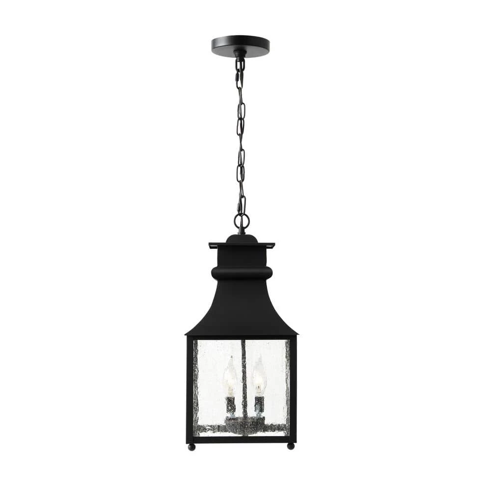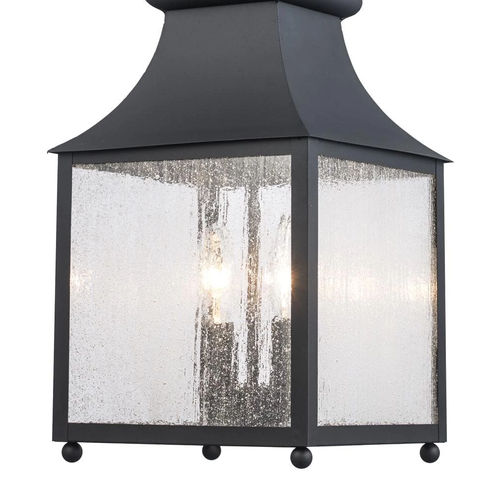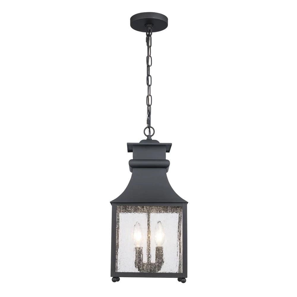 The Rainbrook collection from Home Decorators features craftsman outdoor lighting designed to add curb appeal and functionality to your home’s exterior living spaces. The 18-inch tall pendant light has a square body, is finished in matte black and includes seeded glass windows on each of the squared sides. The fixture is open at the bottom to allow for directional lighting below, as well as easy access to change the bulbs when necessary. There are 2 candelabra bulbs that are housed inside the piece, offering enough light output for smaller to medium sized porch areas and backyard patios. The pendant body hangs from a matching black chain, allowing for height adjustability and sloped ceiling compatibility. Shop the Rainbrook Collection for coordinating outdoor lights.
