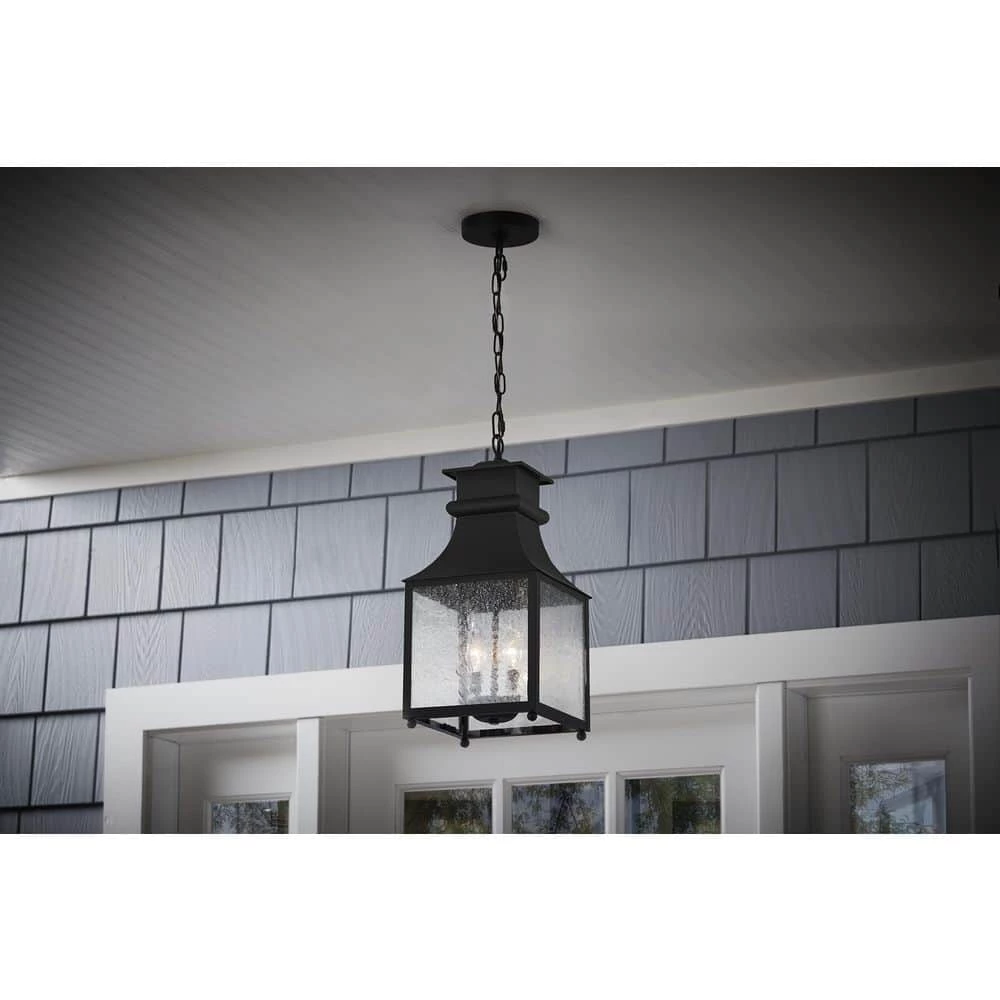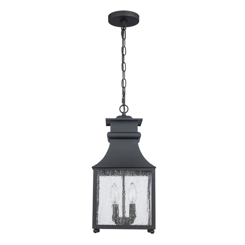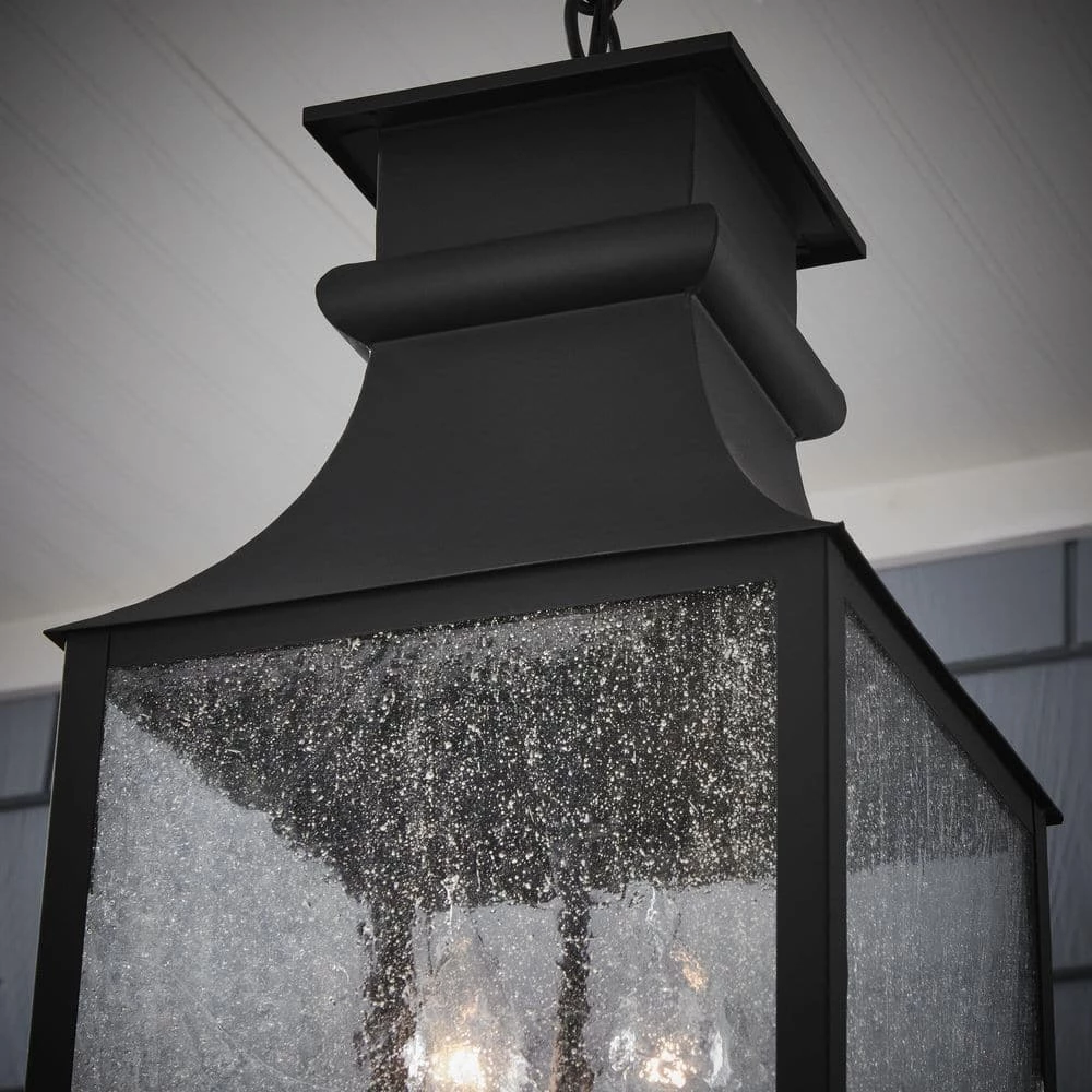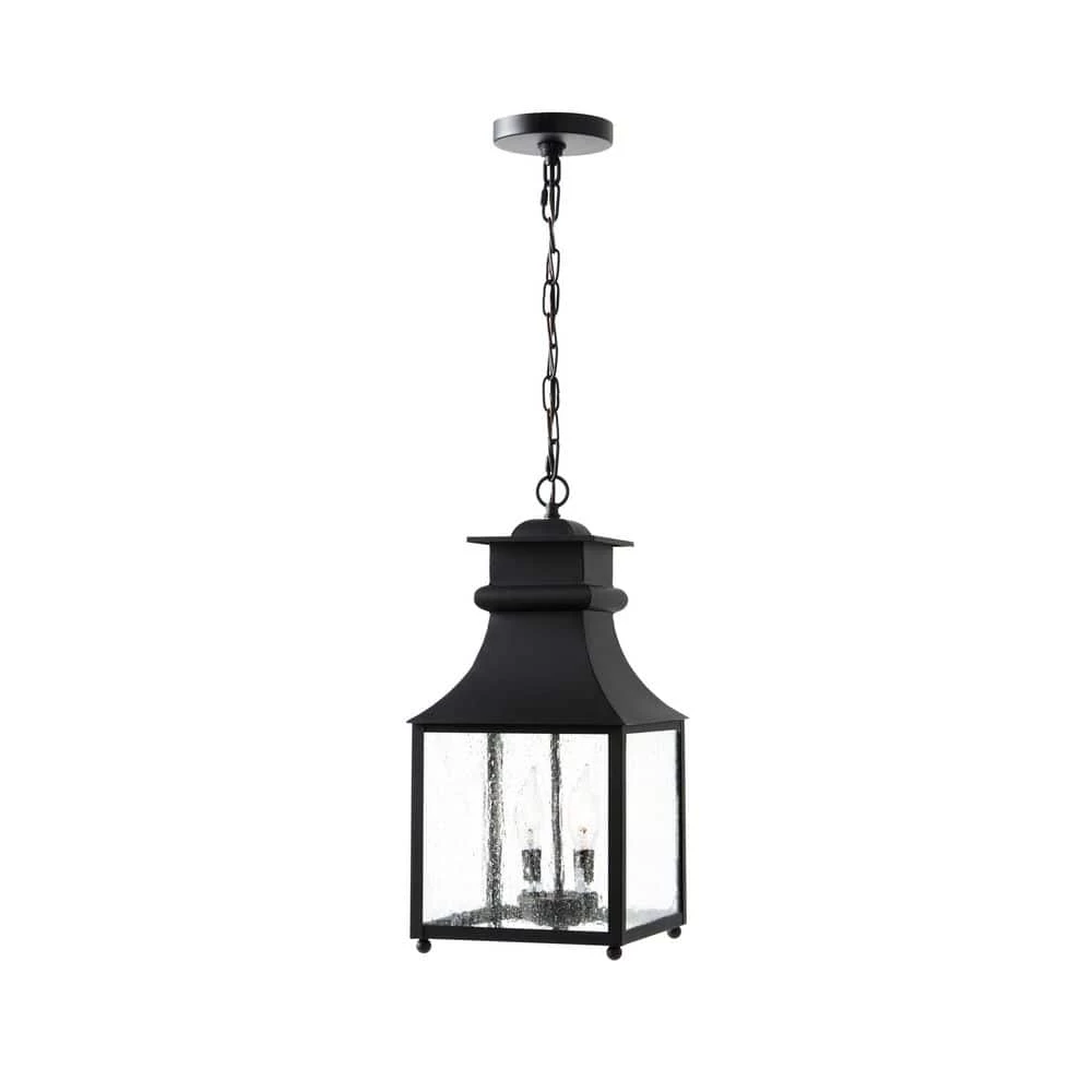 The Rainbrook collection from Home Decorators features craftsman outdoor lighting designed to add curb appeal and functionality to your home’s exterior living spaces. The 18-inch tall pendant light has a square body, is finished in matte black and includes seeded glass windows on each of the squared sides. The fixture is open at the bottom to allow for directional lighting below, as well as easy access to change the bulbs when necessary. There are 2 candelabra bulbs that are housed inside the piece, offering enough light output for smaller to medium sized porch areas and backyard patios. The pendant body hangs from a matching black chain, allowing for height adjustability and sloped ceiling compatibility. Shop the Rainbrook Collection for coordinating outdoor lights.
