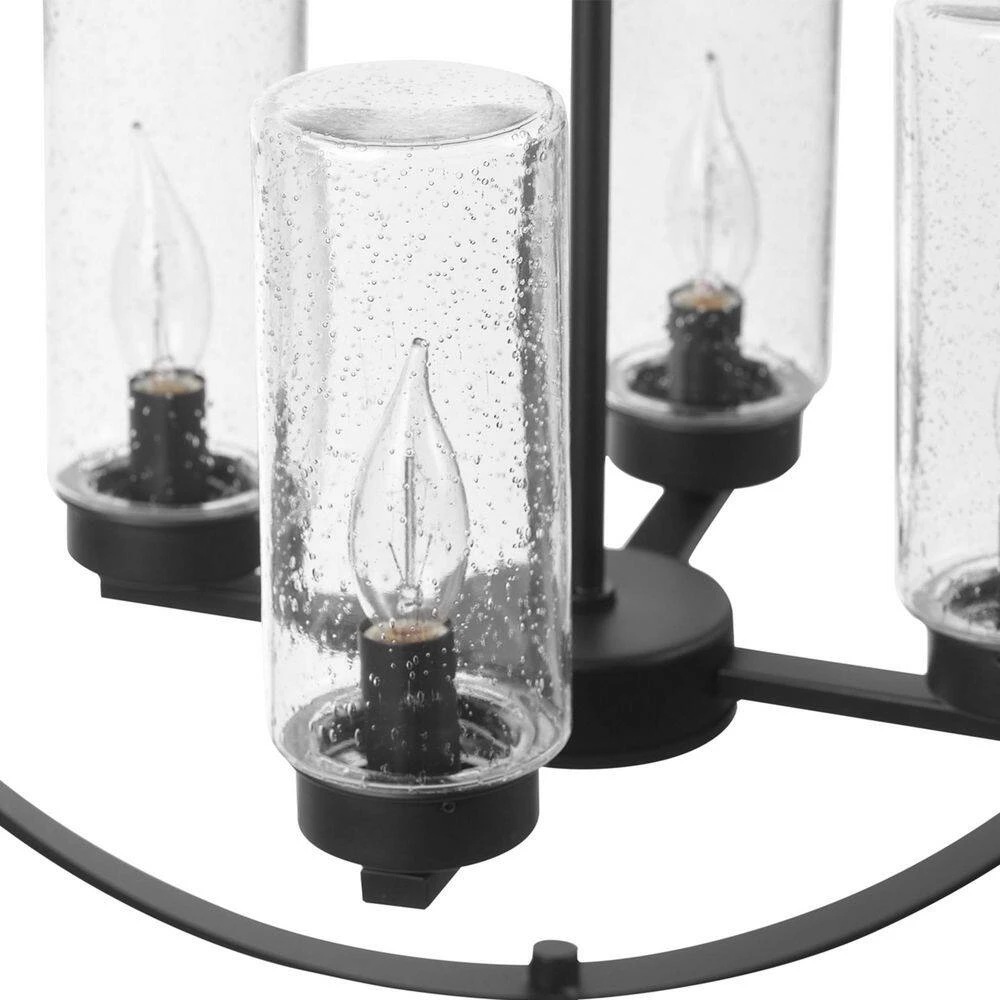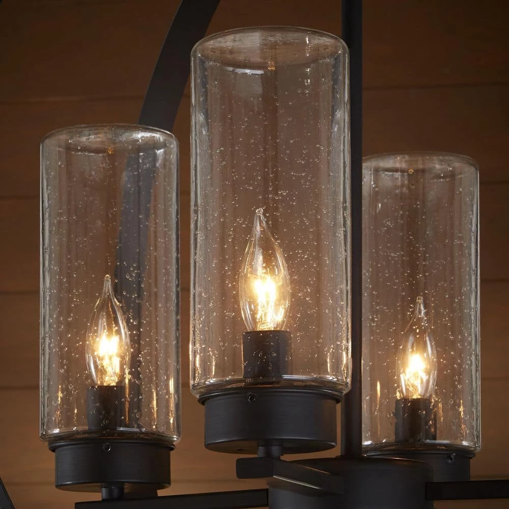 - TRANSITIONAL: a dark bronze finish, seeded glass shades and visually appealing frame work combine to create a transitional chandelier that compliments all decor styles